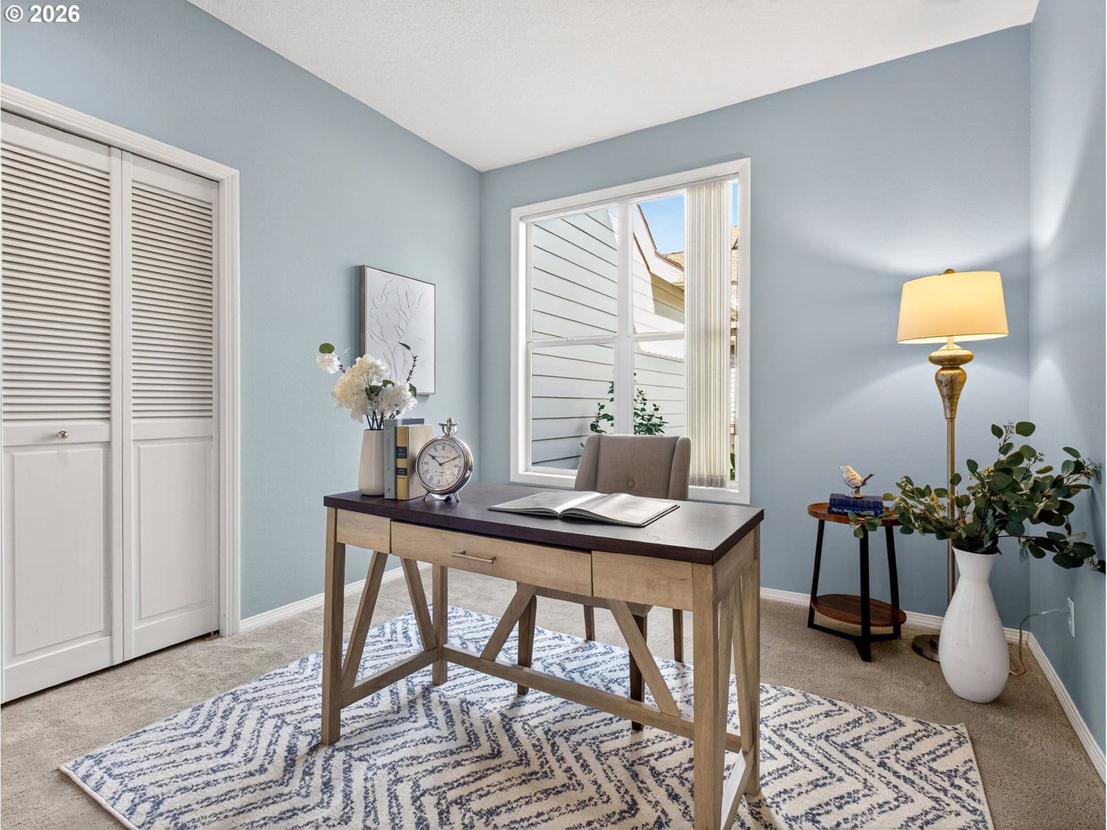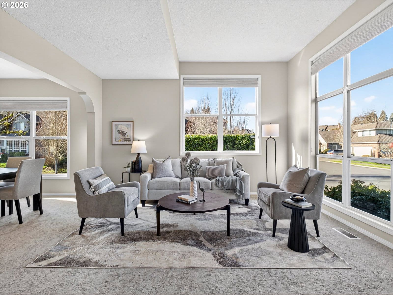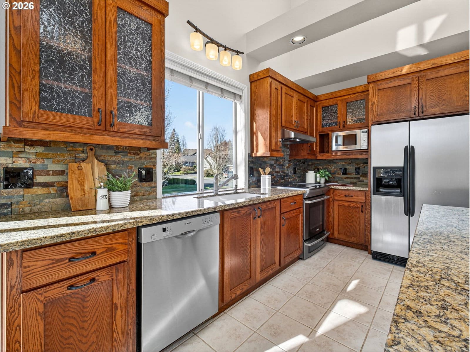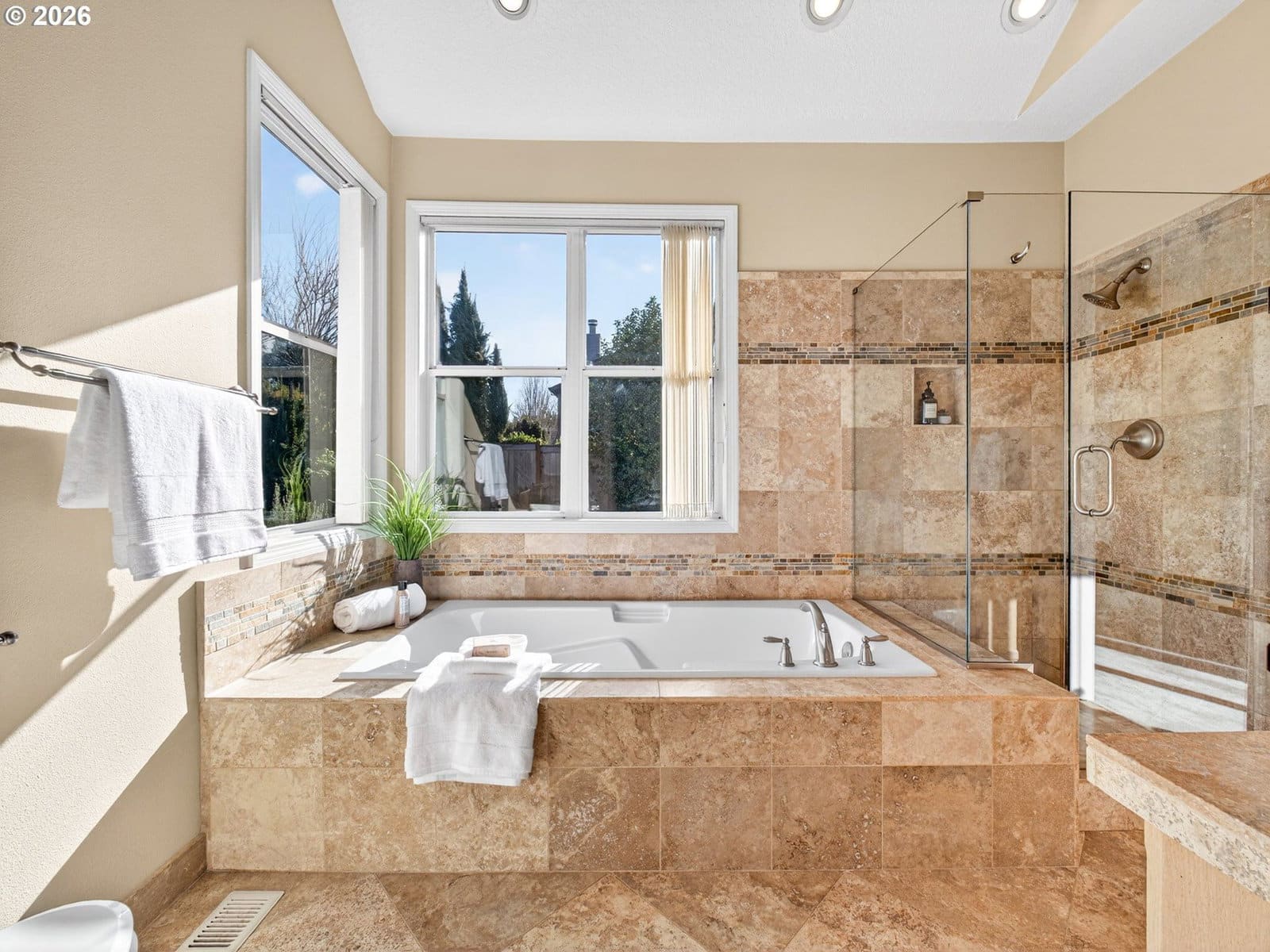 4 bdrm + den. Beautiful Fox Hill home w/main-level living features light-filled vaulted living spaces, large windows & skylights. Living room opens to formal dining room. Updated kitchen has slab granite countertops, ss applcs, soft close cabinetry, eating island & walk-in pantry. Sunny nook w/floor-to-ceiling windows & door to large patio. Family room has French doors, vaulted beamed ceiling, stone fireplace & built-ins. Main level primary suite has updated tiled bathroom w/dual sinks & soaking tub. Main level den w/French doors & nice size closet w/organizer. Versatile bonus room & den work well as additional bedrooms. Fenced backyard w/extended paver patio, grassy area & auto sprinklers. Oversized 3-car garage w/storage closet & 240V for EV Charging. Ring doorbell. Exterior paint (2023). Gas furnace & heat pump (2022). Located near Legacy Meridian Park Hospital, Browns Ferry & Atfalati parks, Tualatin Greenway Trail, Bridgeport Village, commuter transportation, and 1-5 & 1-205 freeways.