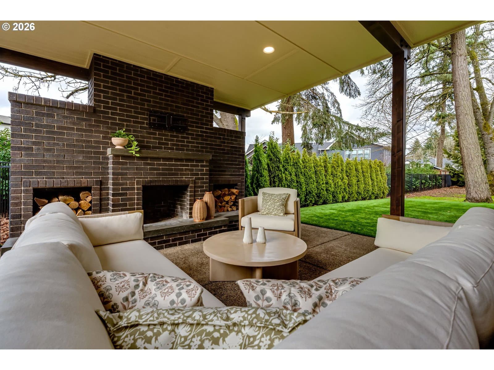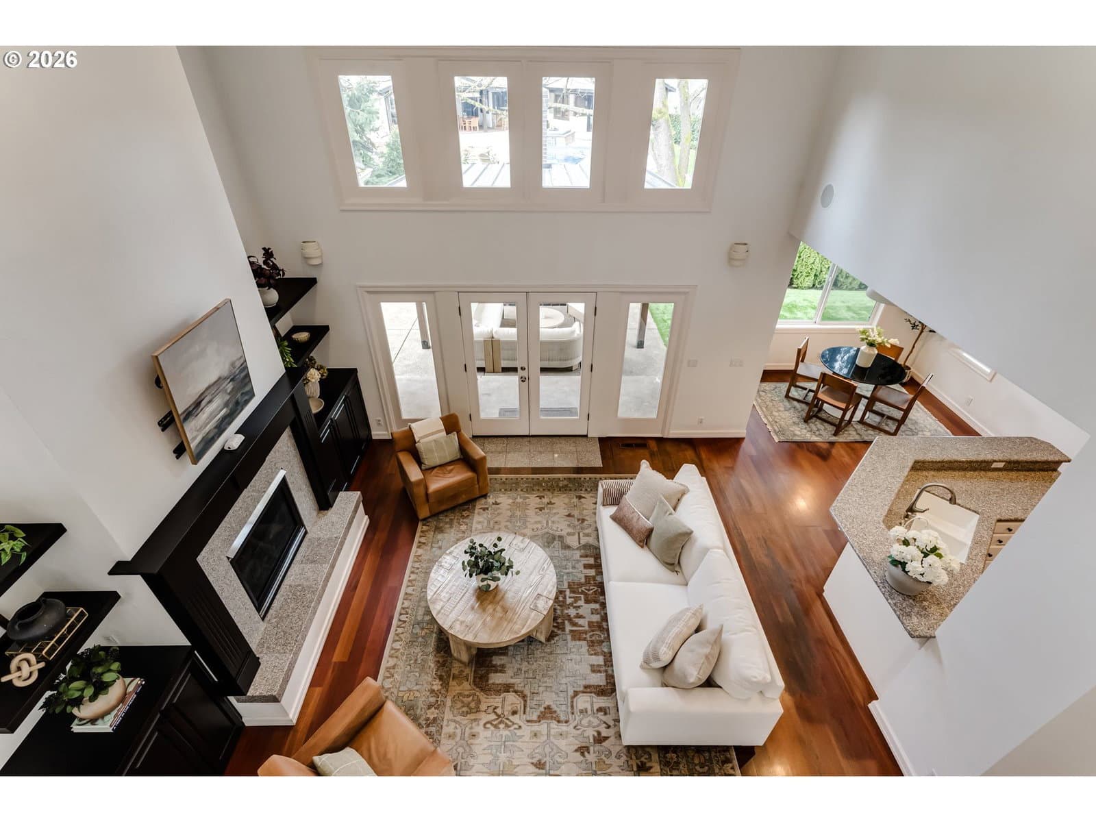 Warm and inviting beautifully designed home nestled in one of Eugene’s premier neighborhoods, perfectly tucked away in a private cul-de-sac. A stunning entry greets you with soaring ceilings, elegant arched doorways, rich Brazilian cherry floors, and a grand staircase leading to a bridge overlooking the living room below. Expansive upper windows flood the space with natural light, while a striking fireplace creates an atmosphere of comfort and sophistication. The kitchen is designed for both everyday living and upscale entertaining, featuring granite countertops, a spacious pantry, and an eating bar ideal for gathering with family and friends. Retreat to the main-level vaulted primary suite offering privacy and comfort. Step outside to the new covered patio with a built-in fireplace, overlooking a generous turf backyard perfect for year-round entertaining and low-maintenance living.All just a short walk to two parks, coffee shops, and local restaurants blending luxury, lifestyle, and location.