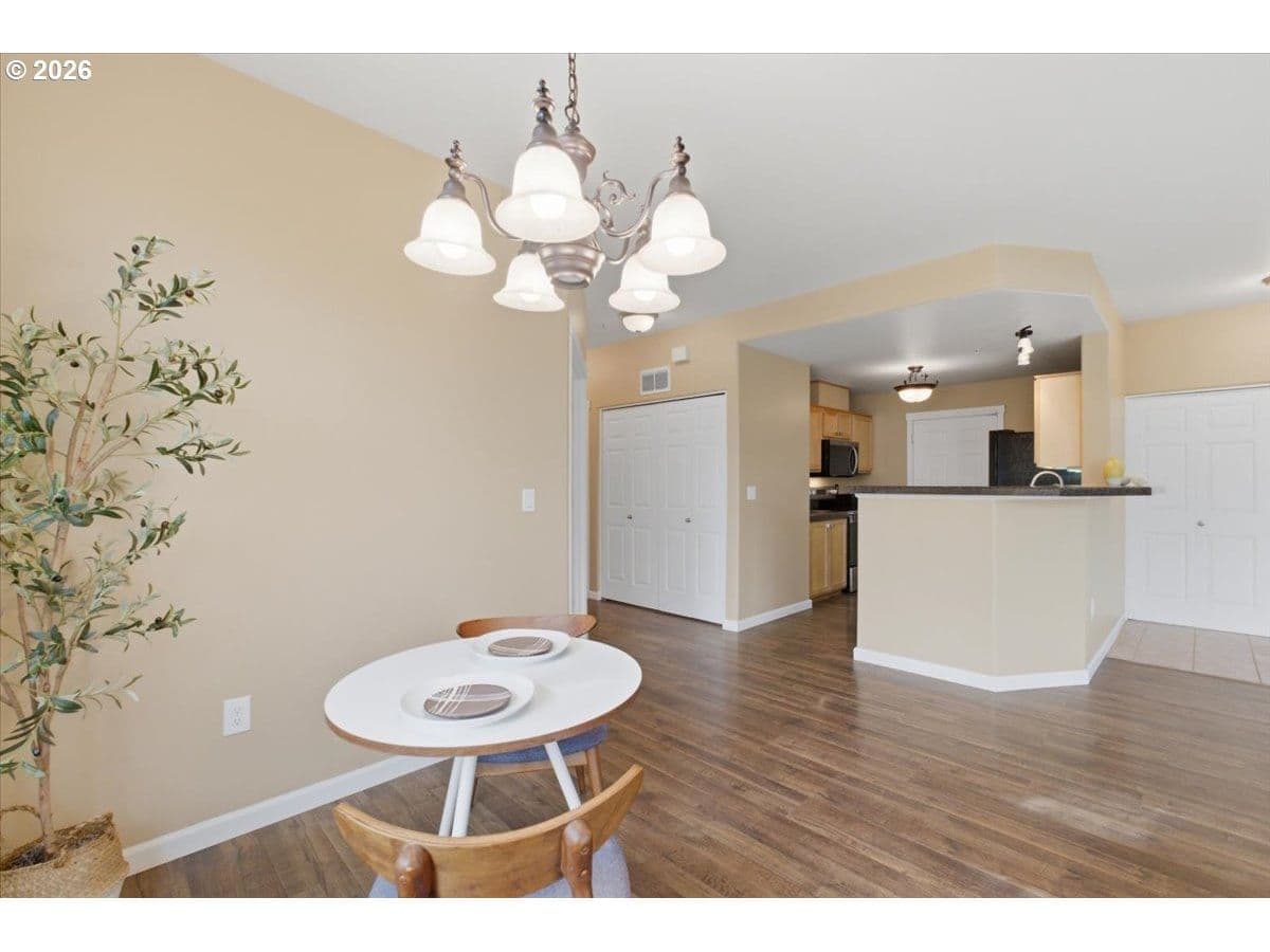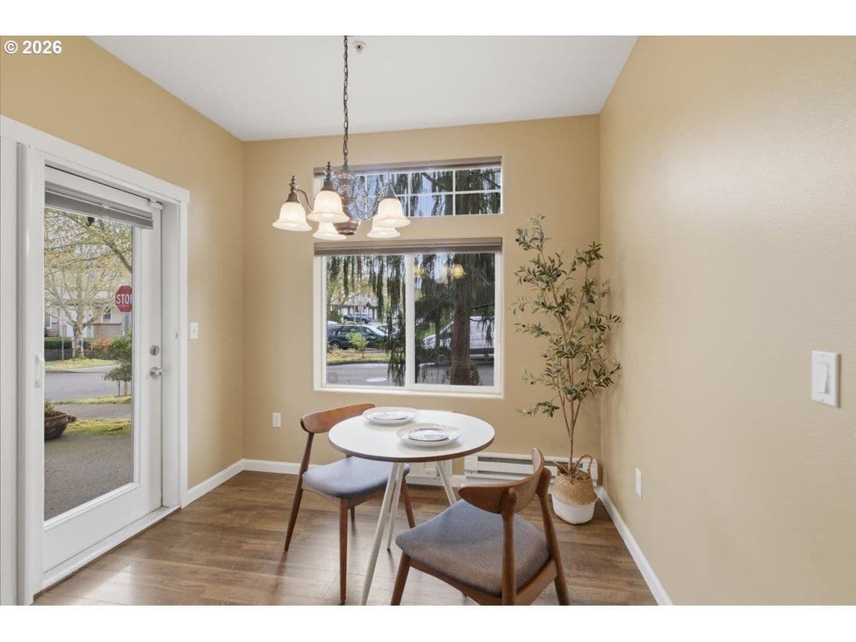 Gorgeous ground-level condo in Tanasbourne Place—no stairs with attached single car garage. Features include new carpet, new stainless steel appliances and new water heater, granite countertops, an extended eating bar, and hardwood floors. The bathroom has been upgraded with a wide, ADA-accessible walk-in shower. Enjoy added comfort with AC in both the living room and primary bedroom. Washer/Dryer and refrigerator are included in the sale. This end-unit home offers a charming private patio and convenient street parking. Ideally located just moments from Whole Foods, restaurants and shopping at Streets of Tanasbourne, with easy access to Magnolia Park—a beautiful 3-acre neighborhood space featuring picnic shelters, playground, interactive fountain, sports courts, and blooming magnolia trees in the spring. Schedule your showing today!