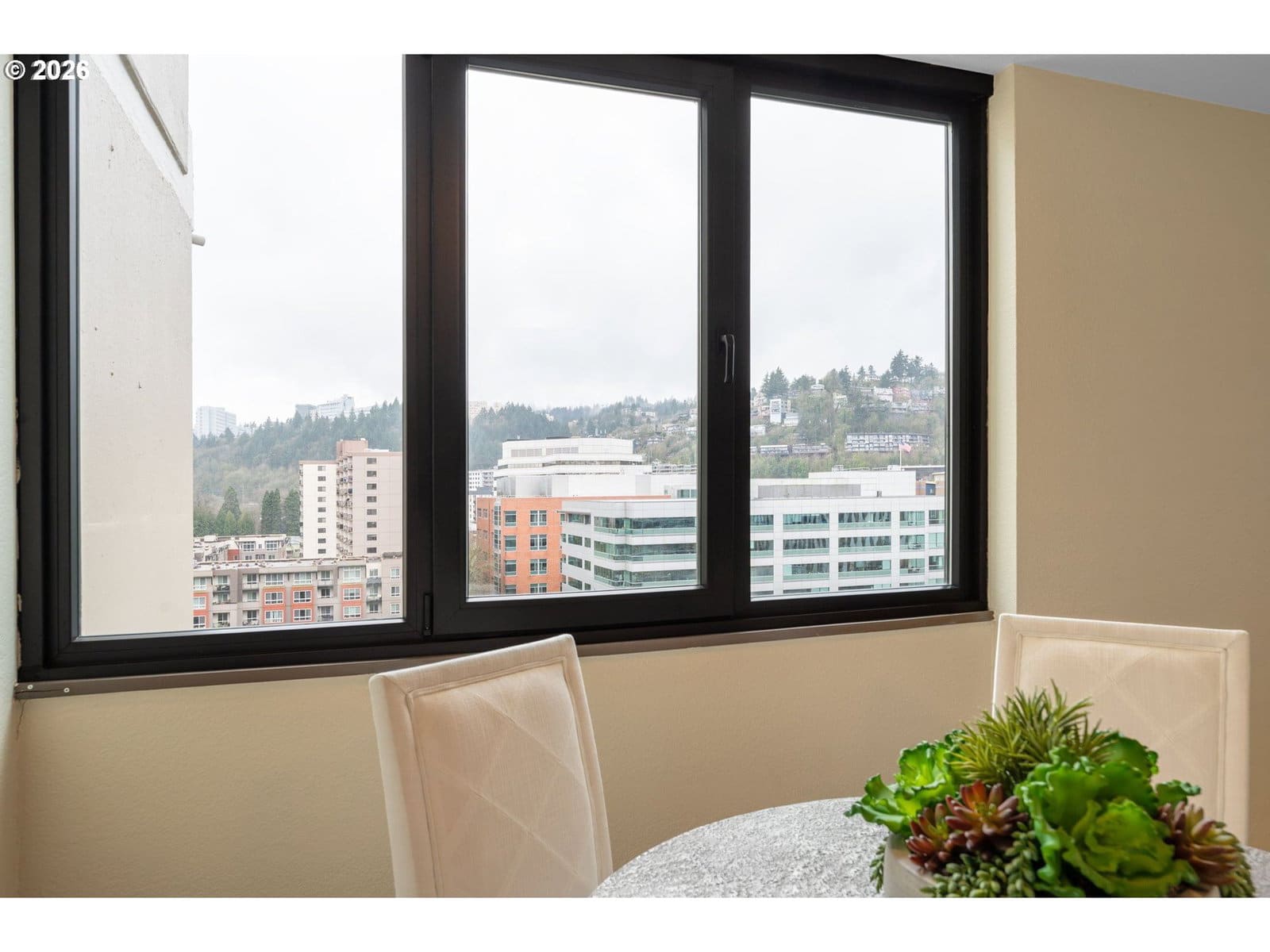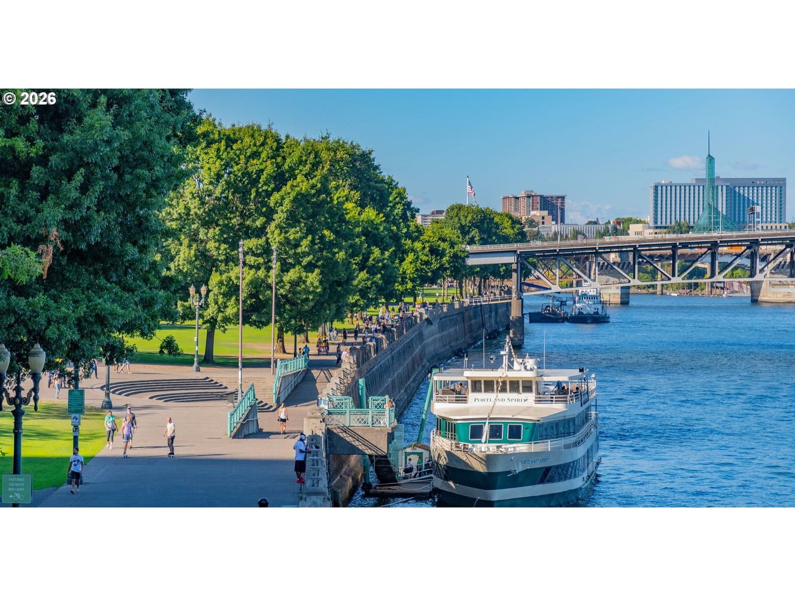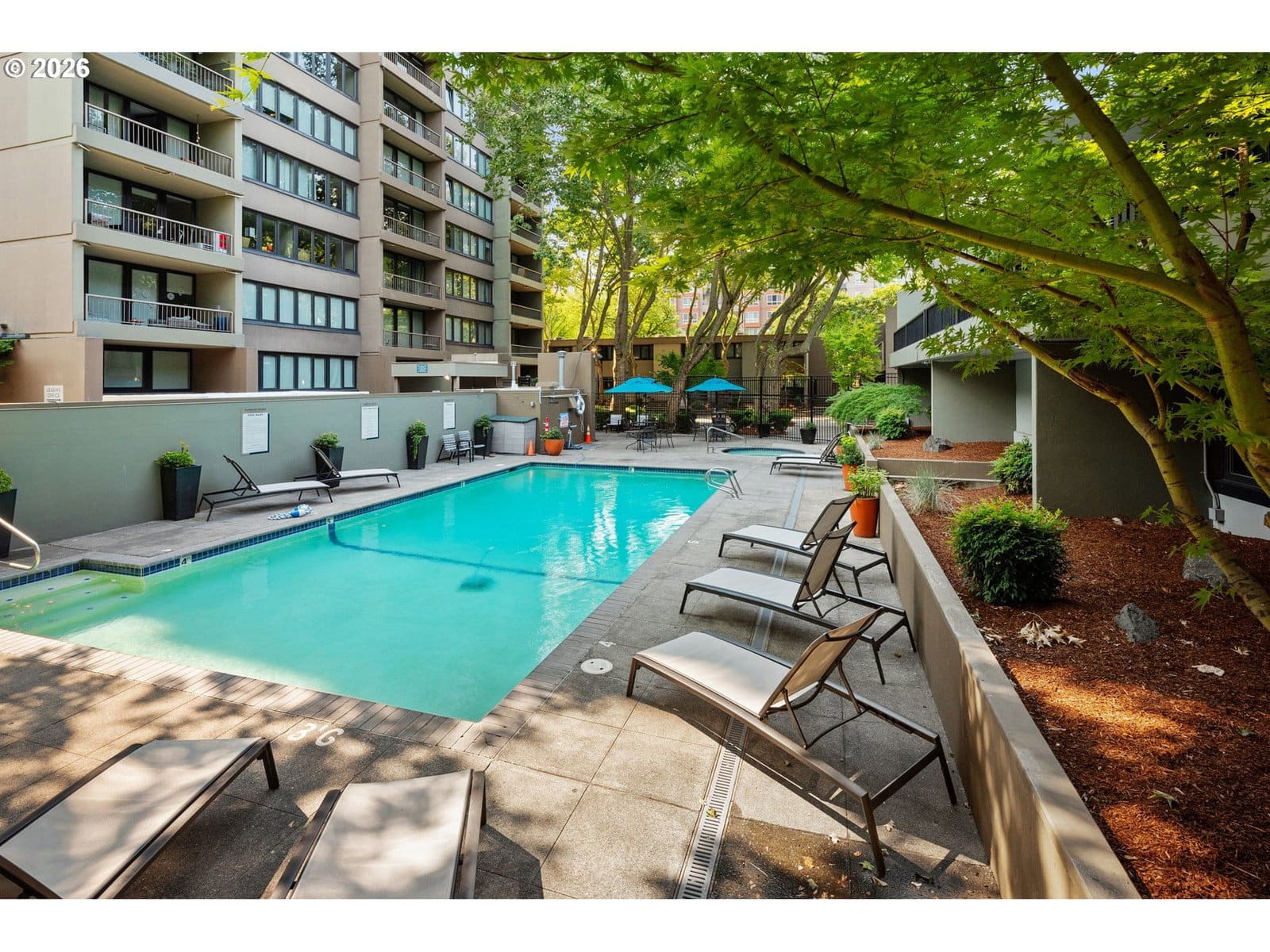 Rare opportunity to own a bright corner-unit condo in the heart of downtown Portland, featuring the largest one-bedroom floor plan in the building, abundant natural light, and beautiful city views. The inviting living room opens to a private deck, perfect for enjoying the skyline and fresh air. A sunny dining nook surrounded by windows flows easily into the efficient kitchen with stainless steel appliances. Down the hall, a spacious bedroom sits across from the bathroom featuring an updated vanity and shower/tub combo. Enjoy the comfort of AC, convenient one-level living, and easy elevator access. Residents of Harrison West enjoy a wide range of amenities including a gated courtyard garden, outdoor pool (one of the few in the area), hot tub/spa, sauna, outdoor fire pit, BBQ grill, community room, secured bike room, and a large on-site laundry facility with plenty of machines—no coins needed. The building also offers the convenience of an onsite manager and overnight security from 10pm–6am. Additional highlights include a deeded parking space in a prime location, secure storage, and no rental cap—offering excellent investment or rental potential. Part of the architecturally significant Portland Open Space Sequence, a landmark development that helped spark an urban design movement focused on integrating green space into city living. Located just steps from the Portland Streetcar and bus lines, with quick access to the waterfront, Portland State University, museums, and the popular weekly Farmers Market. Enjoy an easy walk to parks, shops, restaurants, and everyday conveniences. Low-maintenance, light-filled city living in a fantastic downtown Portland location.