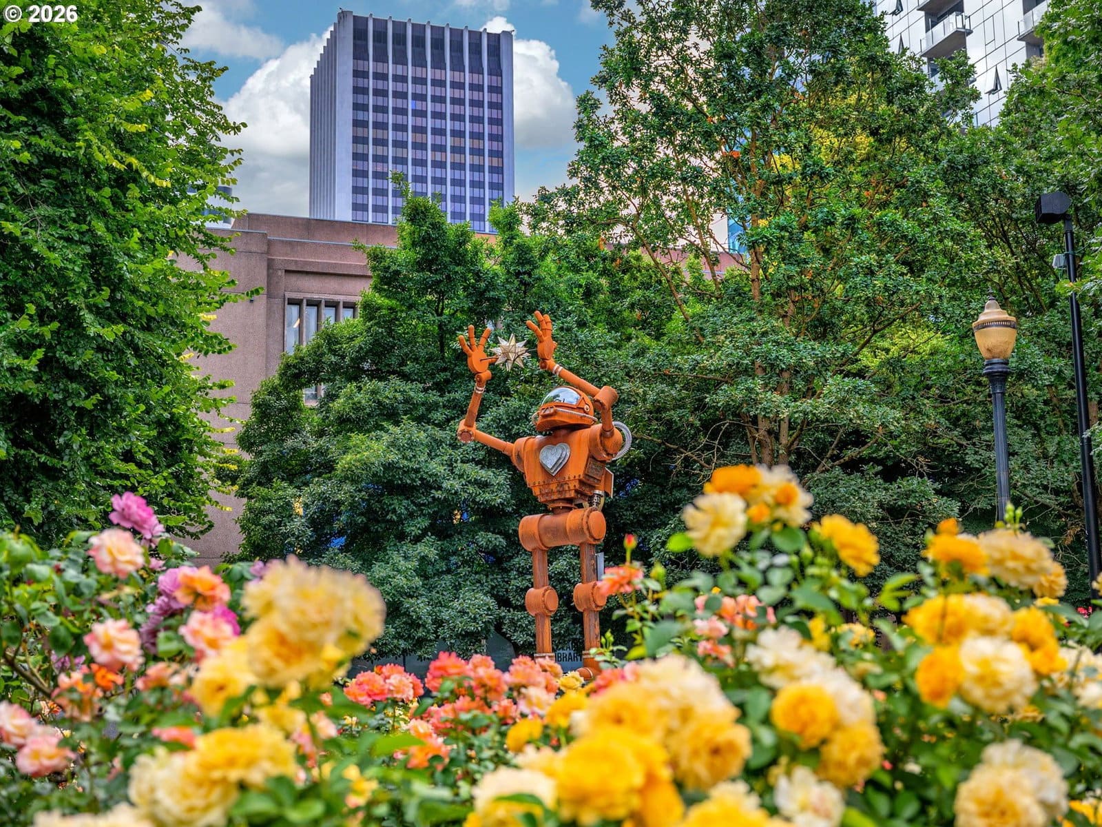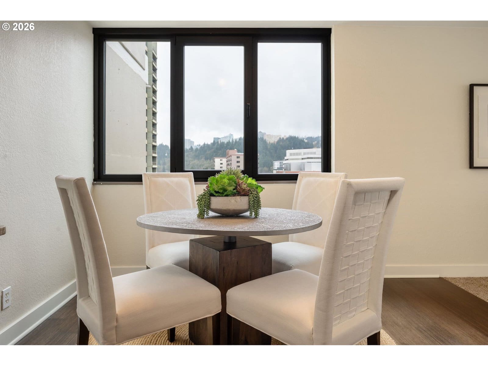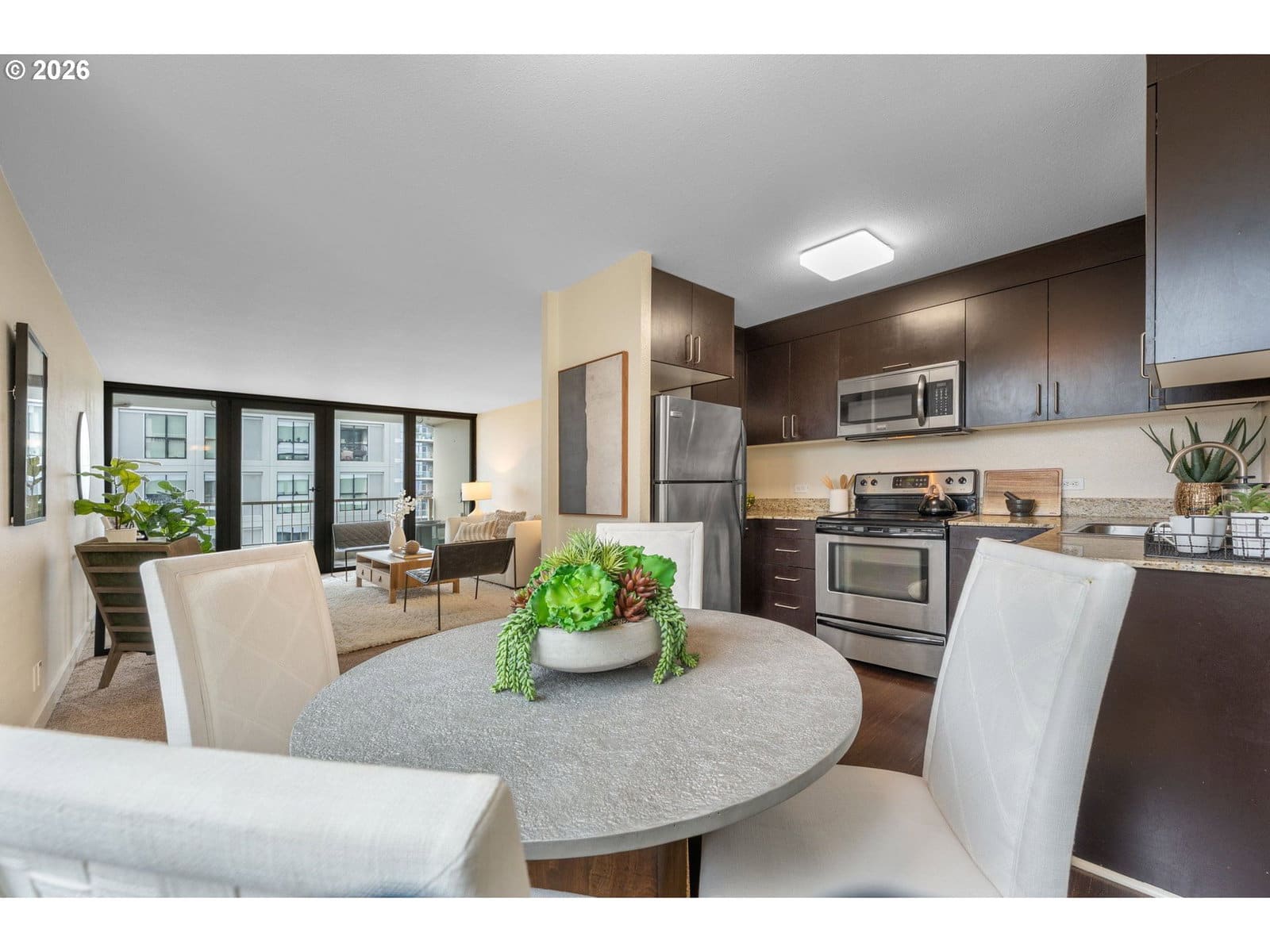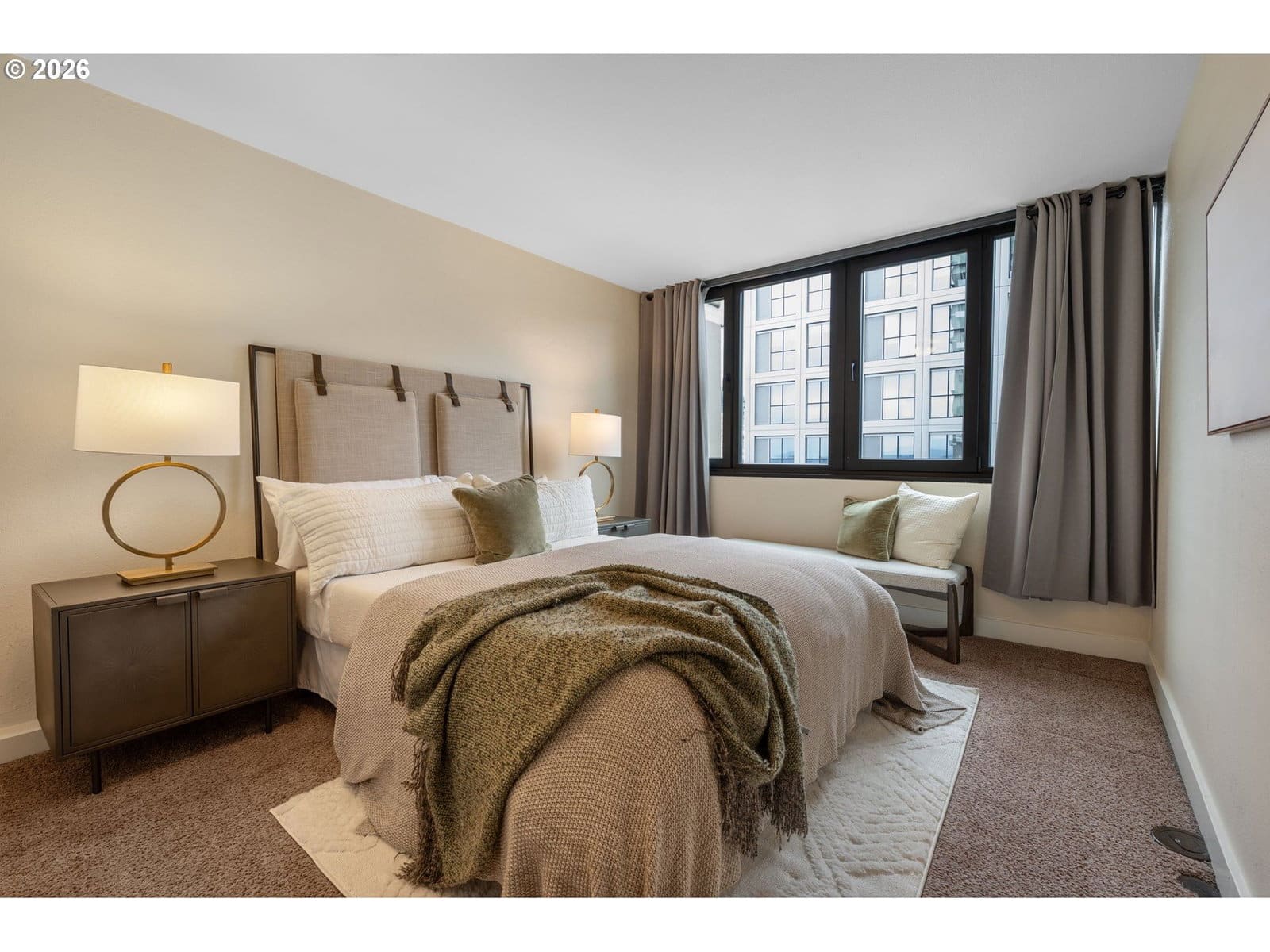 Rare opportunity to own a bright corner-unit condo in the heart of downtown Portland, featuring the largest one-bedroom floor plan in the building, abundant natural light, and beautiful city views. The inviting living room opens to a private deck, perfect for enjoying the skyline and fresh air. A sunny dining nook surrounded by windows flows easily into the efficient kitchen with stainless steel appliances. Down the hall, a spacious bedroom sits across from the bathroom featuring an updated vanity and shower/tub combo. Enjoy the comfort of AC, convenient one-level living, and easy elevator access. Residents of Harrison West enjoy a wide range of amenities including a gated courtyard garden, outdoor pool (one of the few in the area), hot tub/spa, sauna, outdoor fire pit, BBQ grill, community room, secured bike room, and a large on-site laundry facility with plenty of machines—no coins needed. The building also offers the convenience of an onsite manager and overnight security from 10pm–6am. Additional highlights include a deeded parking space in a prime location, secure storage, and no rental cap—offering excellent investment or rental potential. Part of the architecturally significant Portland Open Space Sequence, a landmark development that helped spark an urban design movement focused on integrating green space into city living. Located just steps from the Portland Streetcar and bus lines, with quick access to the waterfront, Portland State University, museums, and the popular weekly Farmers Market. Enjoy an easy walk to parks, shops, restaurants, and everyday conveniences. Low-maintenance, light-filled city living in a fantastic downtown Portland location.