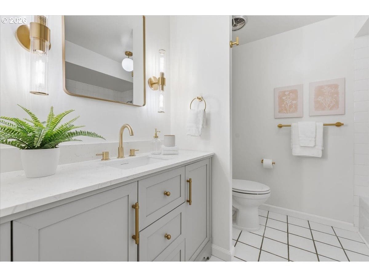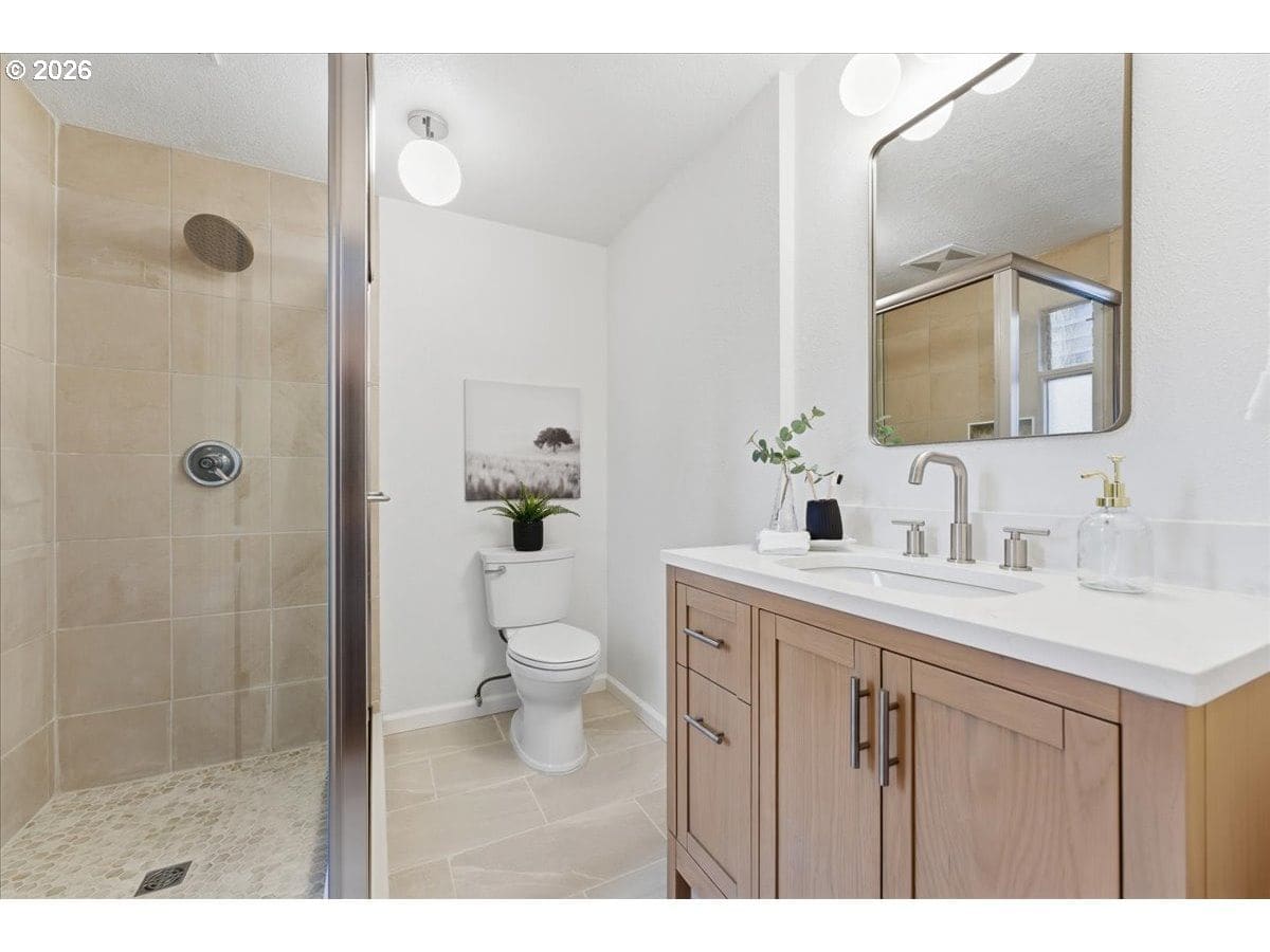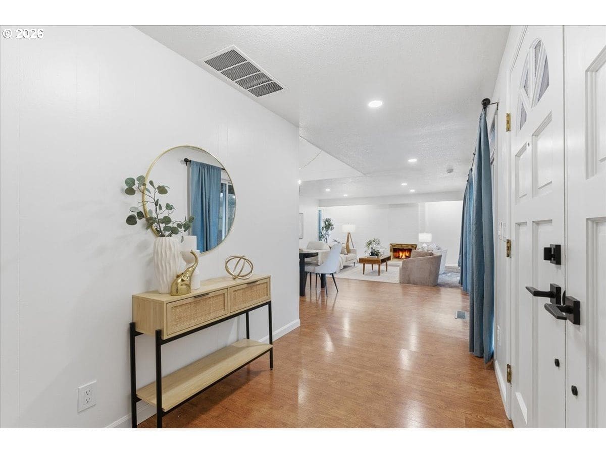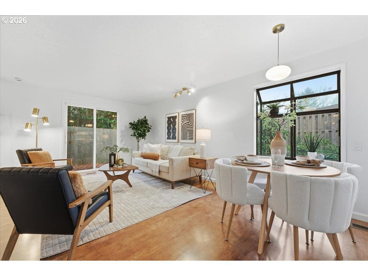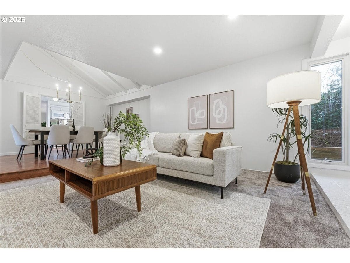 Mid-century charm meets modern updates in the coveted Four Seasons neighborhood. This rare one-level 1969 home welcomes you with a double-door entry, vaulted dining area, and a sunken living room with a white fireplace featuring a wall-to-wall mantle and soft backlighting. Walls of windows fill the home with natural light and the kind of character you simply can't find often. The kitchen offers tiled countertops, gold accents, and a pass-through to the pop-out breakfast nook window perfect for greenery. Just beyond, a cozy family room opens to the brick patio. The spacious primary suite includes mirrored closet doors and a recently updated bathroom with a tiled walk-in shower. Two additional bedrooms and a modernized hall bath round out the thoughtfully designed single-level layout. Major improvements make this home truly move-in ready, including a new $50K roof with 30-year warranty, new gutter guards, a new composite front deck, fresh interior paint, new microwave, and updated bathroom vanities, faucets, and lighting. Low-maintenance bark-dust landscaping and mature trees let the architecture shine. Enjoy a peaceful HOA setting with trees, creeks, a clubhouse, and pool, all just minutes from Cedar Hills Crossing with shopping and eateries, downtown Beaverton, Nike, and Hwy 217.