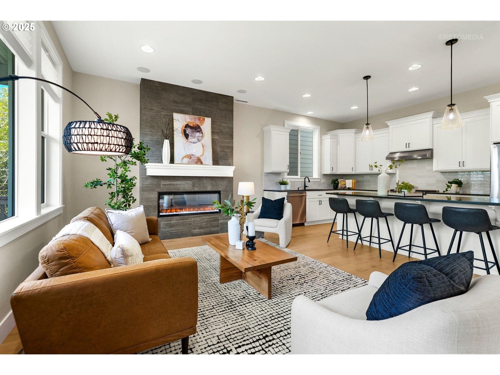 This gorgeous like-new home sits at the end of the street on one of the community’s largest lots, backing to protected green space for ultimate privacy and serene views. With 4 bedrooms (plus bonus room), 3.5 bathrooms, and modern touches throughout, this home combines timeless style with contemporary convenience.The main level features an open-concept layout connecting the living room, dining area, and chef’s kitchen. The living room showcases an elegant electric fireplace, while the kitchen is a chef’s dream with Bosch stainless steel appliances, quartz countertops, and a large island for casual dining or entertaining. Engineered hardwood flows throughout, and a versatile bonus room serves as a home office, fifth bedroom, or playroom. Step onto the deck and enjoy the peaceful backdrop of the lush green space. Upstairs, the primary suite is a private retreat with spa-like bath, large walk-in closet, and serene views. Two additional bedrooms, another full bath, and a convenient laundry room complete the upper level. The lower level offers a spacious family room, bedroom, full bath, and exterior access, making it perfect for guests or multi-generational living. Modern upgrades include a tankless water heater and an electric car charger in the garage, combining style with today’s lifestyle needs. Outside, the covered patio and fully fenced yard provide space for entertaining, gardening, or simply enjoying the natural surroundings. Located near top-rated schools, parks, trails, shopping, dining, and major employers, this home blends modern living with a serene, private setting.