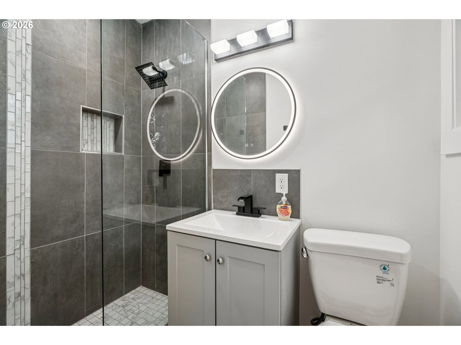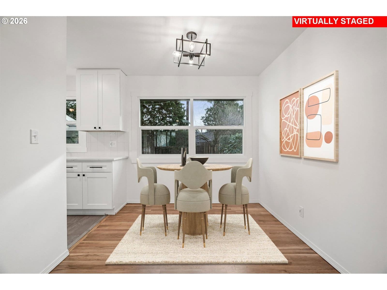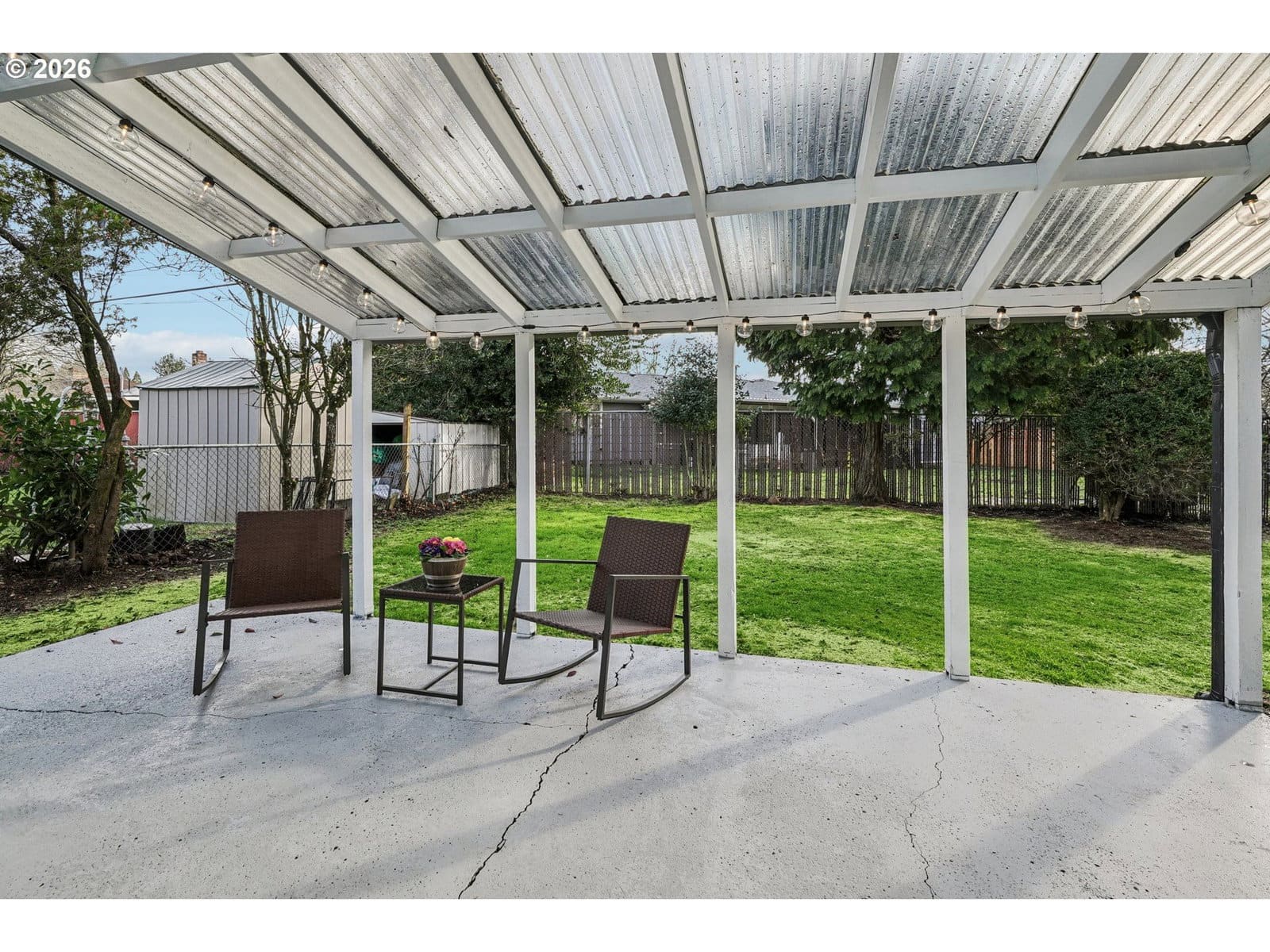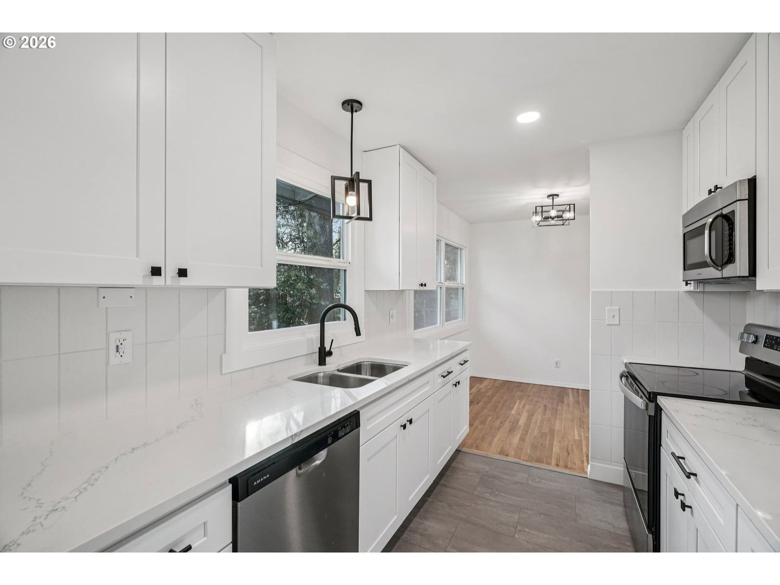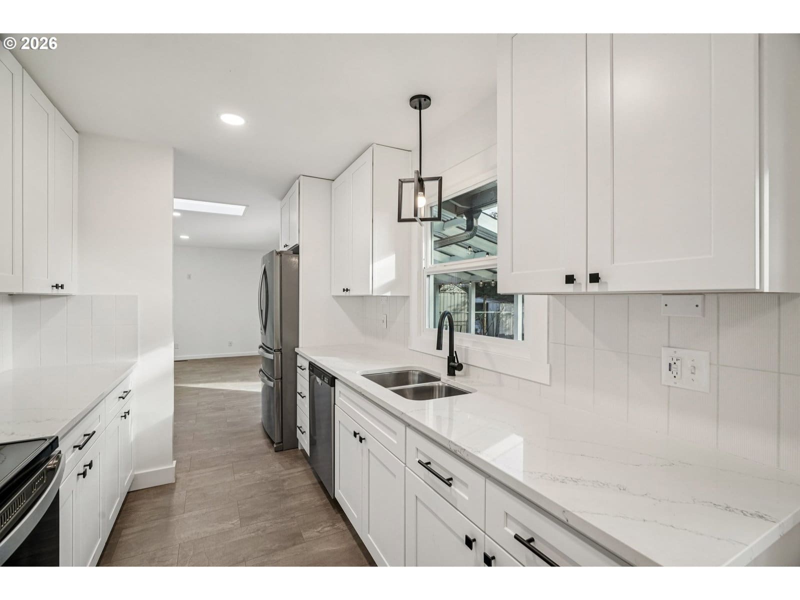 Fully updated and move-in ready one-level ranch home on a quiet neighborhood street! New kitchen boasts ceiling height white shaker cabinets, stainless steel appliances, quartz counters and Designer Grade tile backsplash. New windows, new light fixtures, and new LED can lights throughout the house give tons of light, combined with skylights in the living and family rooms. New Luxury Vinyl Plank flooring in the kitchen, family room and both bathrooms, and newly refinished oak hardwoods through the rest of the house. Electrical updates include new panel, mast, EV charger, and more. Both bathrooms fully remodeled, with a custom tile walk-in shower in the primary bedroom. Enjoy peace of mind with a newer gas water heater and a new in 2023 gas furnace. Two fireplaces - a gas fireplace in the living room, and a wood burning fireplace in the family room. Head outside onto the large covered back patio to enjoy the spacious fenced yard. LeafGuard gutters. So much care and attention to detail throughout - like the designer backlit mirrors - this one is a must see! [Home Energy Score = 5. HES Report at https://rpt.greenbuildingregistry.com/hes/OR10245097]