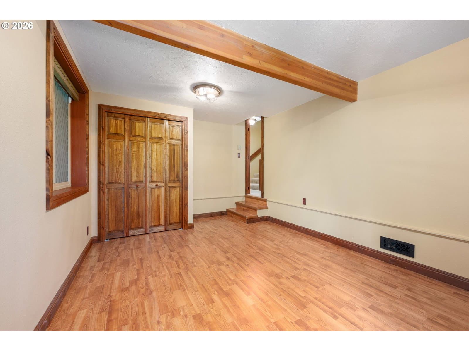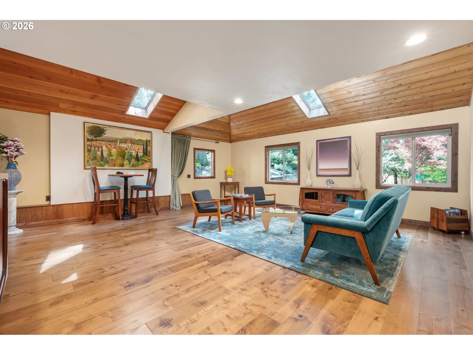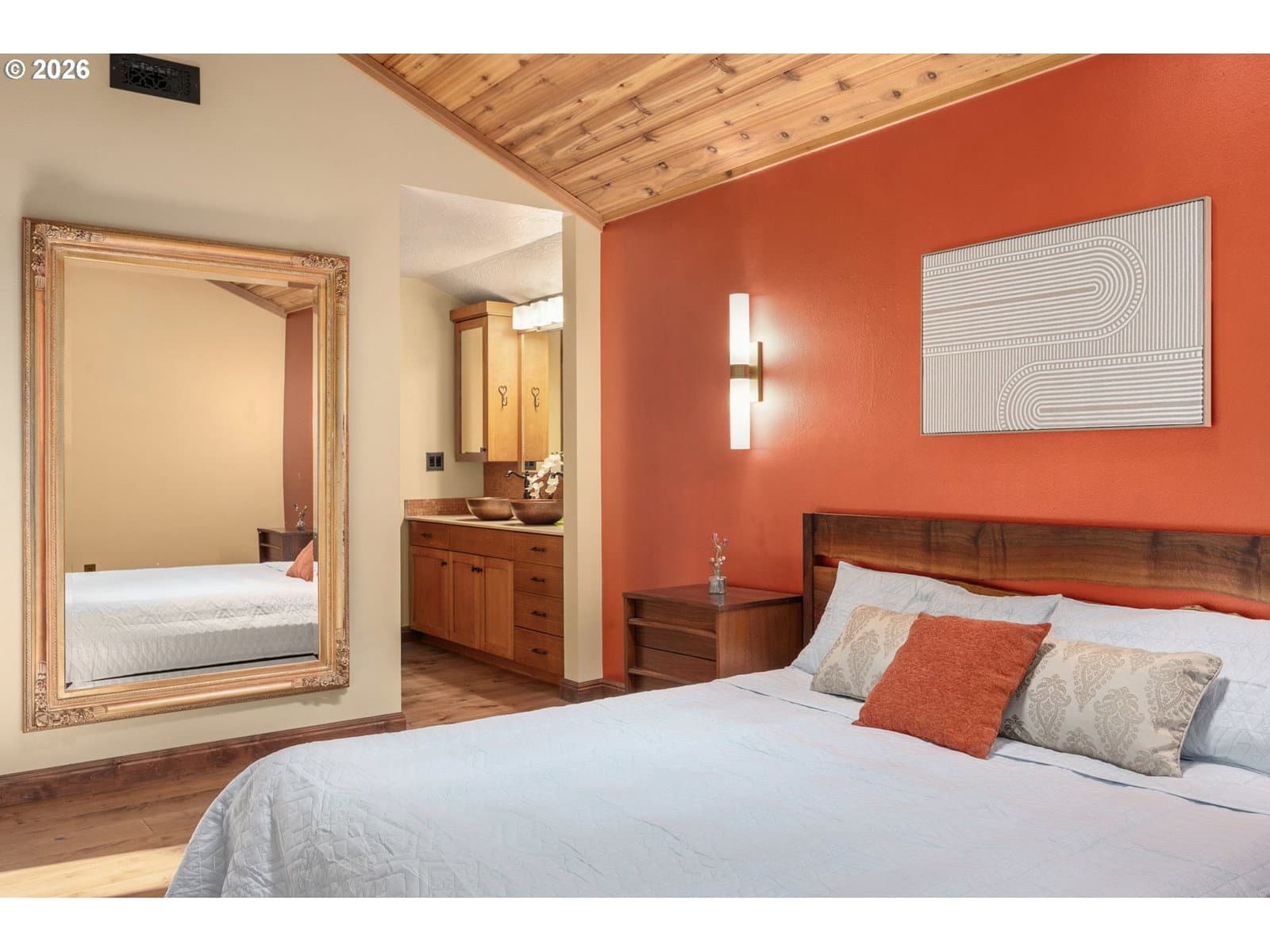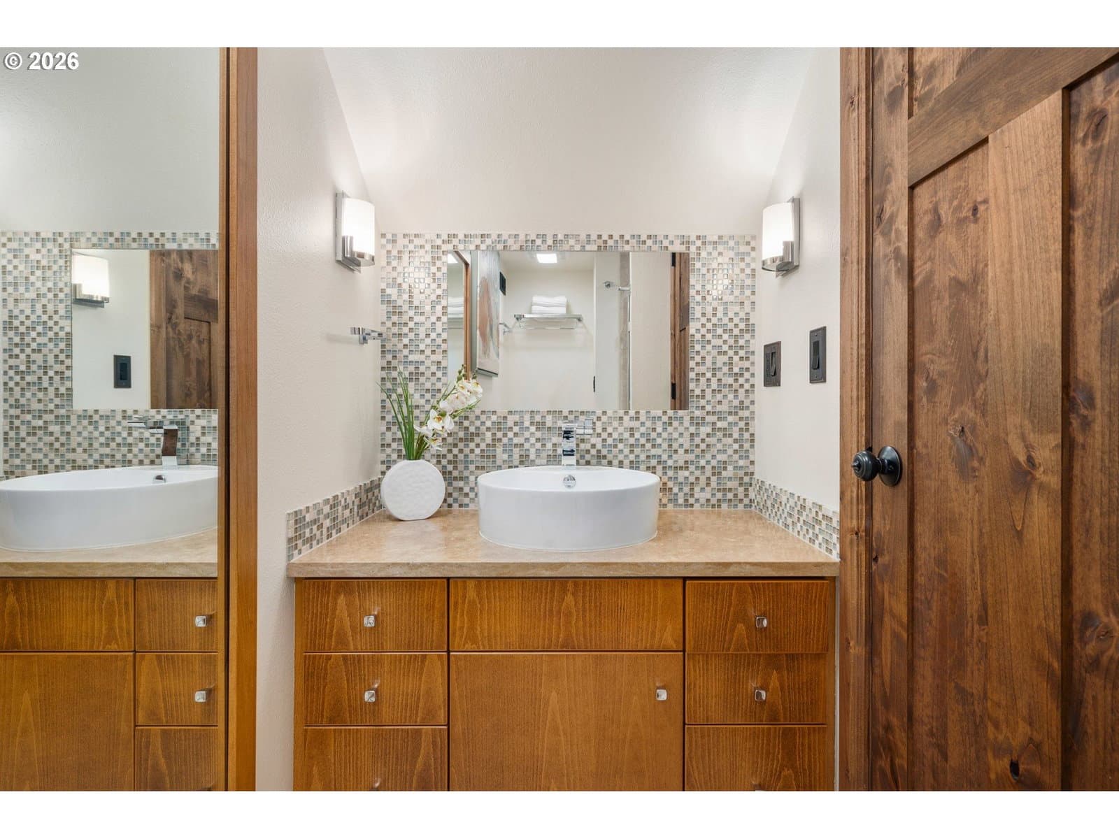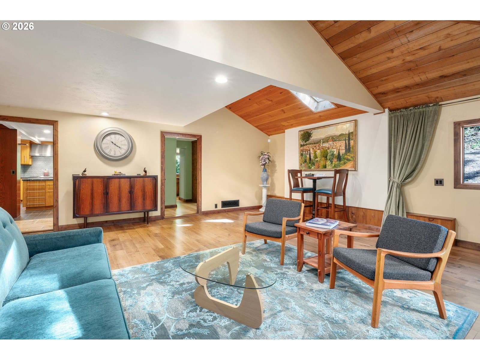 Set on a wooded acre off of Spring Blvd in southeast Eugene, this property immerses you in private wooded setting, and then surprises and delights with luxurious finishes and obvious care throughout every space. The entry sets the tone with Italian Luna travertine and wood-clad vaulted ceilings, opening naturally into the main living spaces, which is anchored by a Napoleon wood stove for heat, and a wood burning fireplace for ambiance. The kitchen balances function and presence with imported Italian porcelain tile, a commercial-grade BlueStar gas range, custom bamboo cabinetry, granite counters, and a large island. The primary suite is generous in scale, with double walk-in closets and vaulted wood ceilings adding warmth without excess. In addition it has a primary bathroom that reads more like a personal spa. An oversized travertine shower with marine varnished cedar ceiling and a cast iron clawfoot tub create a beautiful contrast in texture and tone. Solid travertine counters, paneled accent wall and double copper sinks continue that layered, high end material approach. Throughout the home: maple engineered hardwoods from South America, hand-stained knotty alder doors and trim, updated outlets and dimmers with polished brass covers, and fresh interior paint. Outdoor living is equally considered with expansive Trex decking with a designer metal railing and a covered outdoor kitchen featuring granite counters, a Blaze Professional natural gas BBQ and a built in Green Egg. A finished bonus room above the garage with its own ductless heat pump, new carpet, and built-in desk adds flexibility for work, guests, or separation of space when needed. Major updates include roof (2023), tankless water heater and HVAC (2021), vinyl windows (2021), exterior paint (2020), and new fencing (2025). Don't miss this property where setting, materials, and updates come together in a way that feels intentional and lasting.