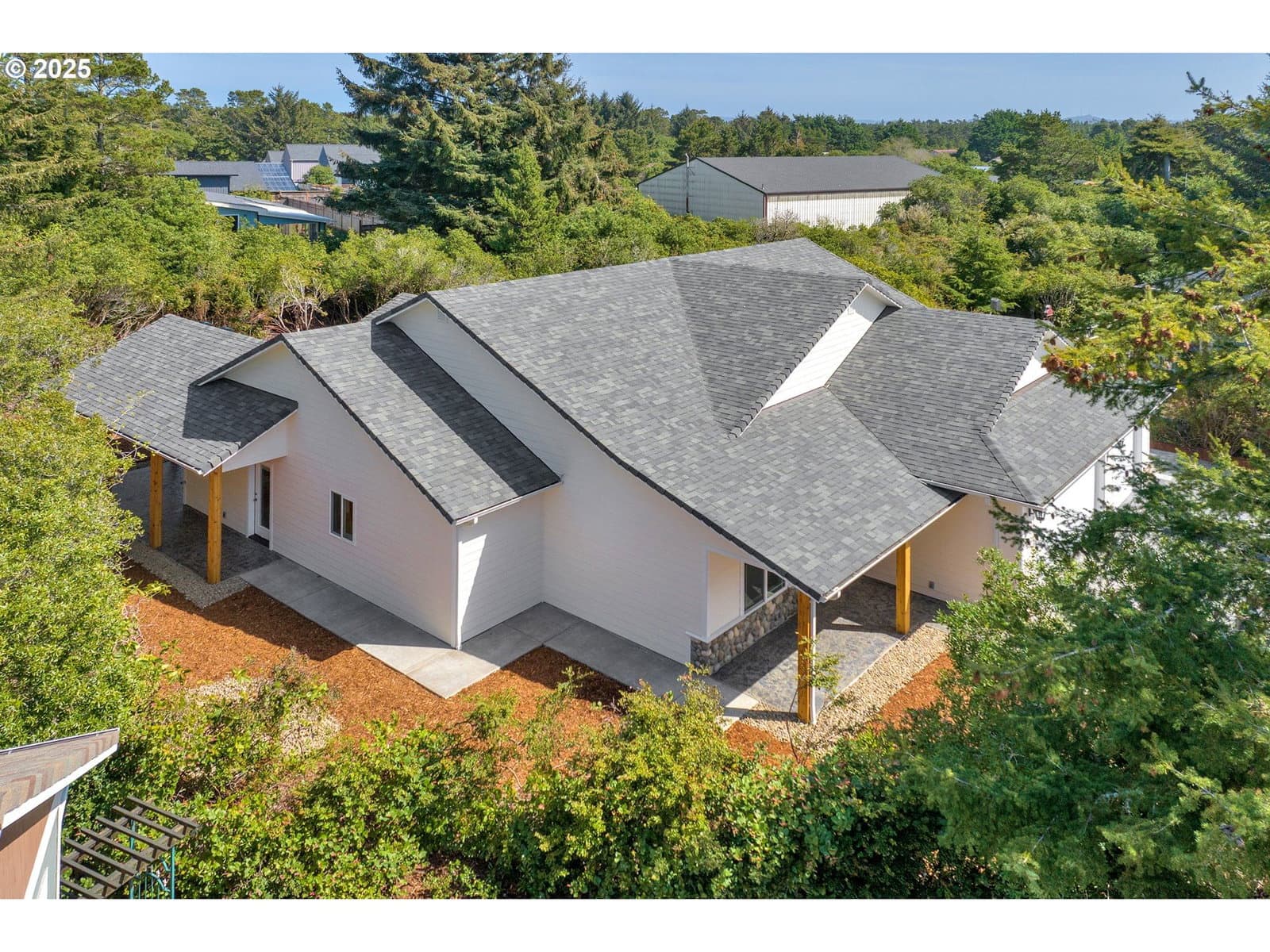 New construction in Shelter Cove. 2,120 sf, 3-Bedrooms, 2-Bathrooms with an oversized 3-car garage, and the addition of a RV/boat parking pad on 0.43 acre. The builder carefully designed the home with an element of separation and elegance. No open living concept. The foyer is open and grand setting the stage of the efficient layout. Finishes of include coffered ceilings, LVP and tiled flooring and glass like painted trims. 11ft ceilings accented with coffered ceilings in the dining and foyer. The versatility of the 3rd bed/office/library is accessible by bay doors for added privacy with separation from main living area. The oversized open kitchen will please the most particular chef with an open spacious walking area, 9’ ceilings, ample countertop area, painted cabinets with soft close drawers and a large walk-in kitchen pantry with a 2nd separated pantry included for appliance storage. En-suite offers dual sinks, a very large linen closet with a tiled zero step walk-in shower for ease. The oversized garage is finished with painted and textured sheetrock. Entertain or relax on the oversized wrapped covered concrete patio finished with stained wrapped beams and tongue and groove sealed blue pine ceilings. Enjoy the Oregon Coast sandy beach of the Siuslaw River/North Jetty by a maintained deeded access offered to Shelter Cove residents, conveniently located across the street! Shelter Cove is a gated residential community in Florence, Oregon known for its well maintained homes, mature landscaping and peaceful coastal setting.