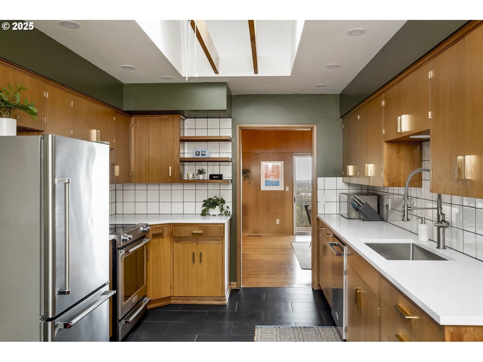 Mid-Century Made Modern! With a view that transcends any era, spanning from Downtown Portland to Mt. St. Helens. All the right bits remain from this 1961 Mt. Tabor Classic, including rich hardwood floors, wood cabinetry, huge view windows, tongue & groove vaulted ceilings, 2 fireplaces, indoor grill and built-ins. Fast forward to 2025: The home now enjoys a new roof, gutters, furnace, air conditioning, insulation, interior/exterior paint, chimney work, new plumbing, electrical panel and wiring improvements. Both bathrooms have been remodeled with quartz counters, fresh tile, and high end fixtures. The kitchen remod has been brilliantly executed, maintaining the mid-century feel, while showing off its stunning quartz counters, tile flooring, backsplash, new appliances and Rejuvenation hardware. Multiple sliding doors from living & dining lead to a full length upper level deck with the knock your socks off view. Lower level brings versatility, with flex space suited to be a huge primary suite, bathed in those same territorial views, or the coolest of entertaining hang out spaces. Drop down to the oasis style backyard retreat, where the rest of the world melts away. Lots of off street parking, attached garage, and workshop space downstairs to boot. Max, close. Transit, close. Tabor, Montavilla, it's all right at hand. Glencoe Elementary and Tabor Middle feed into Franklin High School.