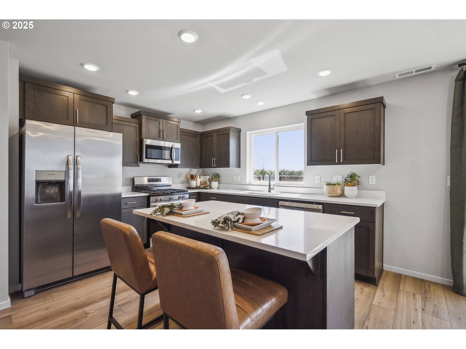 Welcome to this stunning two-story home in the desirable Smith Creek community of Woodburn, Oregon! The main level features an open-concept layout that seamlessly connects the kitchen, dining, and great room to a private outdoor patio—perfect for entertaining or relaxing. Upstairs, enjoy a versatile loft, three spacious secondary bedrooms, and a luxurious owner’s suite with a walk-in closet and spa-inspired bathroom featuring quartz countertops, dual sinks, and a glass-enclosed shower.The chef’s kitchen is equipped with stainless steel appliances, including a slide-in gas range, refrigerator, microwave, and dishwasher. Shaker-style cabinetry with crown molding, quartz countertops, LED lighting, and a Moen pull-down faucet add timeless elegance. Located in the sought-after Smith Creek neighborhood, residents enjoy parks, walking trails, picnic areas, a basketball court, playground, and dog park, all just minutes from the Woodburn Premium Outlets, local schools, and I-5 access. This beautiful home combines modern comfort, energy efficiency, and community living—ready for you to move in and make it your own!