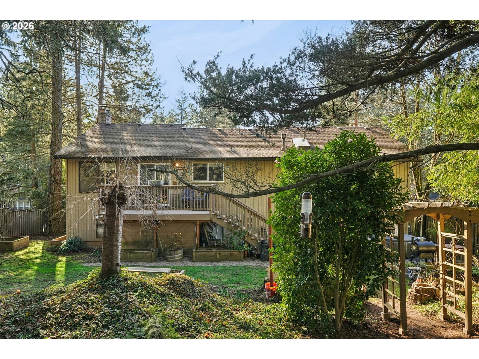 Welcome to this beautifully maintained, not-your-average-split-level home in the desirable Mt. Scott area of Happy Valley! Nestled among mature trees, this property offers a peaceful, park-like setting with a large backyard perfect for relaxing or entertaining. Inside, you’ll find a bright and inviting layout featuring hardwood floors, granite surfaces, stainless steel appliances, and energy-efficient upgrades throughout. Wood-burning fireplaces on both levels add warmth and just the right amount of a cozy vibe, complemented by central air and efficient forced-air heating for year-round comfort. The spacious floor plan includes multiple living areas - could be great for multi-generational living - and generous bedrooms with large closets and ceiling fans. The newly remodeled downstairs bathroom comes complete with a no-threshold shower. Step outside to a fenced yard with a deck and patio ideal for gatherings. The attached extra-deep garage includes an EV plug, and don't miss the abundant storage space under the stairs. Located in a quiet and serene community with HOA maintained nature trails, yet easy access to shopping, Kaiser Hospital, and I-205. This home blends comfort, style, and functionality in a beautiful natural setting.