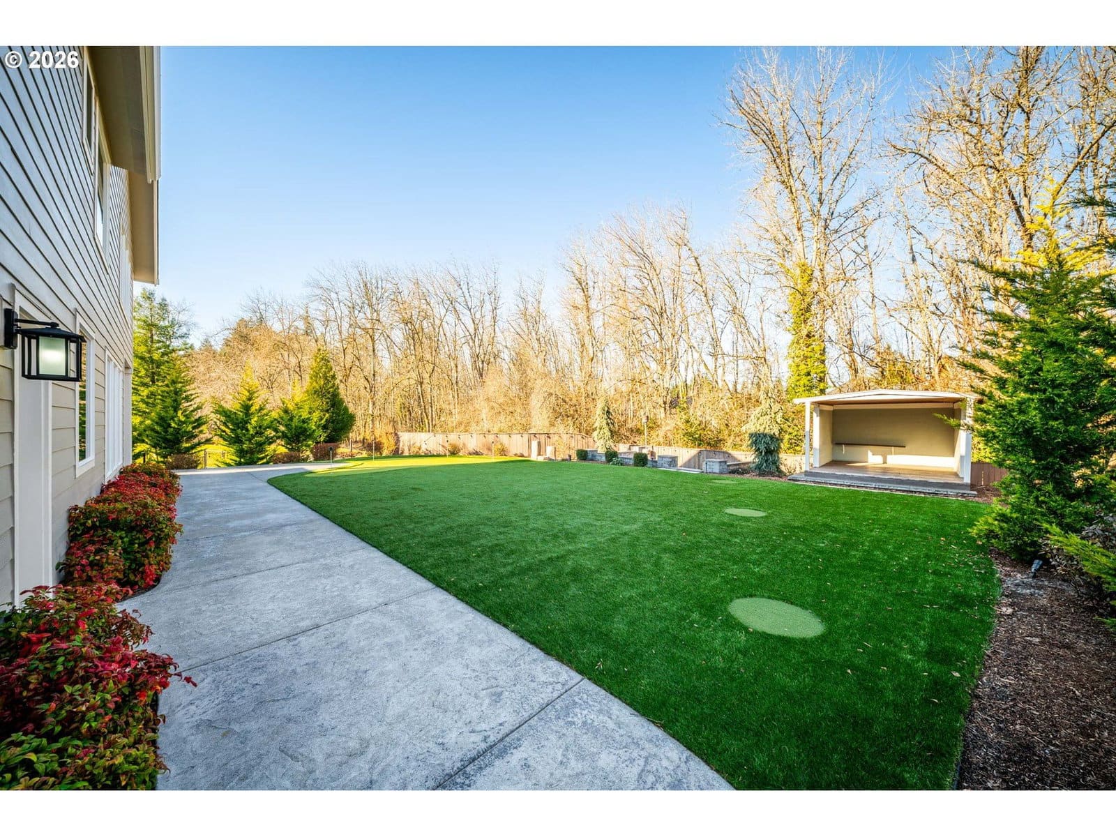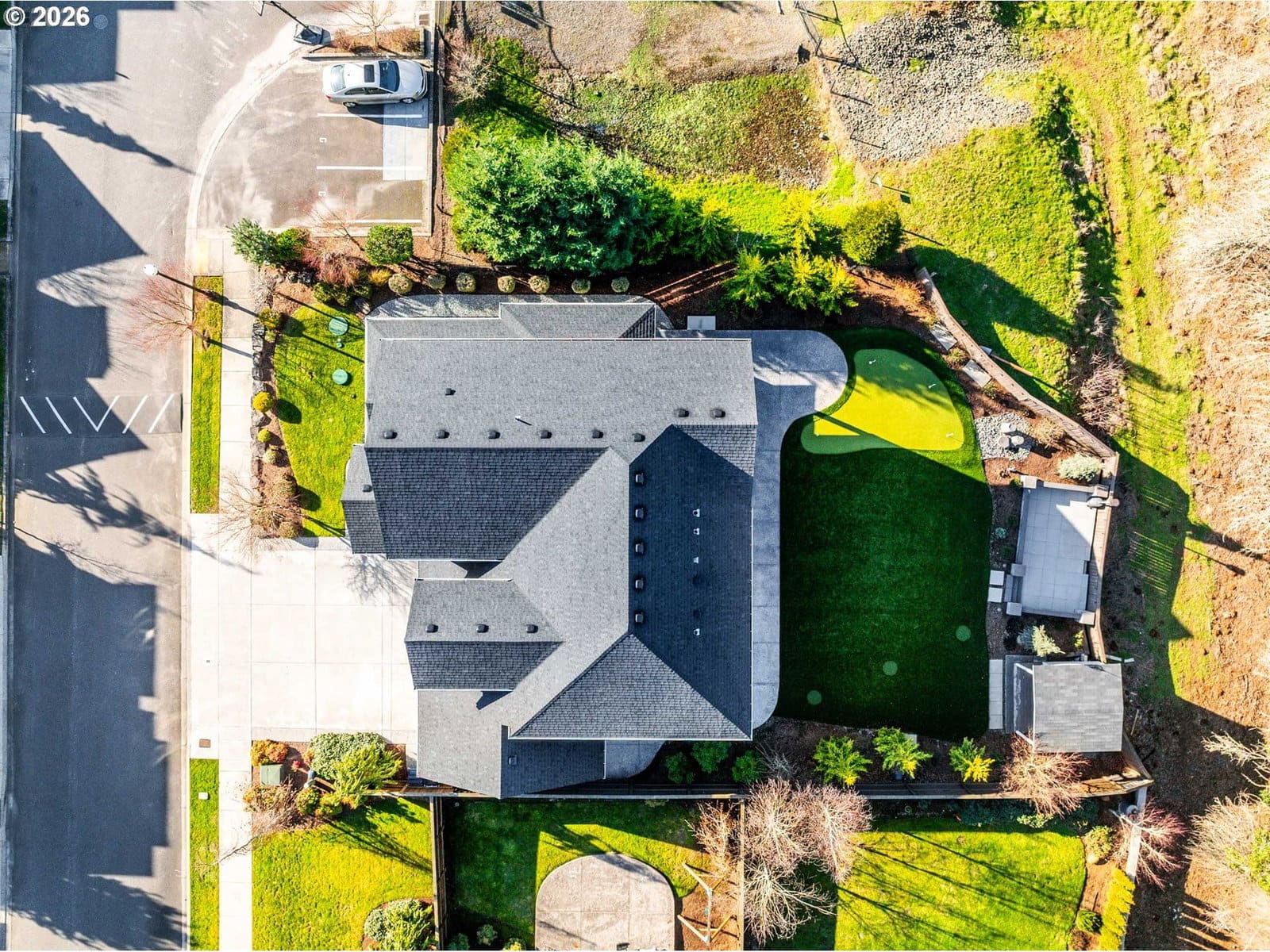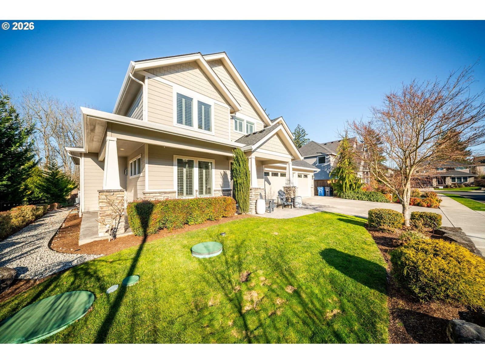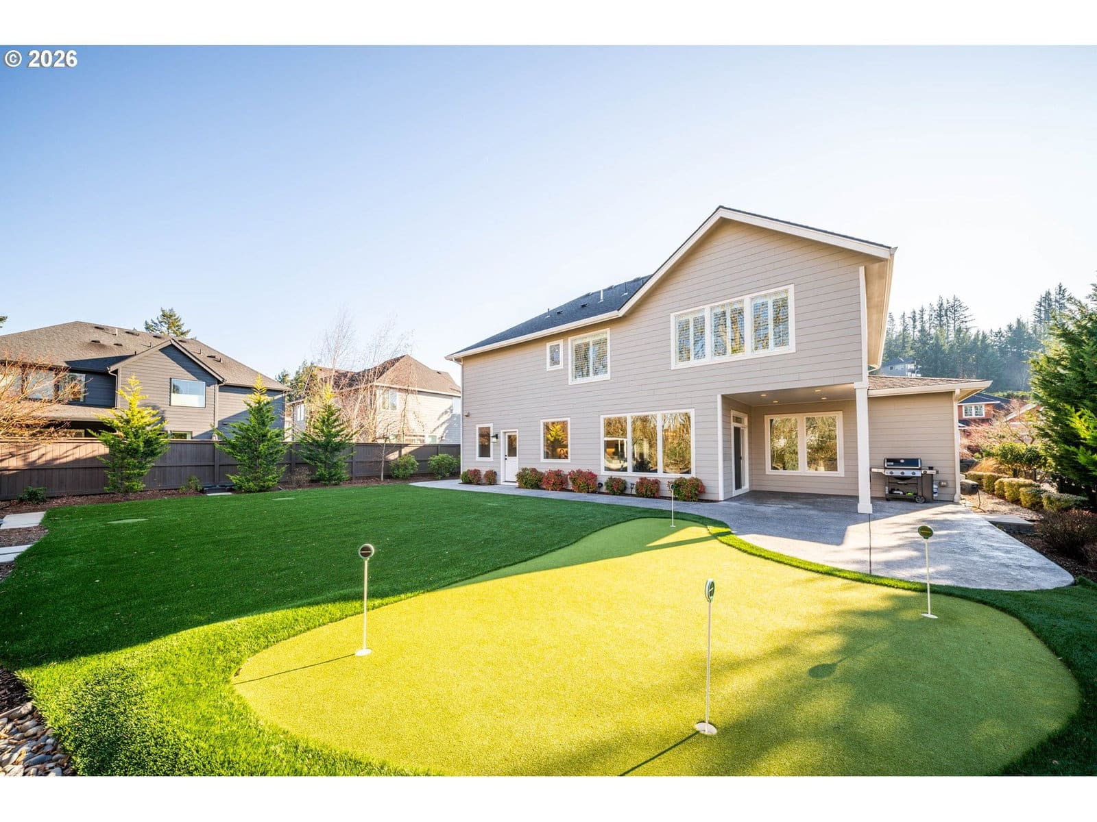 Indulge in elevated living in this beautifully designed Camas residence, perfectly positioned on a premium large corner lot backing to a private green space. The bright, open-concept layout showcases hardwood floors, spacious living areas and refined finishes throughout, creating an inviting yet sophisticated atmosphere. The gourmet kitchen features quartz countertops, custom cabinetry, island with seating, and a pantry —ideal for both everyday living and entertaining. A versatile main-level office or den offers flexibility. Upstairs, the primary suite with vaulted ceilings is a serene retreat with a spa-inspired bath, walk-in tiled shower, and expansive walk-in closet. Huge 4th bedroom or bonus room functional for many different needs. Step outside to a fully upgraded, hardscaped backyard designed for year-round enjoyment, complete with a private putting green, chipping area, stamped concrete, water feature, and terraced fire-pit space perfect for gatherings. Additional highlights include an over-sized three-car garage, convenient guest street parking, and a prime location just minutes from Lacamas Lake, shopping, top-rated Camas schools, and only a 5-minute drive to Camas Meadows Golf Course. A rare opportunity offering luxury, lifestyle, and location—this is a must see! In the heart of Camas and in Grass Valley School District, Sierra Meadows is a small and private neighborhood consisting of only 14 homes.