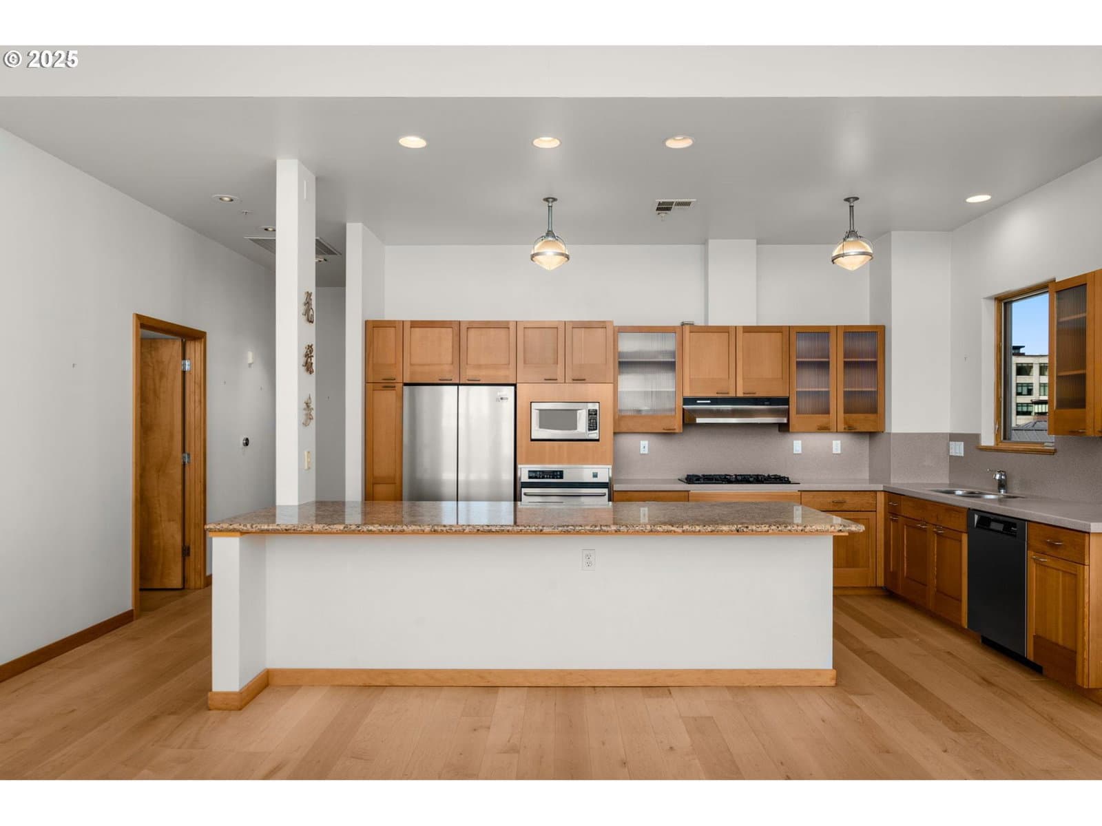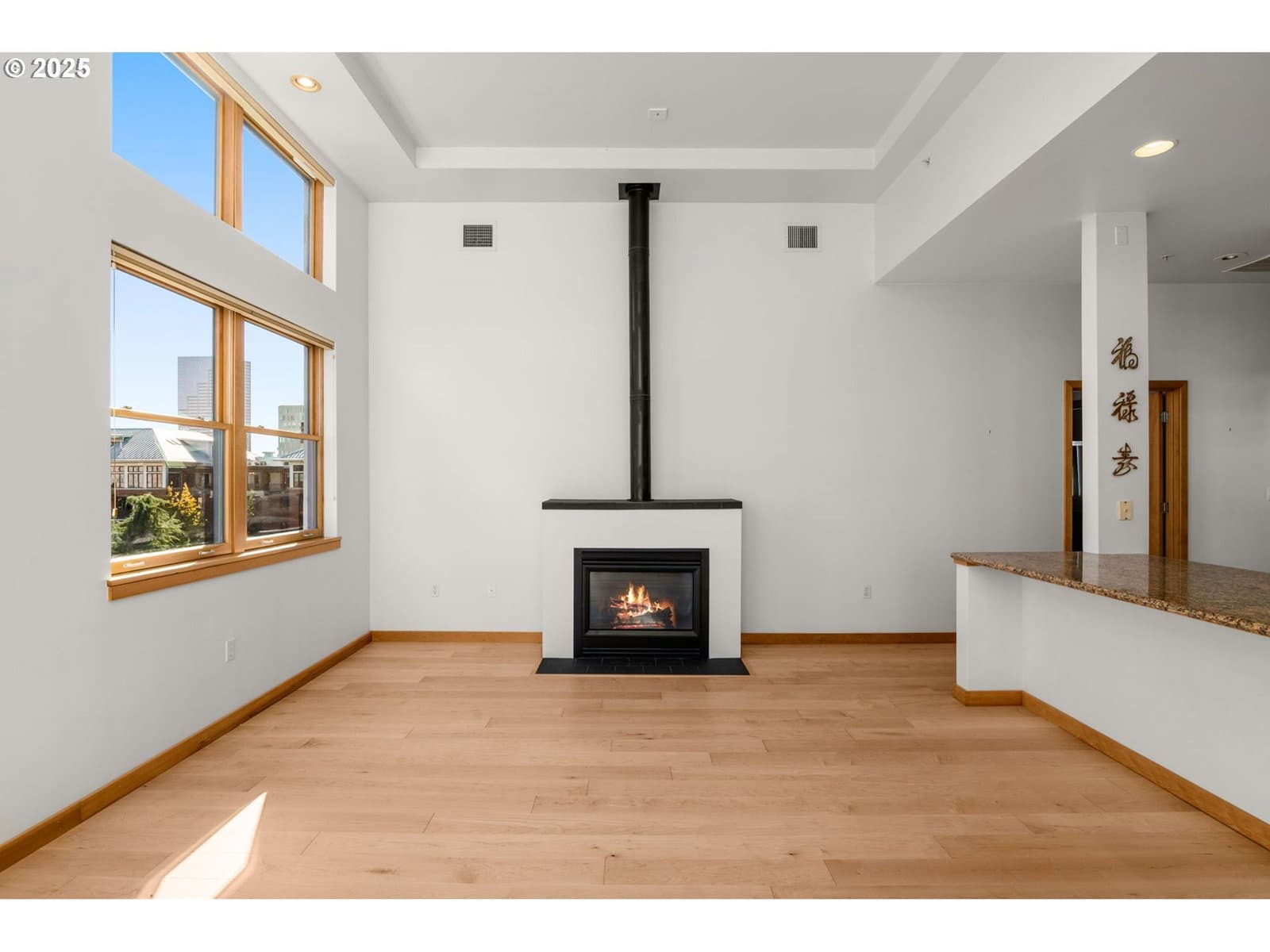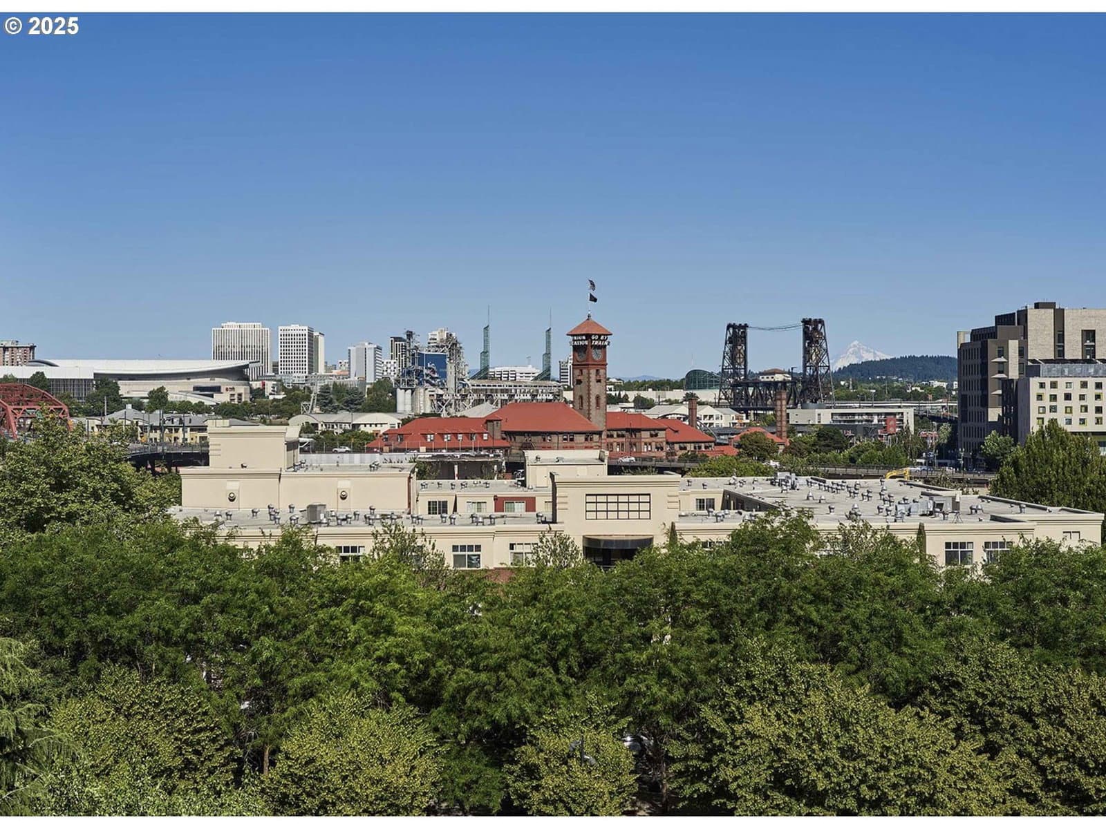 Corner penthouse at Riverstone Condominiums in the Pearl District. Elevated above Jamison Park, this distinguished two-bedroom, two-bath corner penthouse captures sweeping views of the city skyline, bridge and mountain beyond. The residence enjoys a premier top-floor position with a rare sense of openness and spatial separation provided by its park-front outlook. The main living area is defined by 14-foot ceilings, expansive wood windows and a welcoming gas fireplace that lends a distinctly European vibe. A private balcony—perched above a beautifully landscaped walkway—is conveniently located off the dining area and kitchen. A large granite island is a popular kitchen feature serving as both counter space for cooking and wonderful space for gathering. Kitchen appliances are stainless and include a new refrigerator. The range hood is ducted to the exterior. Recently installed hardwood floors extend throughout the home. The primary suite features inspiring views, a generous walk-in closet with custom organization and a thoughtfully appointed bath with built-in storage. The well-conceived floor plan also includes a second bedroom or office with northern cityscape views, an entry with closet and a guest bath with tub. Two deeded parking spaces and a storage unit complete this exceptional offering. Residents enjoy Riverstone's lush, gated courtyard with mature landscaping and comfortable seating areas. At street level, beloved neighborhood spots such as Piazza Italia restaurant, a popular ice cream shop and a fresh juice café create a lively urban scene—while the Portland Streetcar stop just outside connects you effortlessly to the best of the Pearl District.