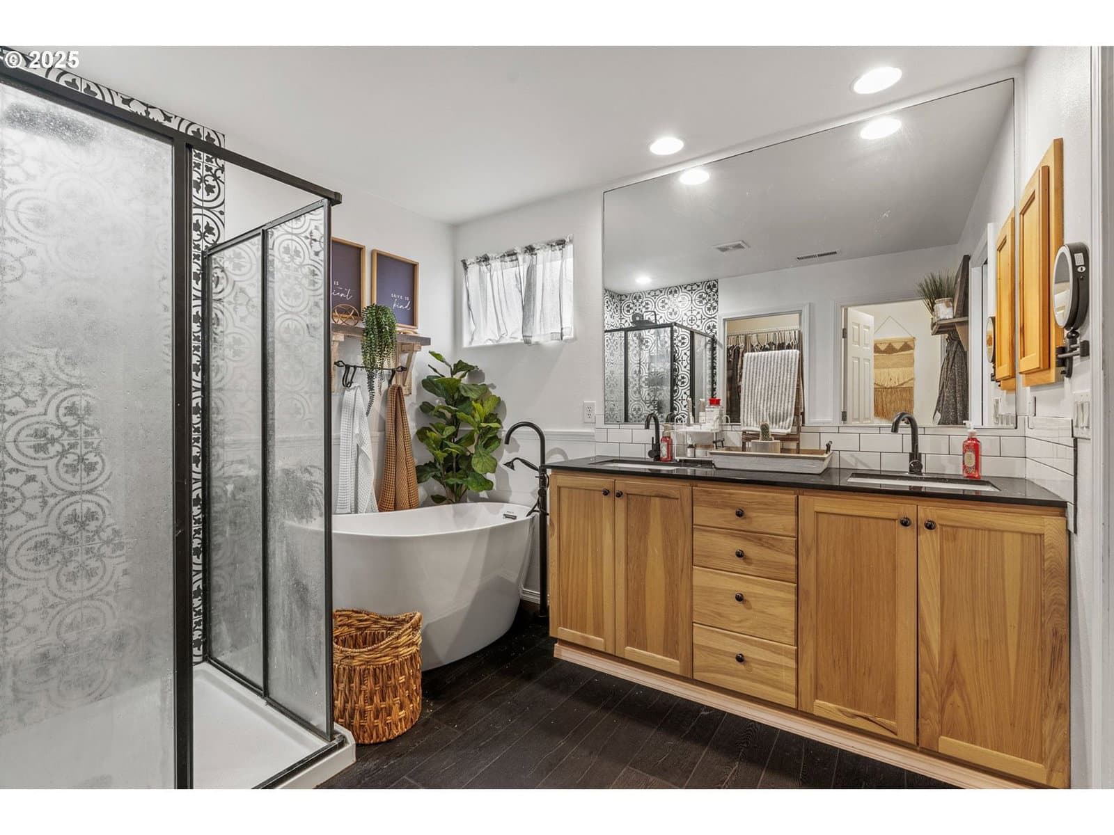 Quiet Cul-de-Sac Living with a Yard Built for Real Life — Minutes from Battle Ground Schools. This one is one you want to see. The kitchen is a true showpiece with crisp new cabinetry and quartz countertops. Laminate flooring runs seamlessly throughout the home, giving it a polished, cohesive feel with zero wasted space and less cleaning. The primary suite feels like a private retreat. The fully remodeled bath features custom tile, a freestanding soaking tub, and gives sleek glass shower—spa vibes. Nothing here is dated. Out back, you'll find a fully fenced yard, greenhouse and gazebo for entertaining. Newer 50yr roof, new cabinets, new flooring, newer paint. EV hook up. Tandem 3 CAR GARAGE. Call your fav. realtor to show today!