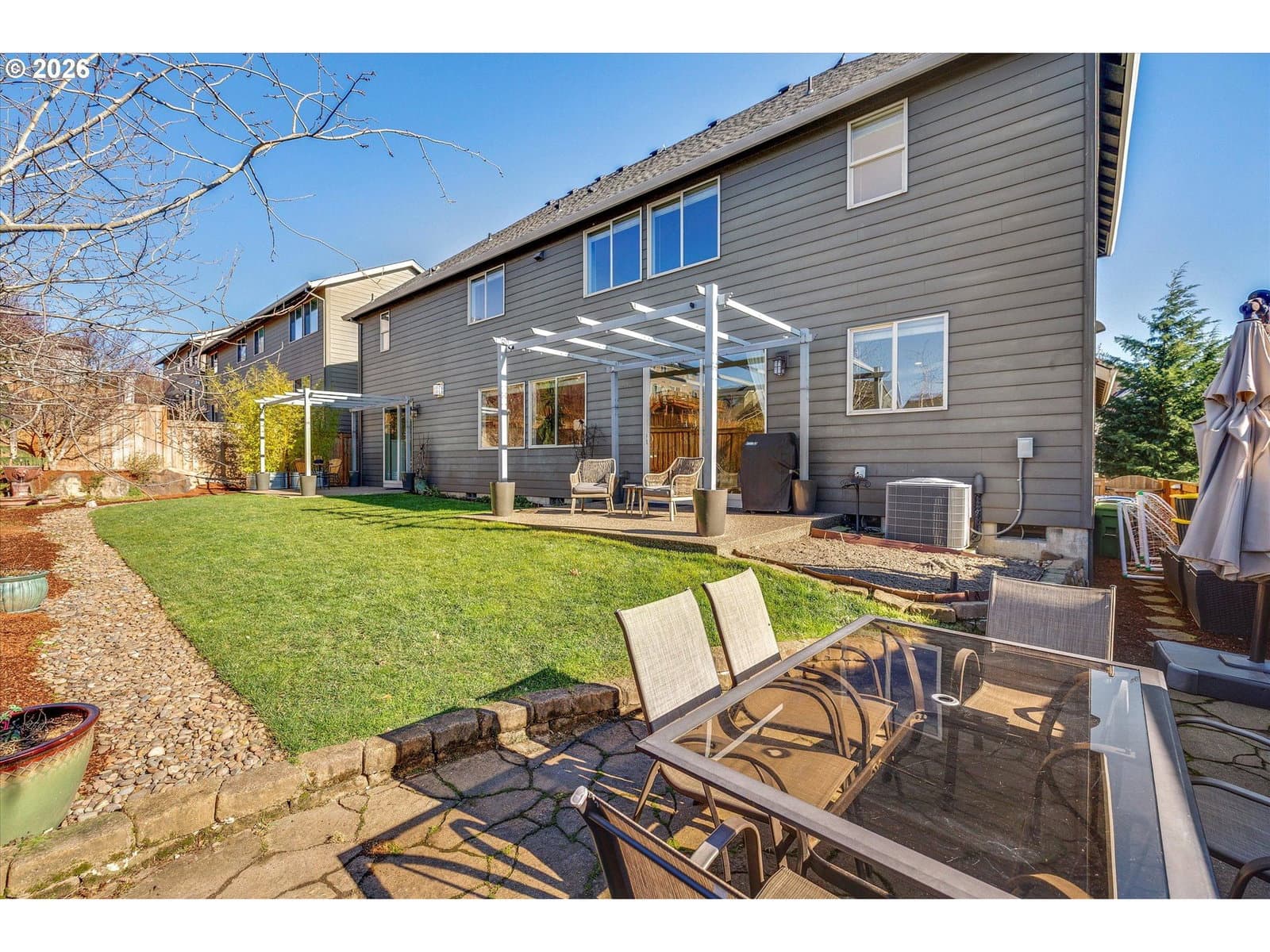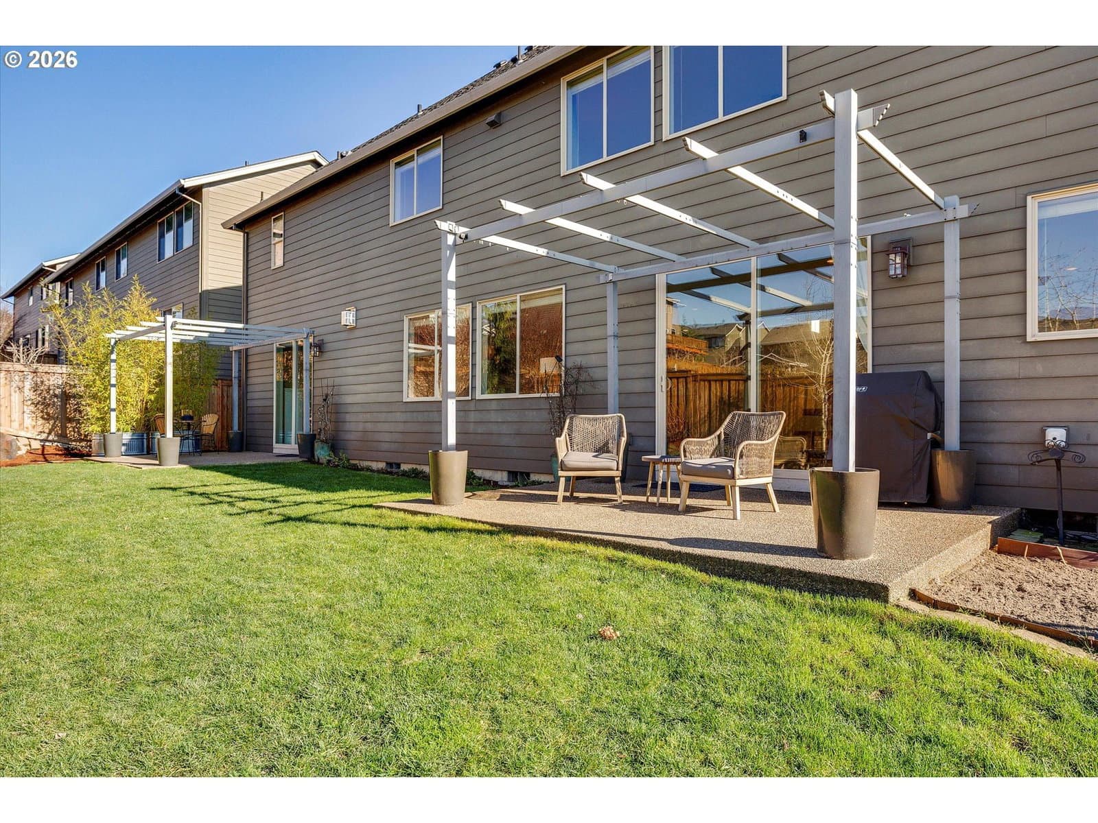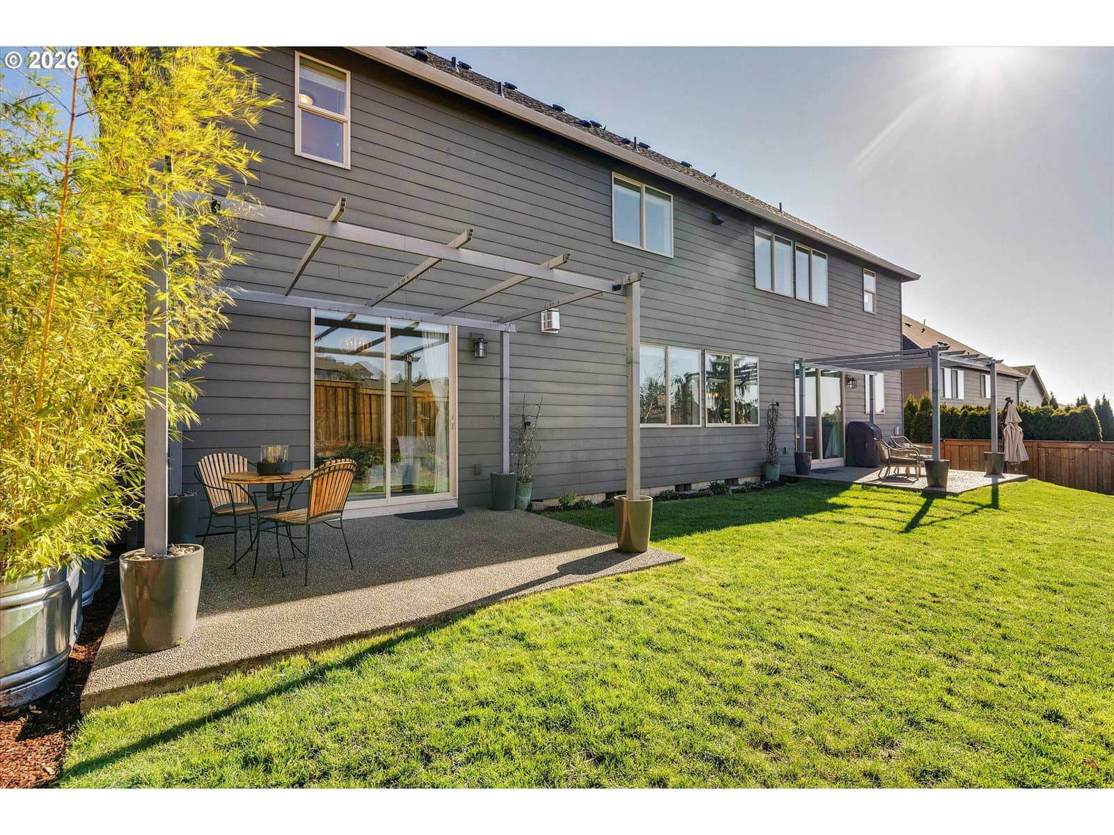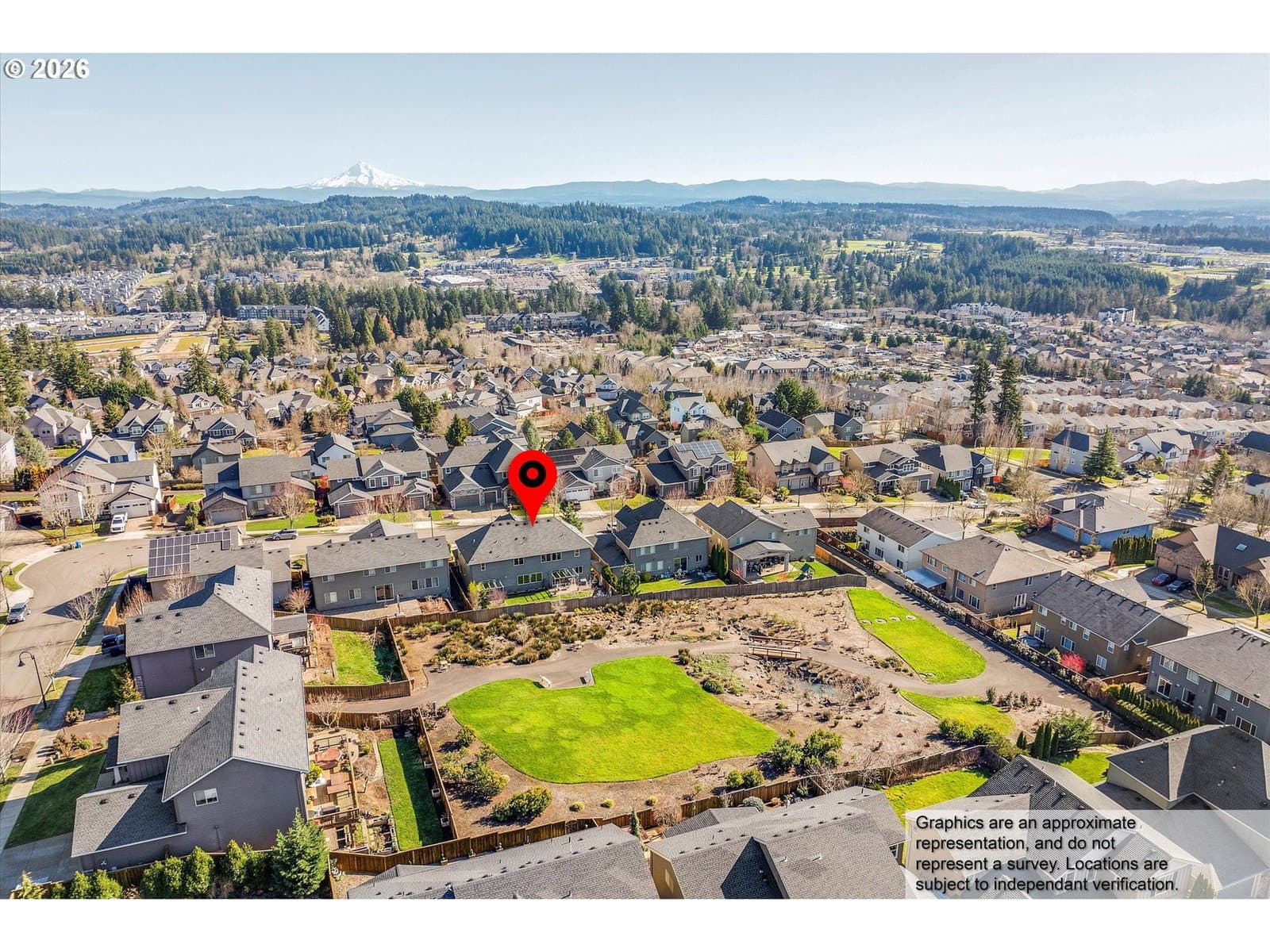 Built in 2015, this stunning 3,899 sq ft home offers a rare layout with an attached fully self contained 722 sq ft Multi-Generational Suite. This ground level suite is very private with its own entrance, dedicated garage, backyard with patio, pergola and sun-shade. Also includes 1 bedroom and on-suite bathroom, 15x13 spacious living room, stackable washer and dryer, generous kitchen with custom island and Brava oven & control over your own heat & AC, separate tankless water heater and engineered wood floors. This versatile space is ideal for multi-generational living, guests, college students, or add'l entertaining space for the home. The main home features 3176 sq ft, engineered wood floors on the main, EXPANSIVE kitchen/great-room concept, full of light, gas fireplace w/ built-ins and & 9 ft ceilings. Upstairs features 20X15 bonus loft room, primary suite with double sinks, & HUGE walk-in closet + an additional 3 bedrooms and 2 bathrooms (one Jack-n-Jill), large laundry room and plenty of storage thru-out the home. Located in a premier Happy Valley neighborhood with territorial backyard and Mt Hood view from upstairs & multi-gen suite front porch. Private HOA Park directly behind home. Enjoy the proximity to New Seasons, restaurants, trails, nature & 205....A truly one-of-a-kind opportunity offering space, privacy, and flexibility in an unbeatable location. All appliances are included.