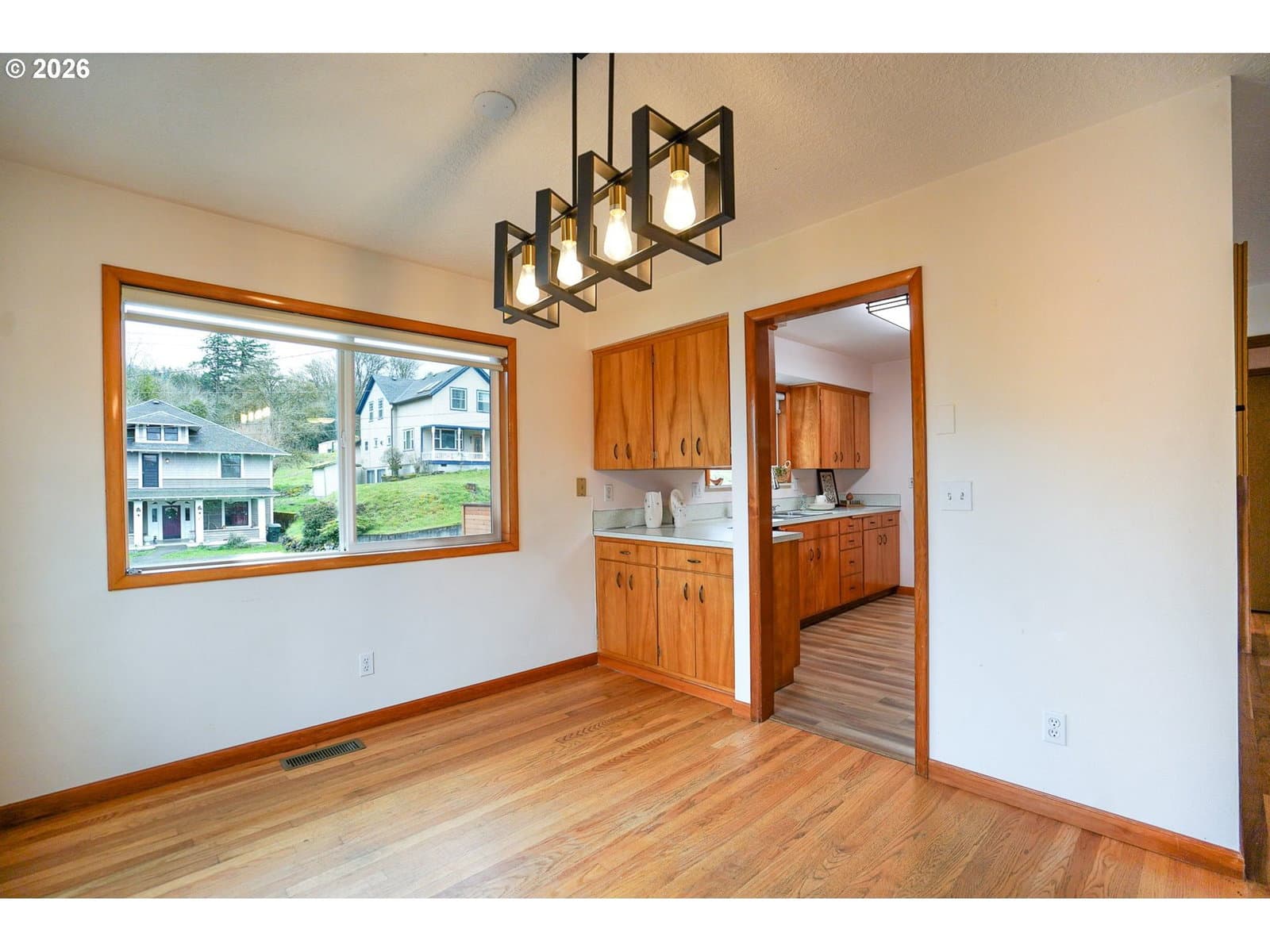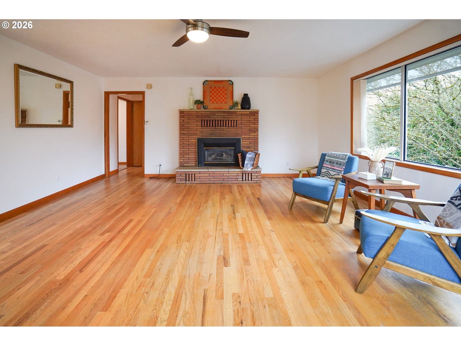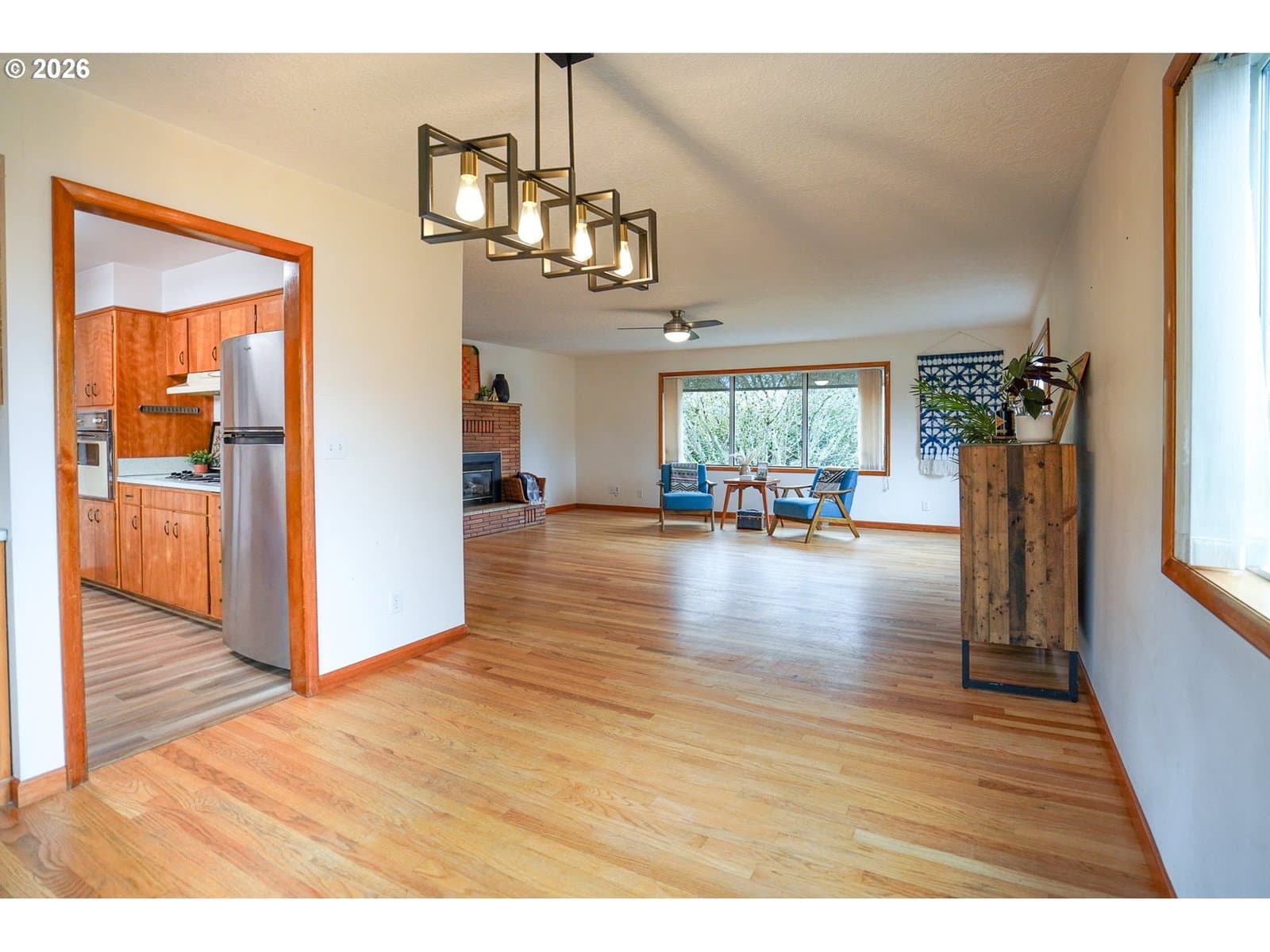 Charming 1961 mid-century modern home in a prime Kalama location, directly across from downtown and steps to Toteff Park. This 3-bedroom, 2.1-bath home features original floors, cabinetry, and counters in excellent condition, complemented by thoughtful updates. Light-filled living and dining spaces include a gas fireplace and large windows for comfortable everyday living.All bedrooms are on the main level with generous closets, including a flexible bedroom/office with an ensuite bath. A unique front patio living area adds functional outdoor space just off the kitchen. The heated, finished garage conversion offers versatile flex space and is zoned commercial, with potential to convert back to a garage.Outstanding parking includes two driveways with space for up to eight vehicles, plus room for RV, boat, or trailer parking and ADA-friendly main-level access. Fully fenced yard provides privacy. New roof in 2025. Pre-listing home, sewer, and radon inspections completed; details available. Walkable to downtown, parks, marina, and McMenamins, with easy I-5 access and approx. 30 minutes to Portland.