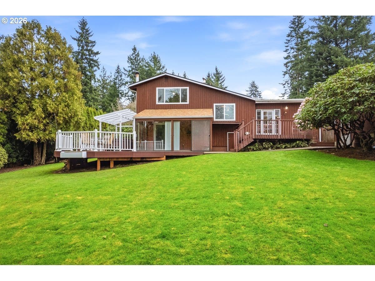 Multiple offers received. Offer Deadline is 4:00 pm Sat 3/7. Please have your offer expires at noon on Sunday. Adorable and spacious Mid-Century split level with an incredible backyard! Walk into soaring ceilings and tons of natural light. The floorplan is very flexible with living room, family room and bonus room. Updated bathrooms and new carpet. Enjoy the lovely 4 season sunroom off the family room. Spacious .33 acre lot features 2 gardens and fruit trees, 22'X 28' garage has a shop area. Room for RV/Boat parking. Great location close to Hwy 99 and Murrayhill/Progress Ridge. Roof 2020, Furnace and Mini-split 2024.