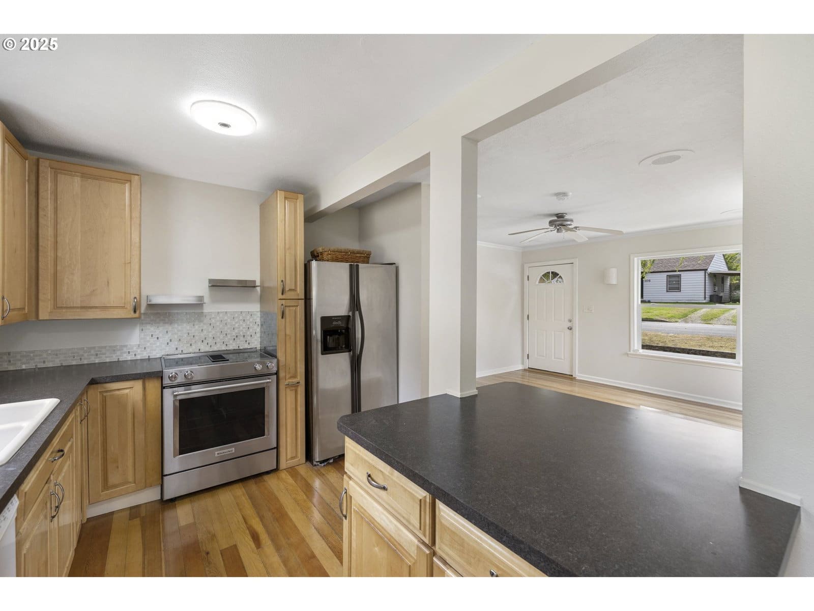 This thoughtfully updated home combines comfort, style, and efficiency. Inside, you’ll love the gleaming hardwood floors, refreshed bathroom with a refinished tub (10-year warranty), and a kitchen equipped with pull-out cabinets, stainless steel downdraft range, refrigerator, and built-in dishwasher. The mini split system provides efficient heating and cooling year-round. Outside, enjoy brand-new siding, new gutters, and a freshly poured concrete front porch and driveway. The detached one-car garage connects conveniently to the home with a covered breezeway. A huge, fenced backyard with a covered deck offers the perfect spot for relaxing or entertaining.Set on a quiet dead-end street just 500 feet from the neighborhood park, this home offers peace and convenience in one. Roof is approximately 10 years old. Compact in footprint but packed with value; this home truly lives large!