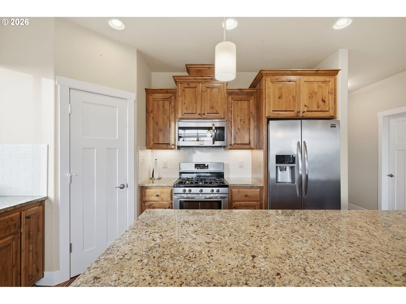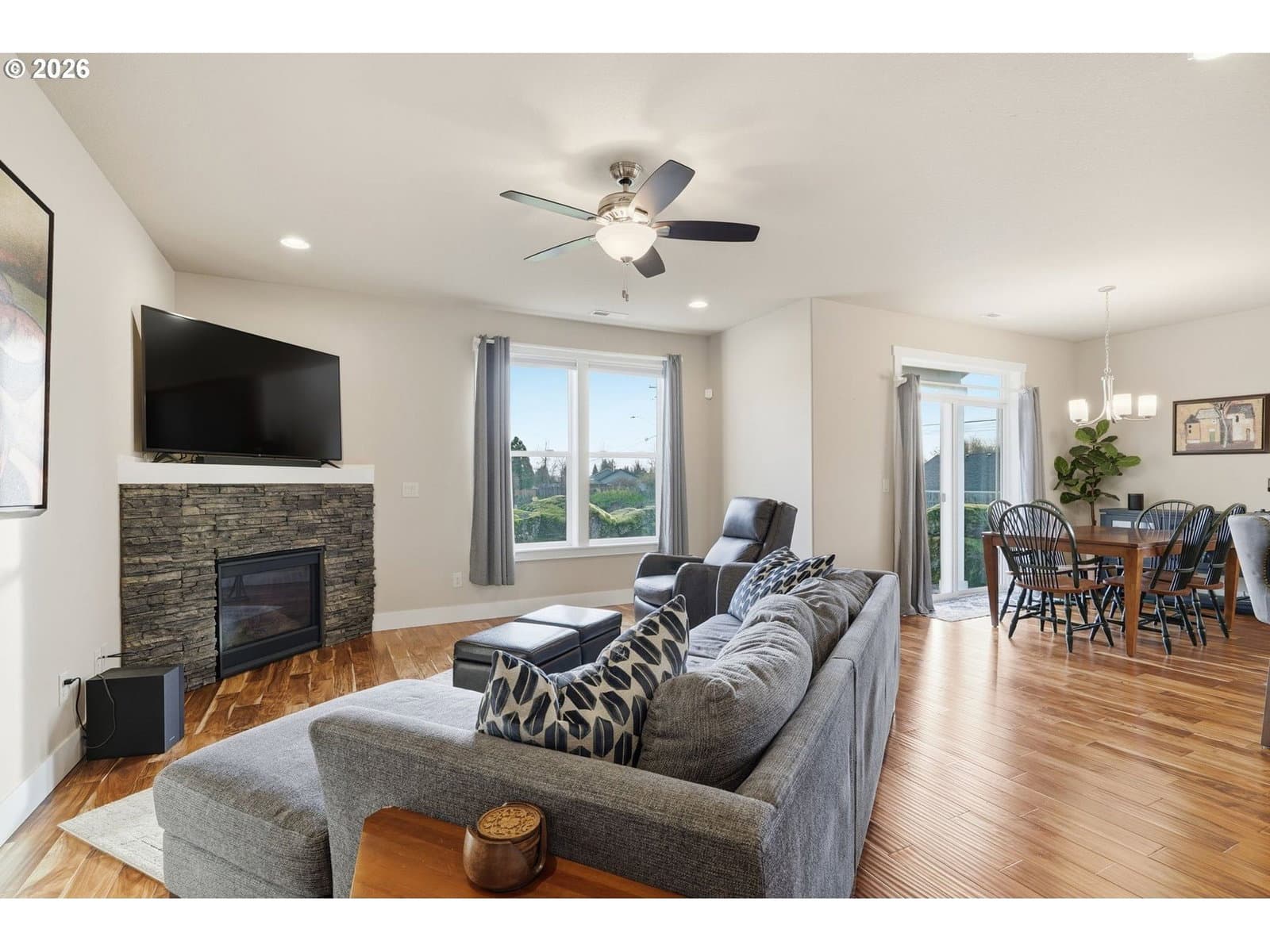 Open houses Monday through Friday 2 PM to 4 PM 1/19-1/23. Well-maintained, like-new 3 bedroom, 2 bath home with a 2-car garage and open great room layout. High ceilings, engineered hardwood flooring, gas fireplace, and gas furnace with central A/C.Kitchen features slab granite countertops, stainless steel appliances, custom cabinetry, large island, and pantry. All appliances are included.Primary suite offers tile bathroom floors and a tiled walk-in shower. Quality finishes throughout.Covered patio, exterior sprinklers, and a low-maintenance yard. Corner lot backing to green space.Water purification system added in 2021, including a Kinetico 2060s OD whole-home system and Kinetico K5 drinking water station.Convenient location just minutes from shopping, restaurants, medical services, and grocery stores.