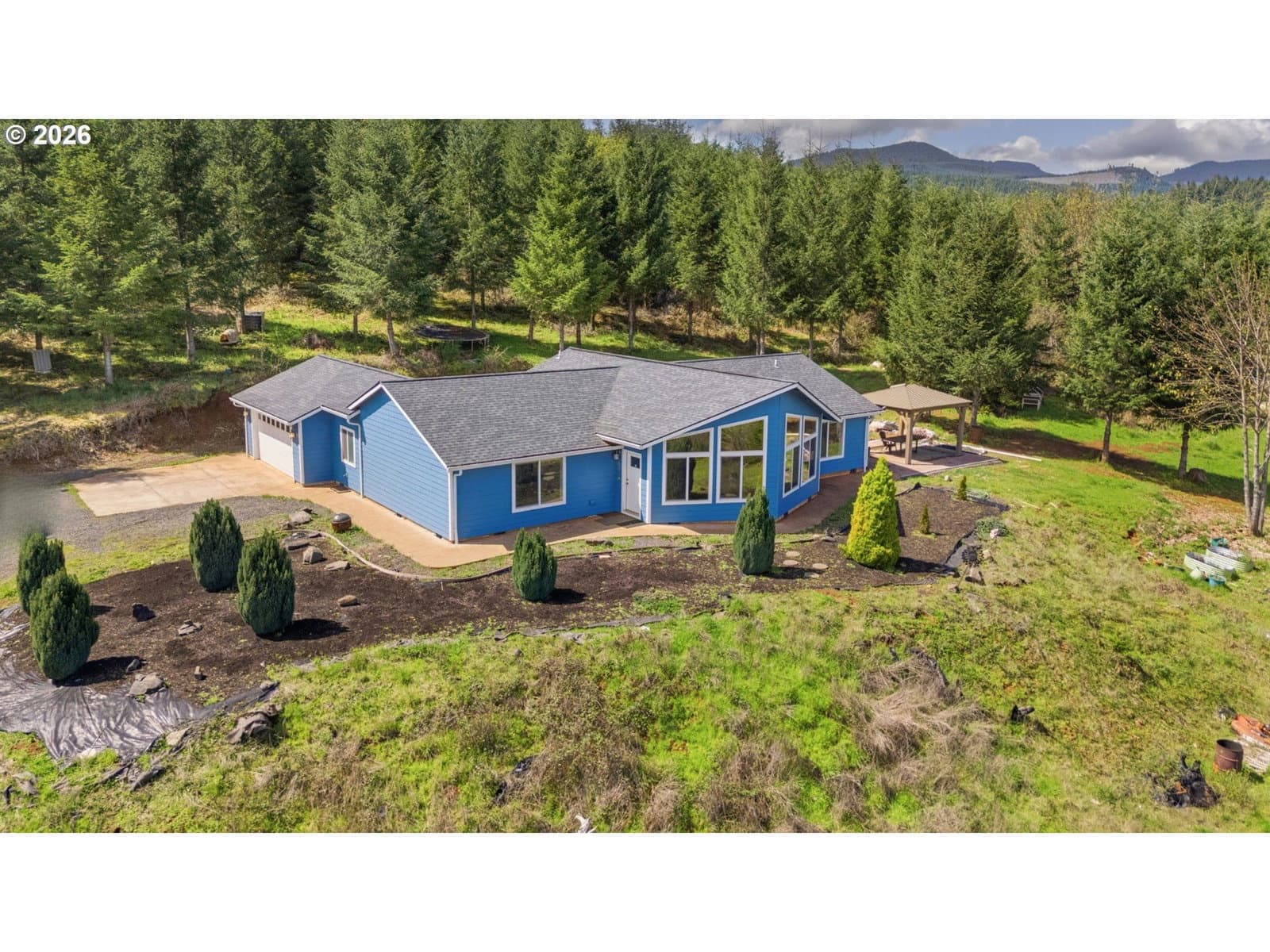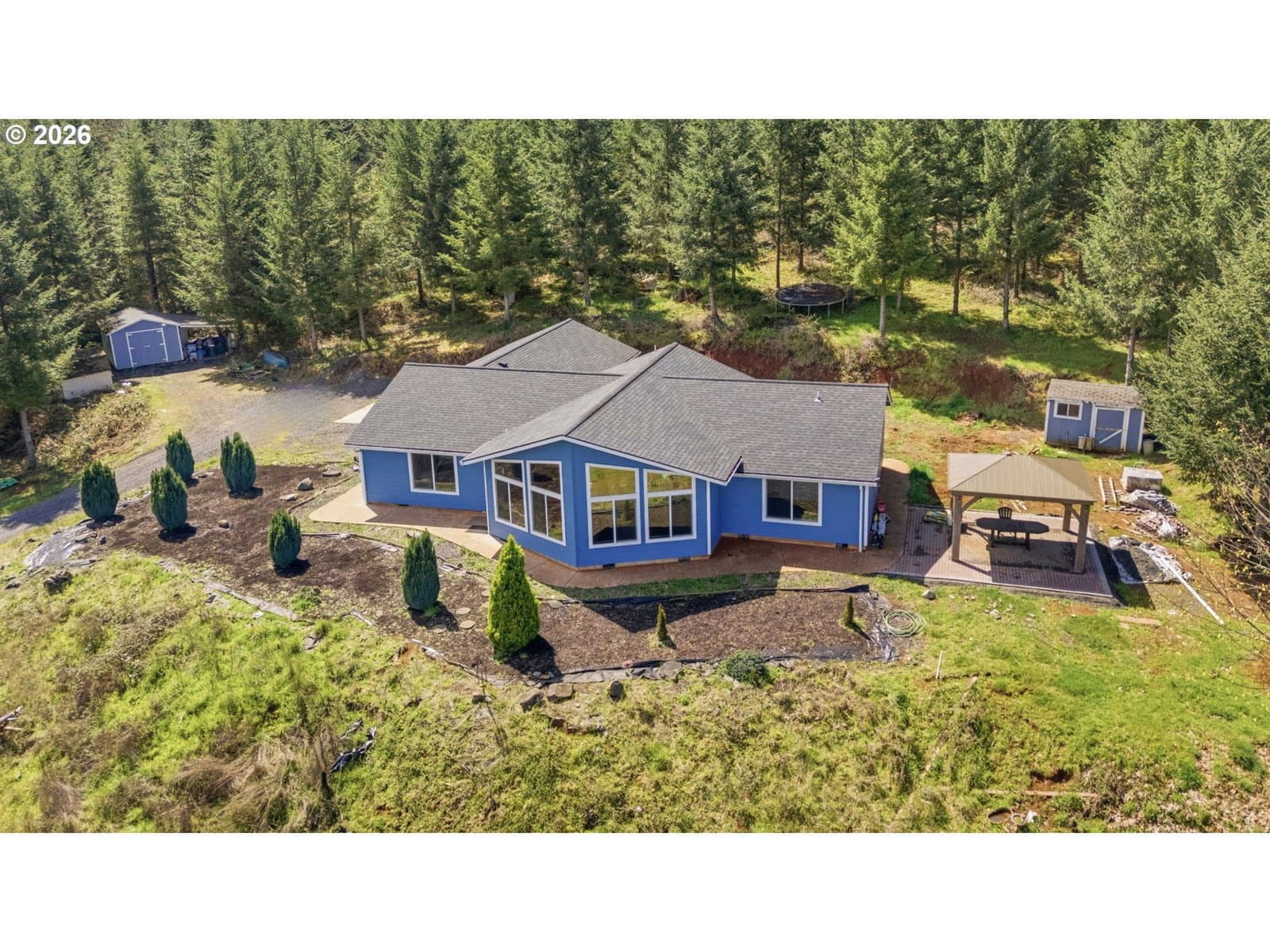 Perched at the top of Cascade Woods Drive, this stunning 30-acre property offers a rare combination of privacy, natural beauty, and breathtaking views. Tucked behind a gated private road shared with just two other homes, the setting provides an added sense of seclusion and security. Surrounded by mature trees and laced with scenic trails, it’s an ideal retreat for those seeking space to explore, unwind, and enjoy the outdoors.The 3-bedroom, 2-bath home is designed to take full advantage of its surroundings, featuring a light-filled living room with expansive east-facing windows that capture incredible sunrises and sweeping vistas. The spacious primary suite offers a peaceful retreat, complete with a walk-in closet for added comfort and convenience.Step outside to enjoy the property’s many amenities, including a charming gazebo—perfect for relaxing, entertaining, or simply taking in the serene landscape. Two additional outbuildings provide excellent flexibility for storage, hobbies, or workspace needs, while a detached studio adds even more versatility as a home office, creative space, or workout room.Whether you're looking for a quiet escape or a place to spread out and live fully, this property delivers a truly special lifestyle opportunity. 2025 Timber deferral taxes $3117.53.