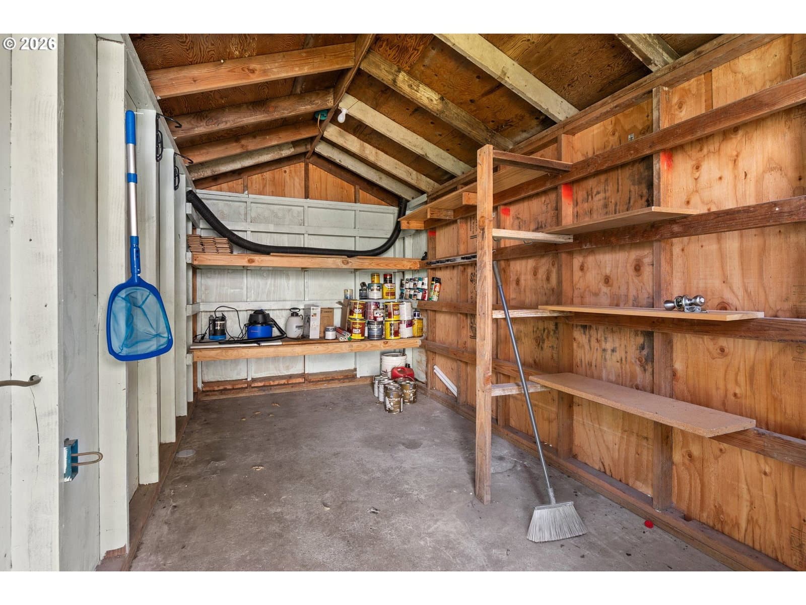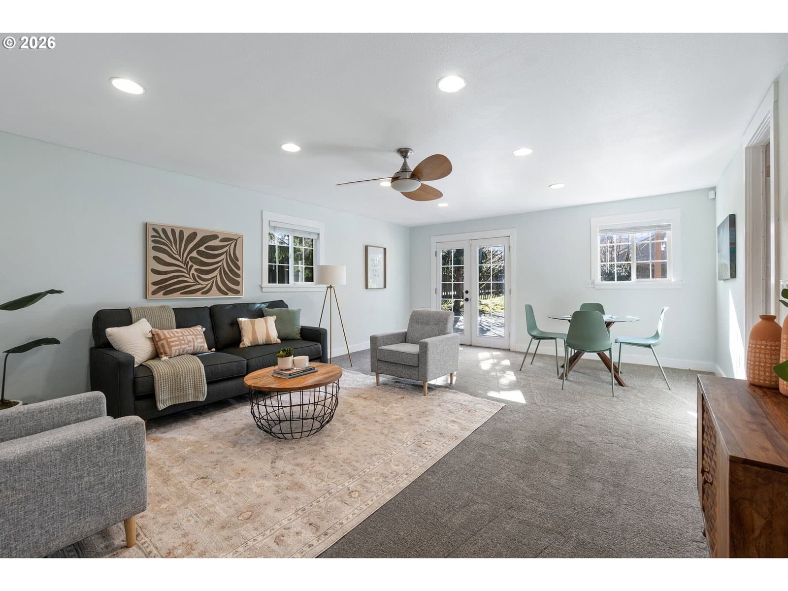 Adorable Home in Hayhurst. Come through the zen like front garden into a beautiful large living room with western facing light pouring in that afternoon sun. Soothing paint colors calm the spaces and easy maintenance with bamboo floors throughout. A fresh update to the kitchen with painted cabinets, SS appliances and sink, tile backsplash on both sides and added sun coming through the skylight. Cozy informal eating area perfectly placed for entertaining and close to the extra pantry cabinet. Primary bedroom is generously sized with two deep closets for all your necessary clothing storage. New carpet in the both bedrooms, also in the extra bonus room which can be used as another bedroom, family or party room. Access from this room as well from the laundry room leads you to the huge patio and wood deck area, perfect for entertaining on those warm days ahead! You’ll delight in the big grass yard, garden beds and berries as the seasons change the matured landscape. A tool shed is conveniently placed in the back and provides plenty of storage. A new roof has been recently installed and the newer windows help keep your utility bills down. With quick access to neighborhood amenities and close by parks, this home is ready for you to start living! See our virtual tour links for more information. [Home Energy Score = 2. HES Report at https://rpt.greenbuildingregistry.com/hes/OR10113216]
