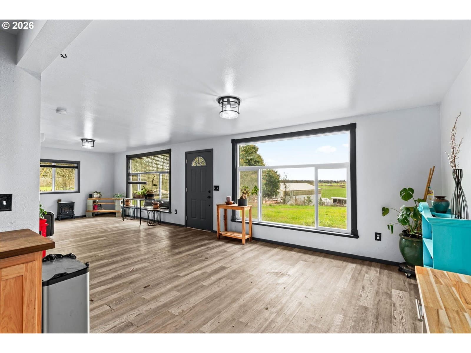 Located on nearly three acres just north of Coburg, this close-in country property offers peaceful surroundings with territorial and valley views while remaining convenient to town. The kitchen features custom Courtland cabinets, butcher block countertops, and a full set of appliances including refrigerator, range, microwave, and dishwasher, all installed new in 2023. The updated bathroom features a new vanity and toilet. Newer laminate flooring runs throughout the entire home, complemented by fresh interior paint, updated light fixtures, and new blinds. Additional improvements completed when the home was purchased include a new hot water tank, cadet heaters, and bathroom fan. Water quality was upgraded with the installation of a Culligan Aquasmart Sulfur-Cleer filtration system along with a 20" Big Blue sediment filter, designed to address common well water conditions. The home also features a French drain system installed around the perimeter and TerraFirma foundation work with warranty. The property includes a large mud and laundry room with built-ins and utility sink, along with exterior access that works well for rural living. Outside, the nearly three-acre parcel provides space for animals, gardening, or additional improvements. Additional exterior features include a well house, newly installed asphalt driveway, expanded gravel parking area, RV hookups, and an insulated 10×20 lofted barn storage building. The setting offers privacy, open space, and views while remaining a short drive to Coburg, Harrisburg, and Eugene.