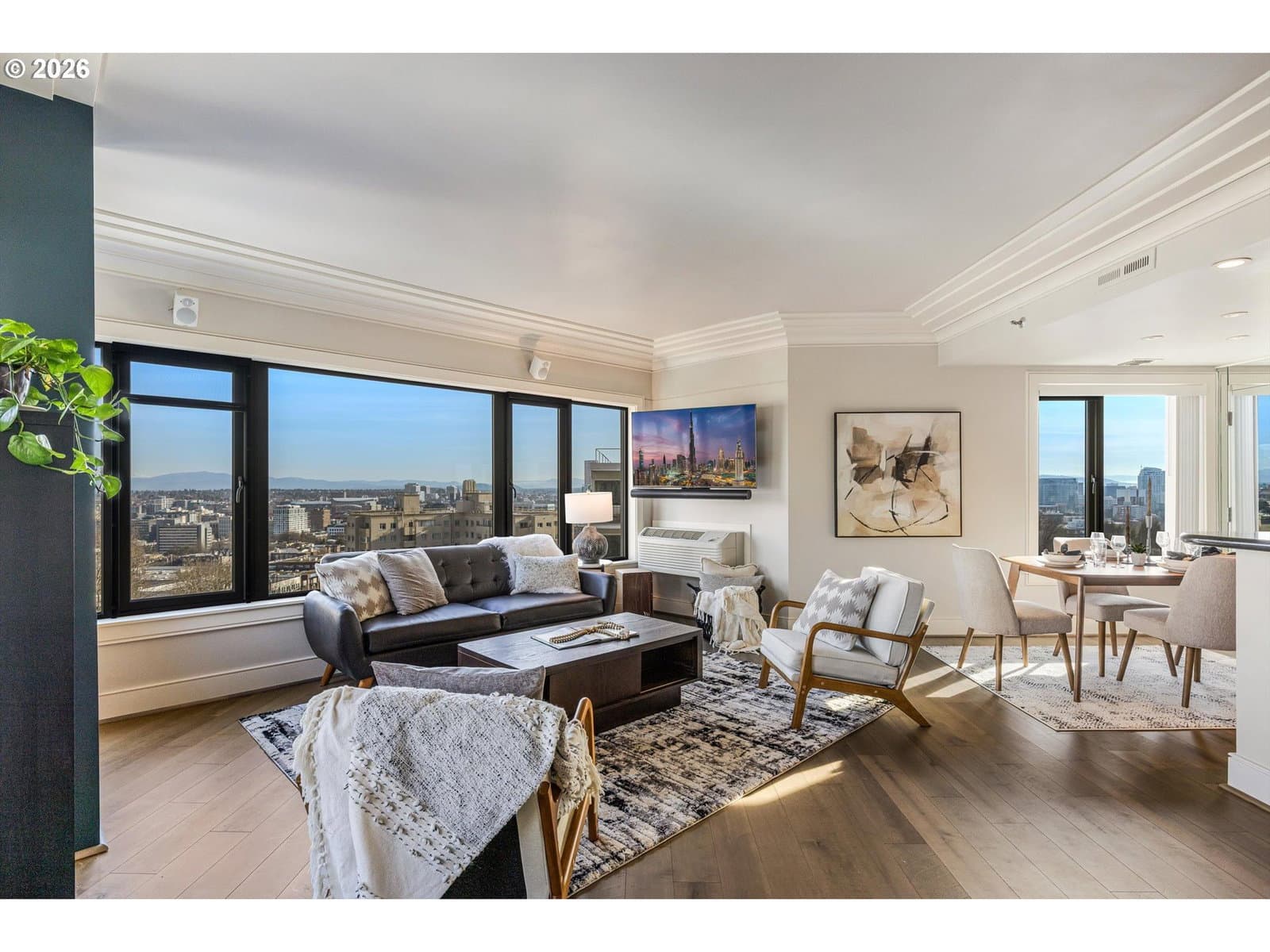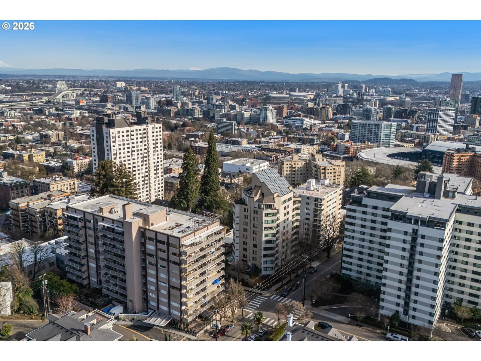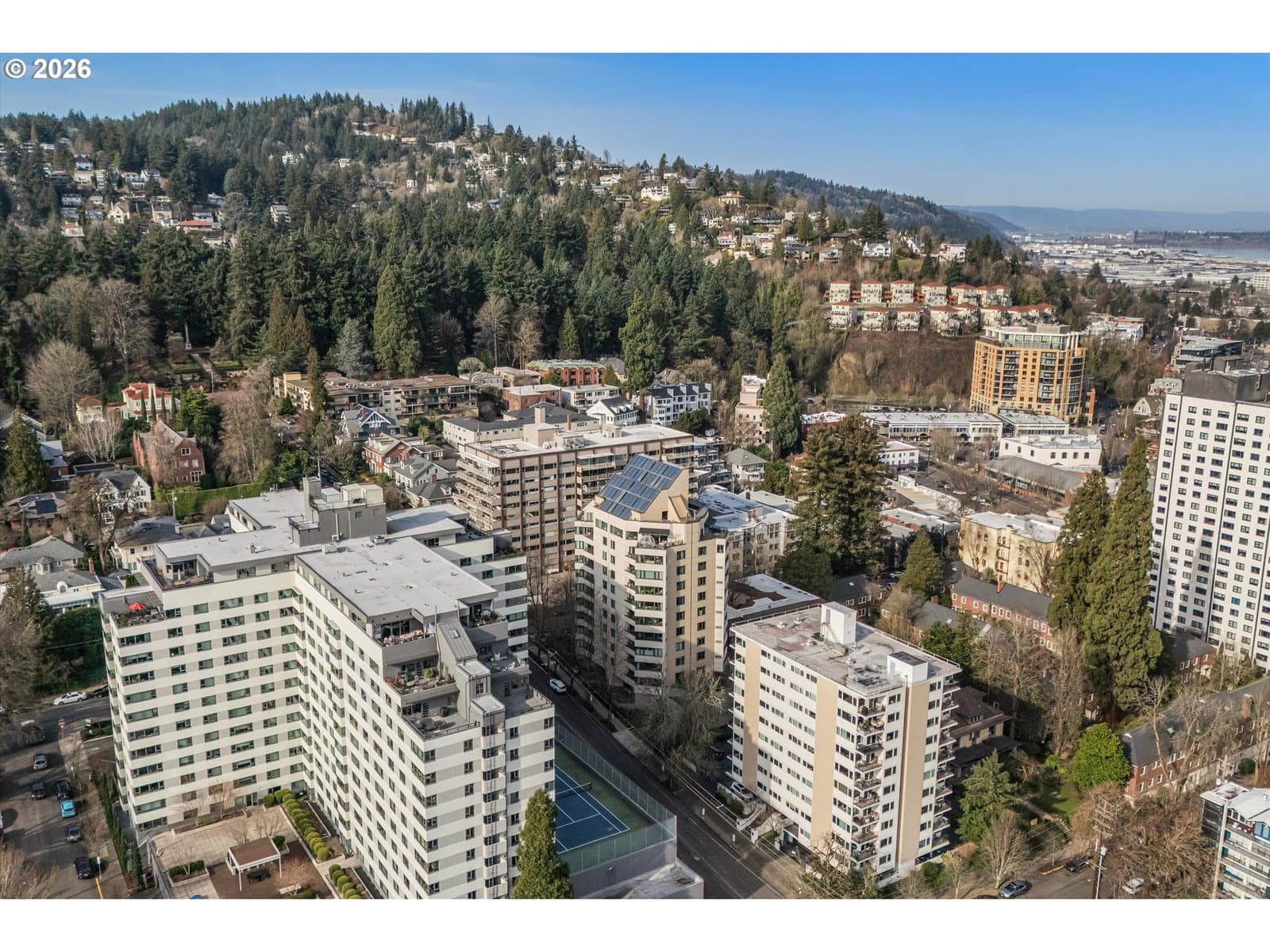 Located on the 7th floor in the heart of Goose Hollow, this 2-bedroom, 2-bath condo offers the perfect mix of city living and Northwest beauty. Just steps from Forest Park, the MAC, Providence Park, Zupan’s Market, and the MAX light rail, you’re surrounded by Portland’s best amenities. Inside, wall-to-wall windows showcase sweeping city views and multiple mountain vistas, filling the space with natural light. The open kitchen features a newer gas range, Sub-Zero refrigerator, granite surfaces, and all appliances included, along with an in-unit washer and dryer. New luxury vinyl plank flooring adds warmth and durability. The primary suite includes a walk-in closet, dual-sink vanity, and tiled shower, while the second bedroom offers flexible space for guests or a home office. Step outside to your covered patio and enjoy a peaceful spot to take in the skyline. Secure building access, a well-managed HOA, deeded parking in the secure garage, and a large storage unit on the garage level complete the package. A rare opportunity to own a beautifully located condo in one of Portland’s most desirable neighborhoods.