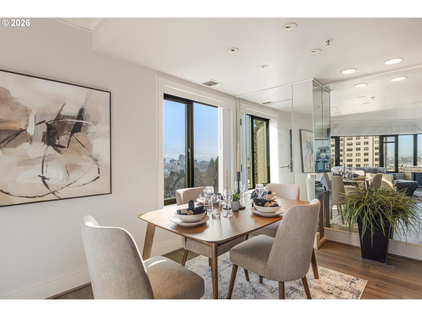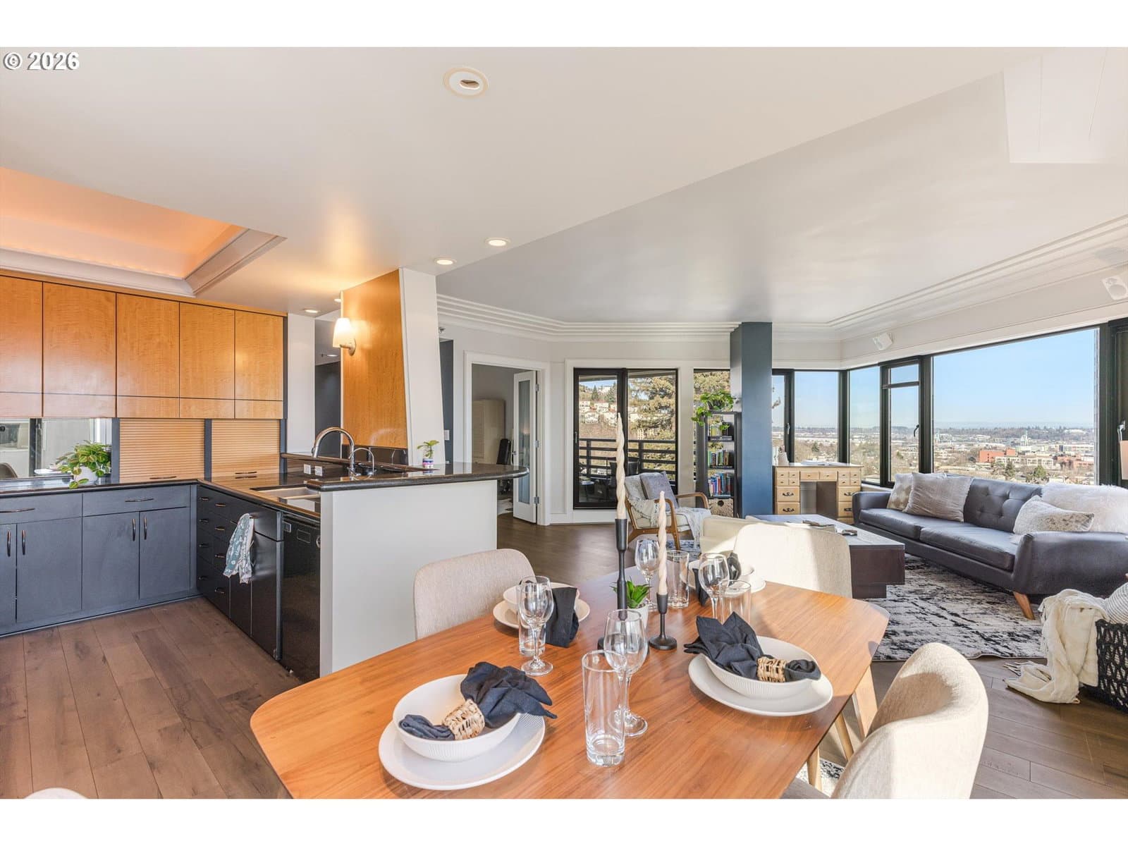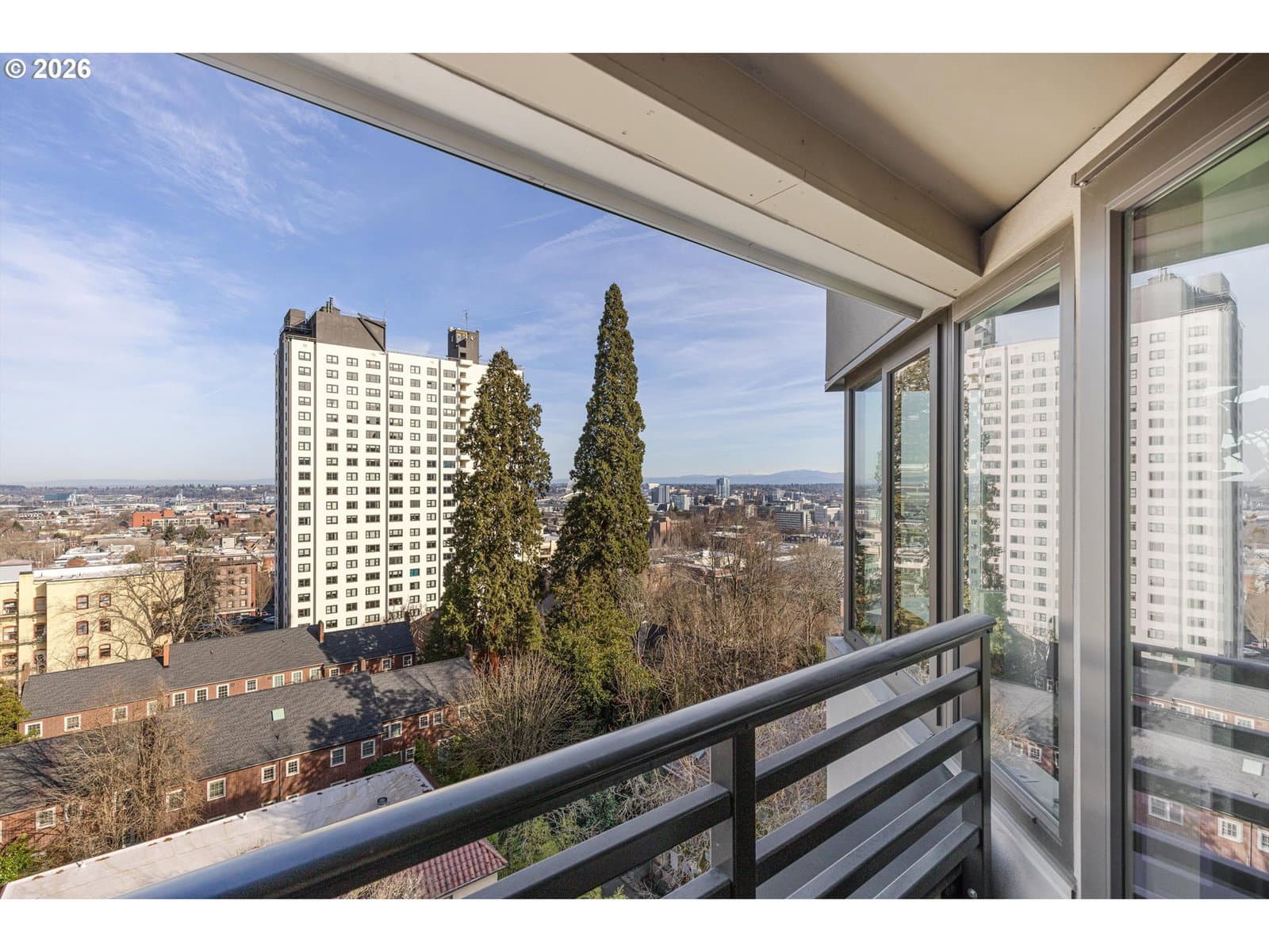Located on the 7th floor in the heart of Goose Hollow, this 2-bedroom, 2-bath condo offers the perfect mix of city living and Northwest beauty. Just steps from Forest Park, the MAC, Providence Park, Zupan’s Market, and the MAX light rail, you’re surrounded by Portland’s best amenities. Inside, wall-to-wall windows showcase sweeping city views and multiple mountain vistas, filling the space with natural light. The open kitchen features a newer gas range, Sub-Zero refrigerator, granite surfaces, and all appliances included, along with an in-unit washer and dryer. New luxury vinyl plank flooring adds warmth and durability. The primary suite includes a walk-in closet, dual-sink vanity, and tiled shower, while the second bedroom offers flexible space for guests or a home office. Step outside to your covered patio and enjoy a peaceful spot to take in the skyline. Secure building access, a well-managed HOA, deeded parking in the secure garage, and a large storage unit on the garage level complete the package. A rare opportunity to own a beautifully located condo in one of Portland’s most desirable neighborhoods.