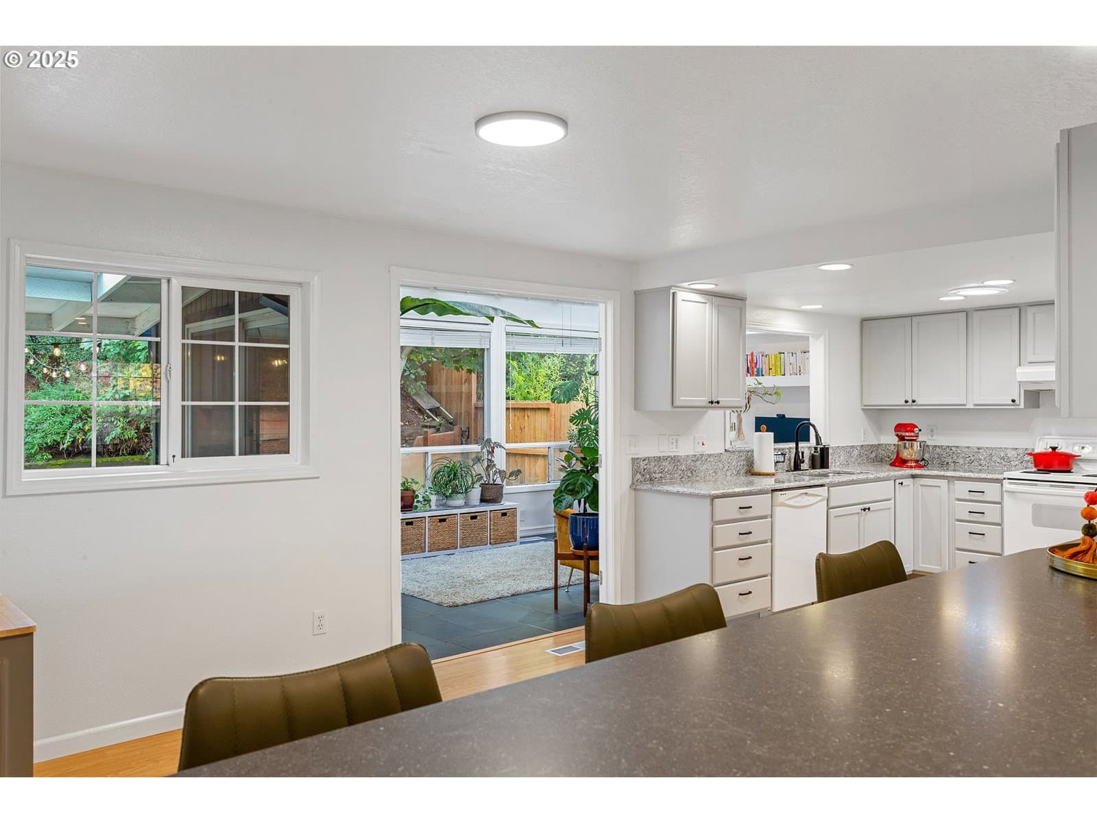 Smart and thoughtfully updated one-level home in a quiet neighborhood- yet easy access to all of the necessities. This home blends indoor and outdoor living with a spacious floorplan connecting an inviting living room with wood-burning fireplace, a large kitchen and spacious sunroom featuring a vaulted ceiling. Enjoy low-maintenance engineered hardwood flooring throughout and new tiled bathrooms. Host gatherings and celebrate occasions around the stylish bar connecting kitchen and living room spaces. The primary suite opens to the patio and backyard. The covered patio extends to a welcoming flag-stone fire pit area and relaxing vibe for evenings with you and your friends. Terraced garden areas and fully fenced backyard provide privacy and room to play. The spacious two-car garage is insulated and offers workshop space as well. Convenient access to local trails, Cooper Mountain Nature Park, highly-rated schools, shopping/dining, and major employers. This home lives large and all it needs is you!