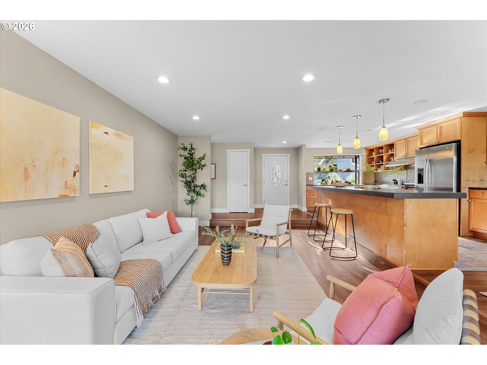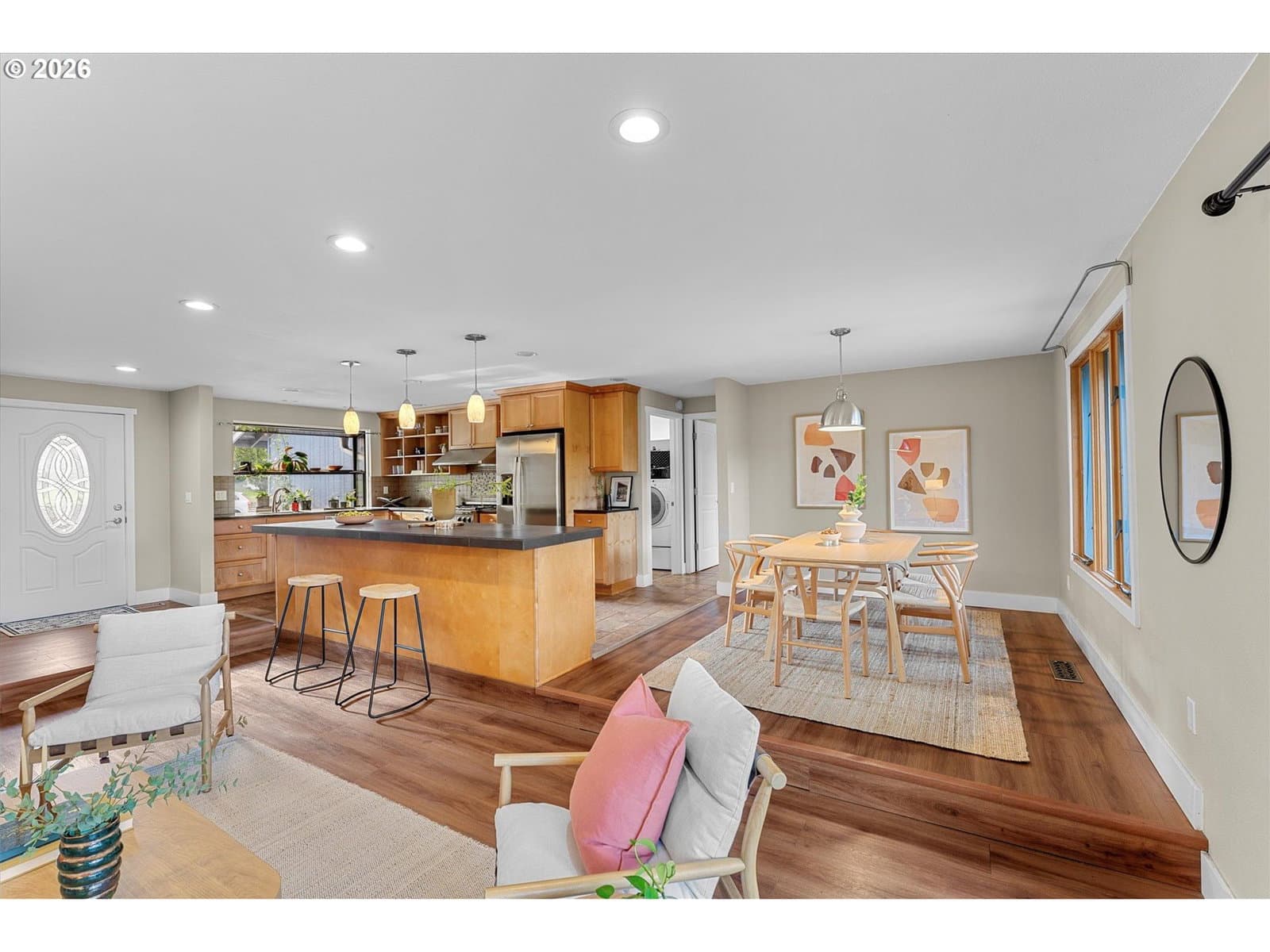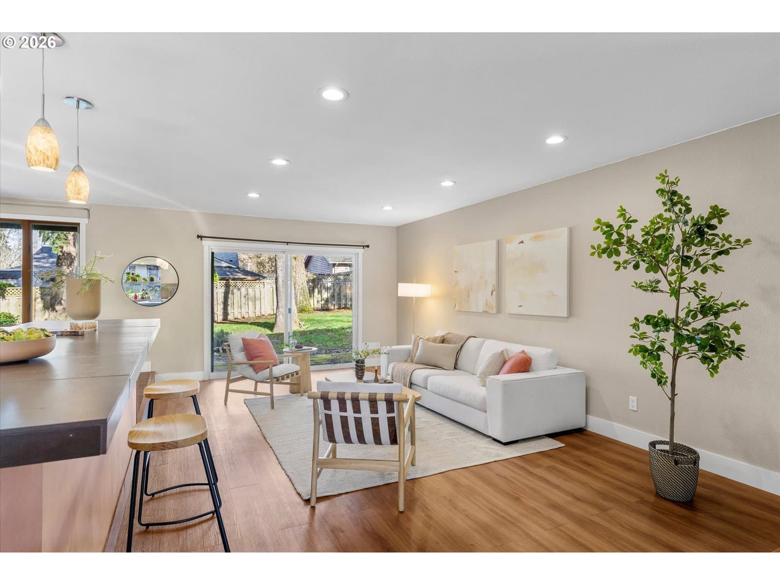Welcome home to this light-filled, single-level gem on a peaceful street in the heart of Beaverton. With 3 bedrooms, 2 bathrooms, and a flexible bonus space with a closet (perfect for a home office, den, or additional bedroom), the layout is both functional and inviting. The open-concept design flows beautifully, with wonderful natural light throughout and a sense of ease the moment you walk in. The spacious, updated kitchen is a standout, featuring granite countertops, a large island, oversized gas range, stainless steel appliances, and a charming garden window, which is perfect for growing fresh herbs right at home. Step outside to a huge, quiet, fully fenced yard with a stone patio and mature trees, offering a retreat to relax, garden, or entertain. Enjoy central A/C, energy-efficient windows, ample storage, and a two-car garage. Plus, it's minutes to Washington Square Mall, downtown Beaverton dining and farmers market, trails, parks, Nike, and Intel—this one truly checks all the boxes.