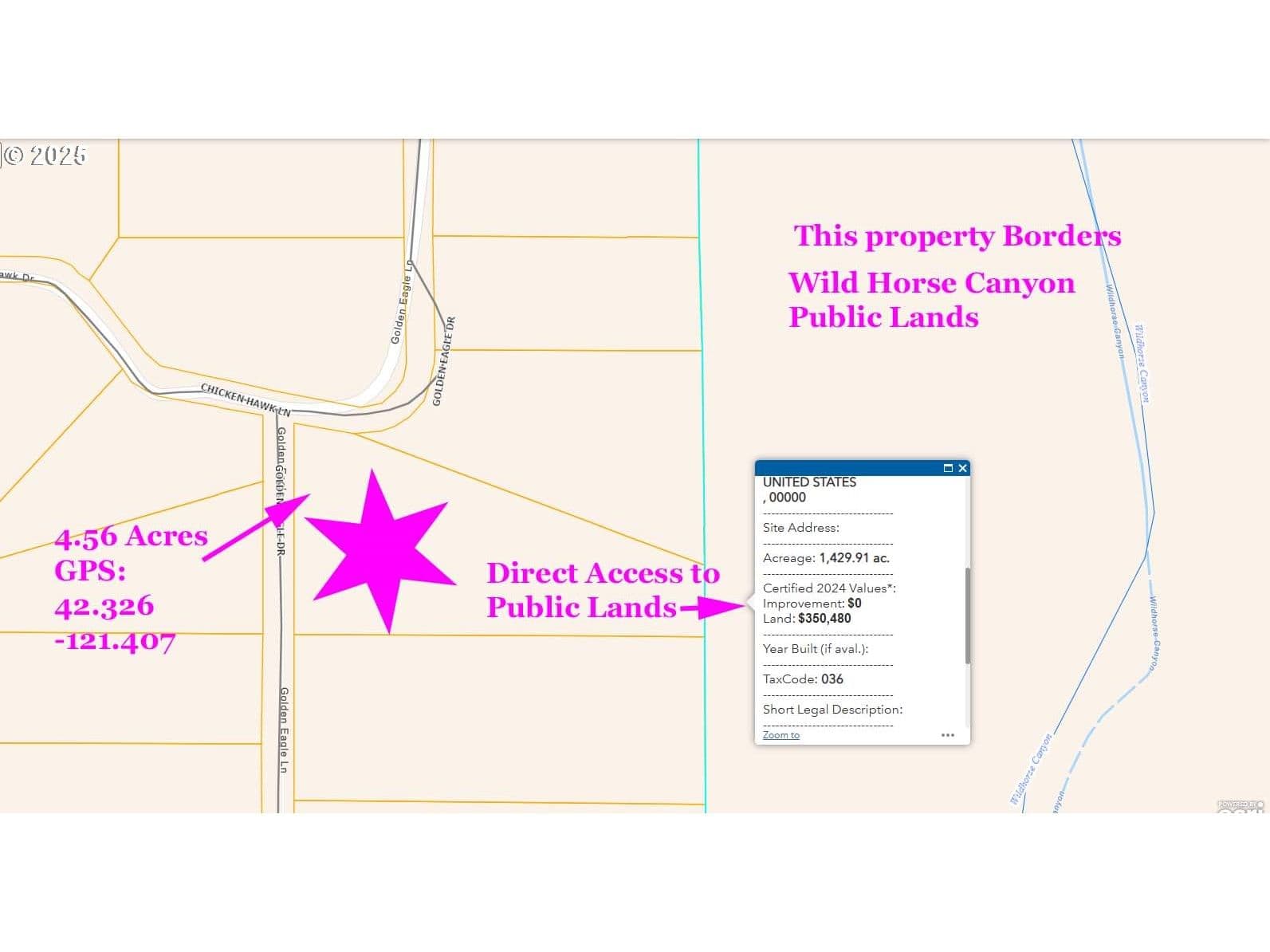 Very nice large 4.56 acres. This parcel is nicely situated, offers spectacular views, and several ideal homesites, captures the sunshine for possible solar energy if desired, and boasts numerous trees and native shrubbery.There is a driveway cut in, and this one is inside the subdivision far enough that you are afforded plenty of seclusion, privacy, and personal space. Great location for a homesite or campsite. Located in Bonanza, Oregon – KFFE, Block 19, Lot 30, where Golden Eagle Drive crosses Chicken Hawk Lane.