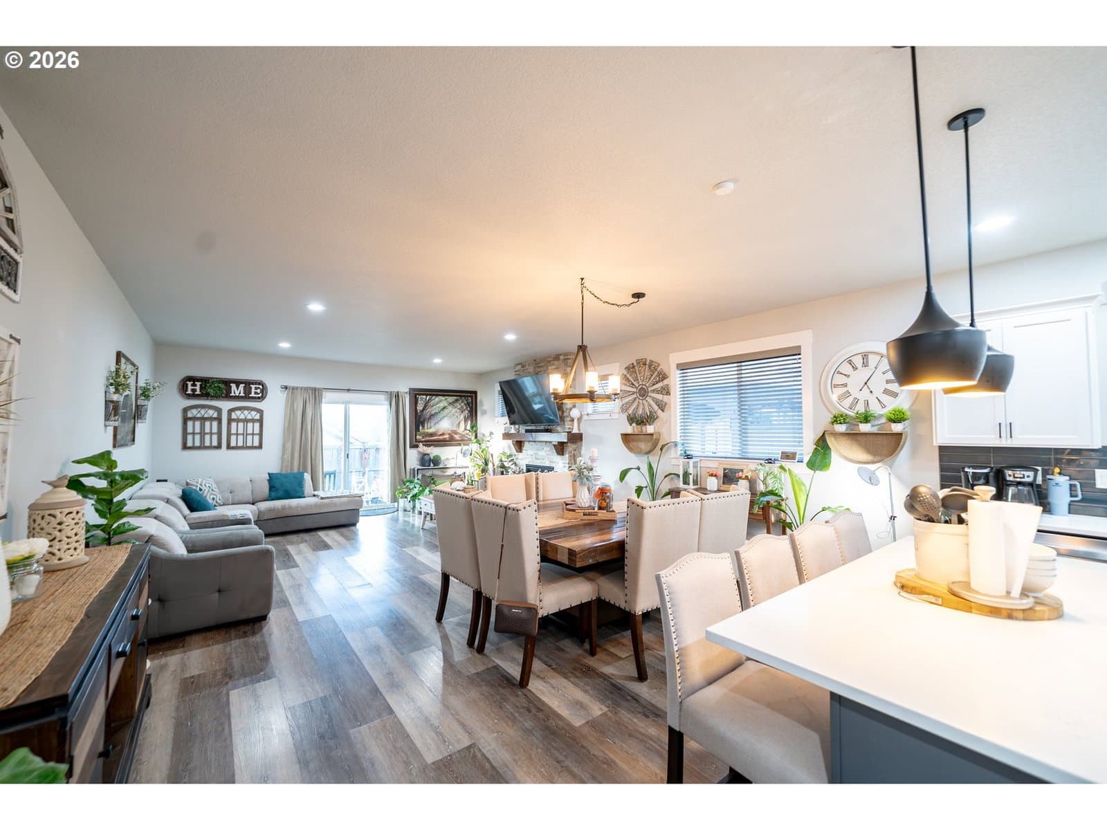 PRIMARY SUITE ON THE MAIN LEVEL highlights this beautifully designed 2,616 sqft home. Open floor plan with quartz countertops, spacious kitchen island, and cozy gas fireplace. Upstairs bonus area offers potential 5th bedroom or office. Enjoy two covered patios, fully fenced backyard, and U/G sprinklers front and back. Plenty of space with a 3-car garage and RV parking. A/C for summer comfort and a layout built for easy living. 4 bedrooms, 3 baths—move-in ready and perfect for entertaining.