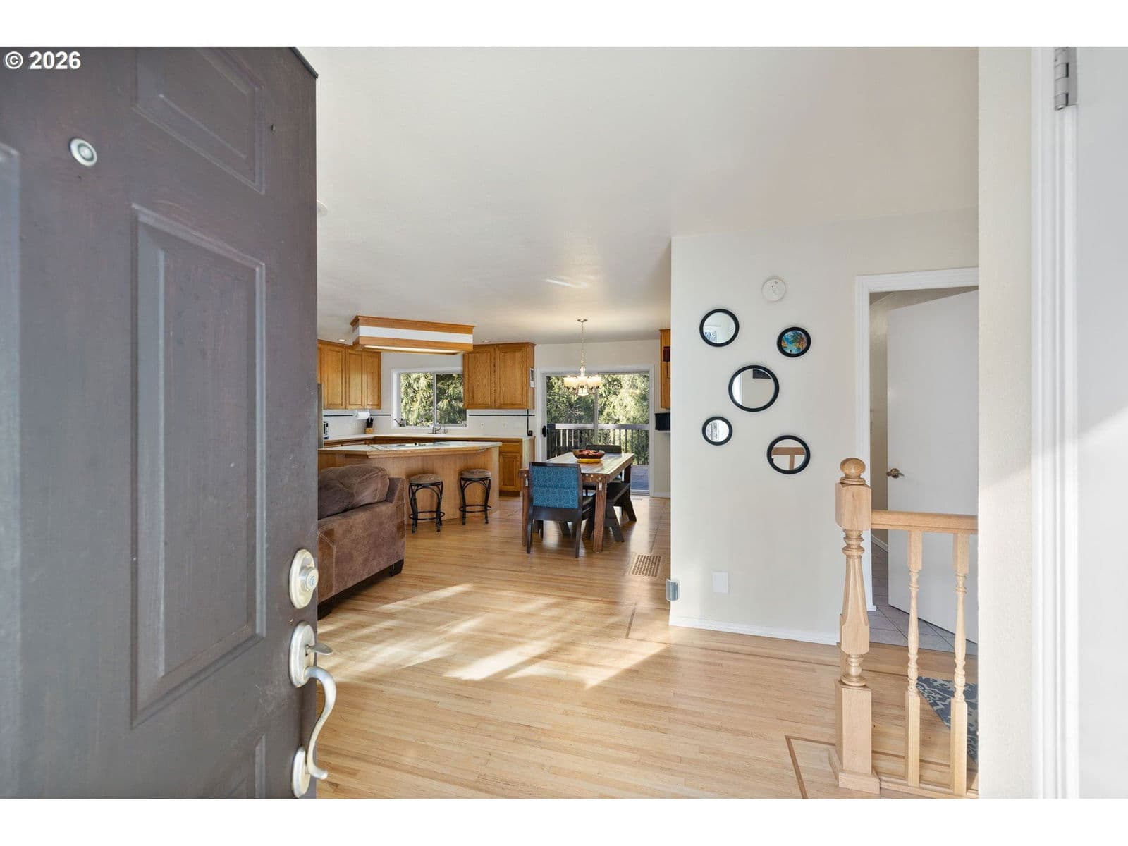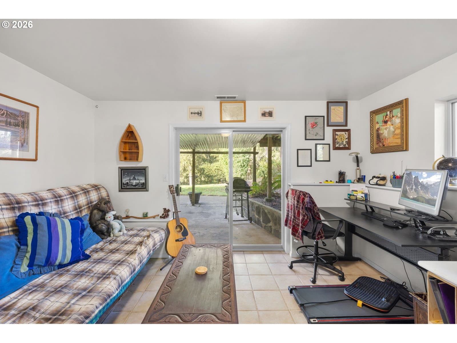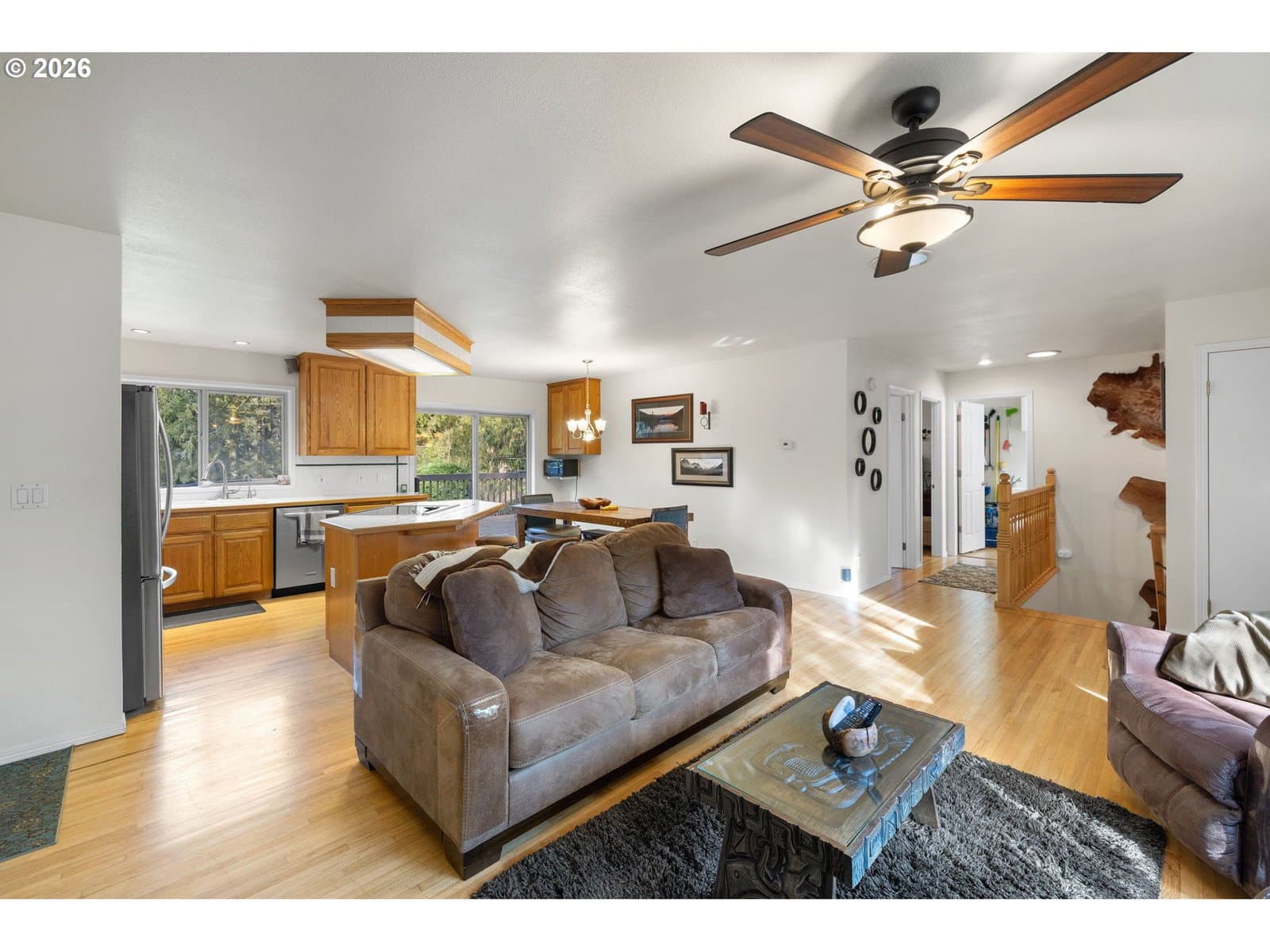 Welcome to this rare, private 2-acre daylight ranch nestled in a serene, tree-surrounded setting along Abernathy Creek. This truly special property offers peaceful seclusion with beautiful natural views in every direction. The main level features a spacious open floor plan, ideal for both everyday living and entertaining. The kitchen includes an island perfect for gatherings, while the primary bedroom on the main level offers an ensuite bathroom and an oversized walk-in closet. A convenient laundry room with a sink is also located on the main floor for ease of living Enjoy the tranquil surroundings from the expansive wraparound deck or through the many large windows that bring the outdoors in. The lower level includes a generous family room with high ceilings, a cozy wood-burning stove, and two additional bedrooms.Outside, you’ll find a gazebo, garden shed, an 18 x 20 aluminum shop with a gravel floor—perfect for hobbies, storage, or projects. This property is a rare blend of privacy, nature, and comfortable living. Cameras on property and showings by appointment only.
