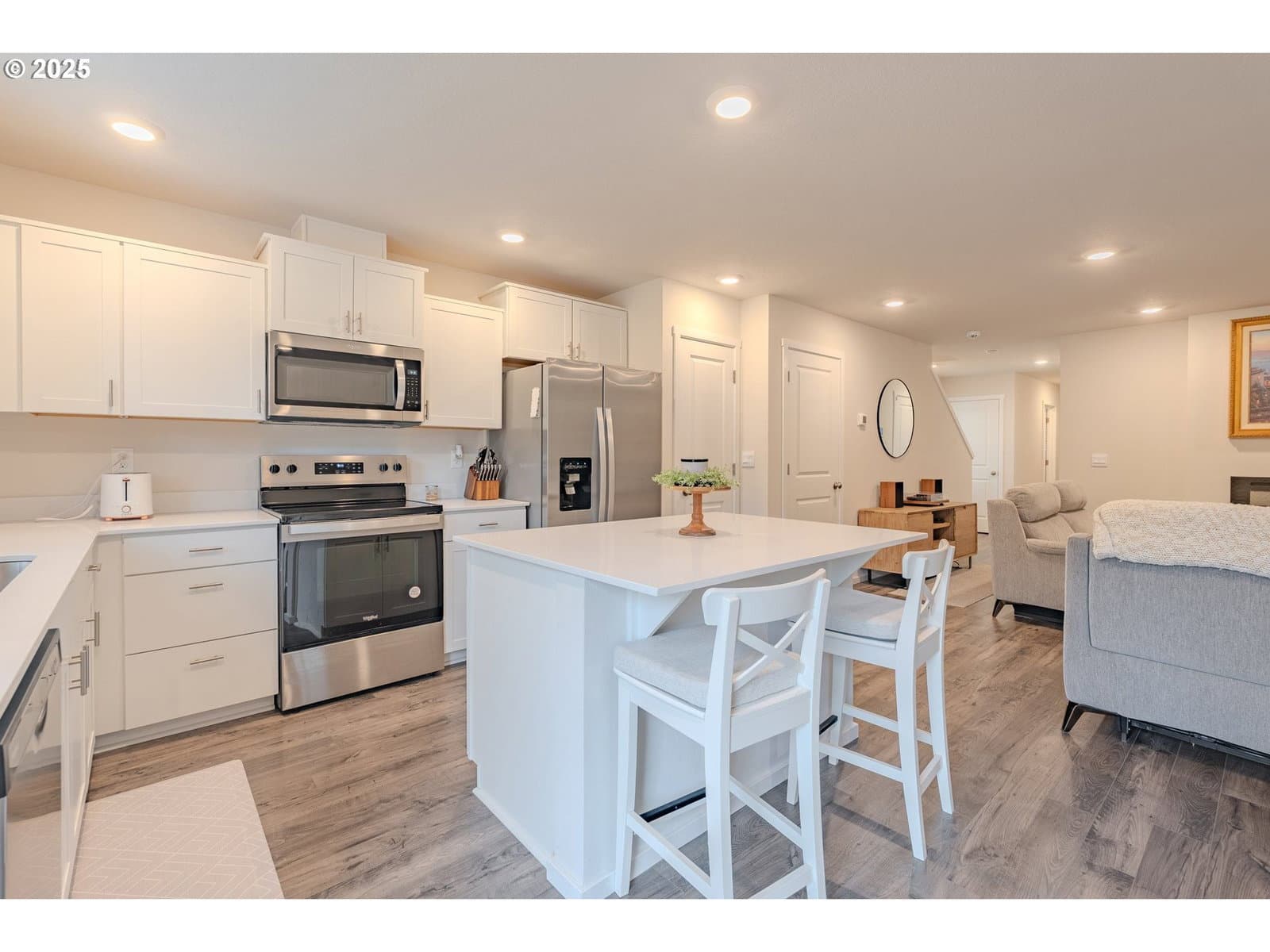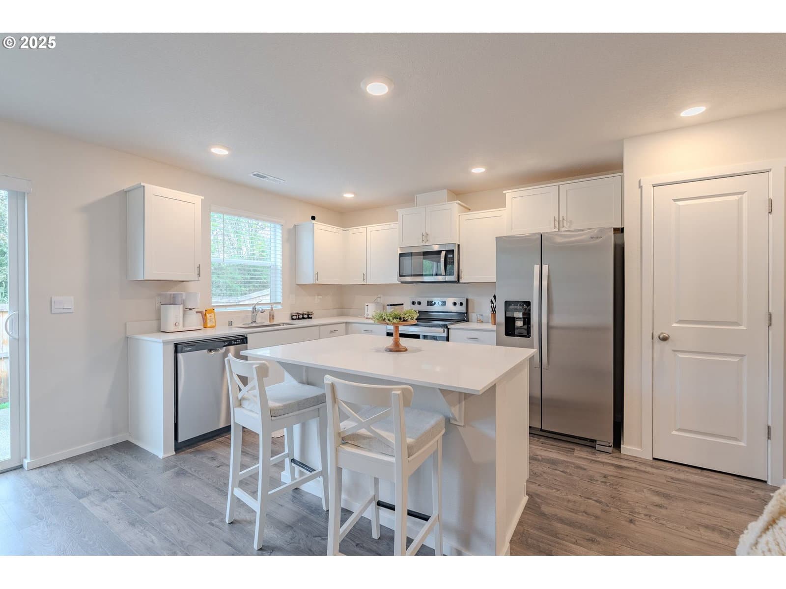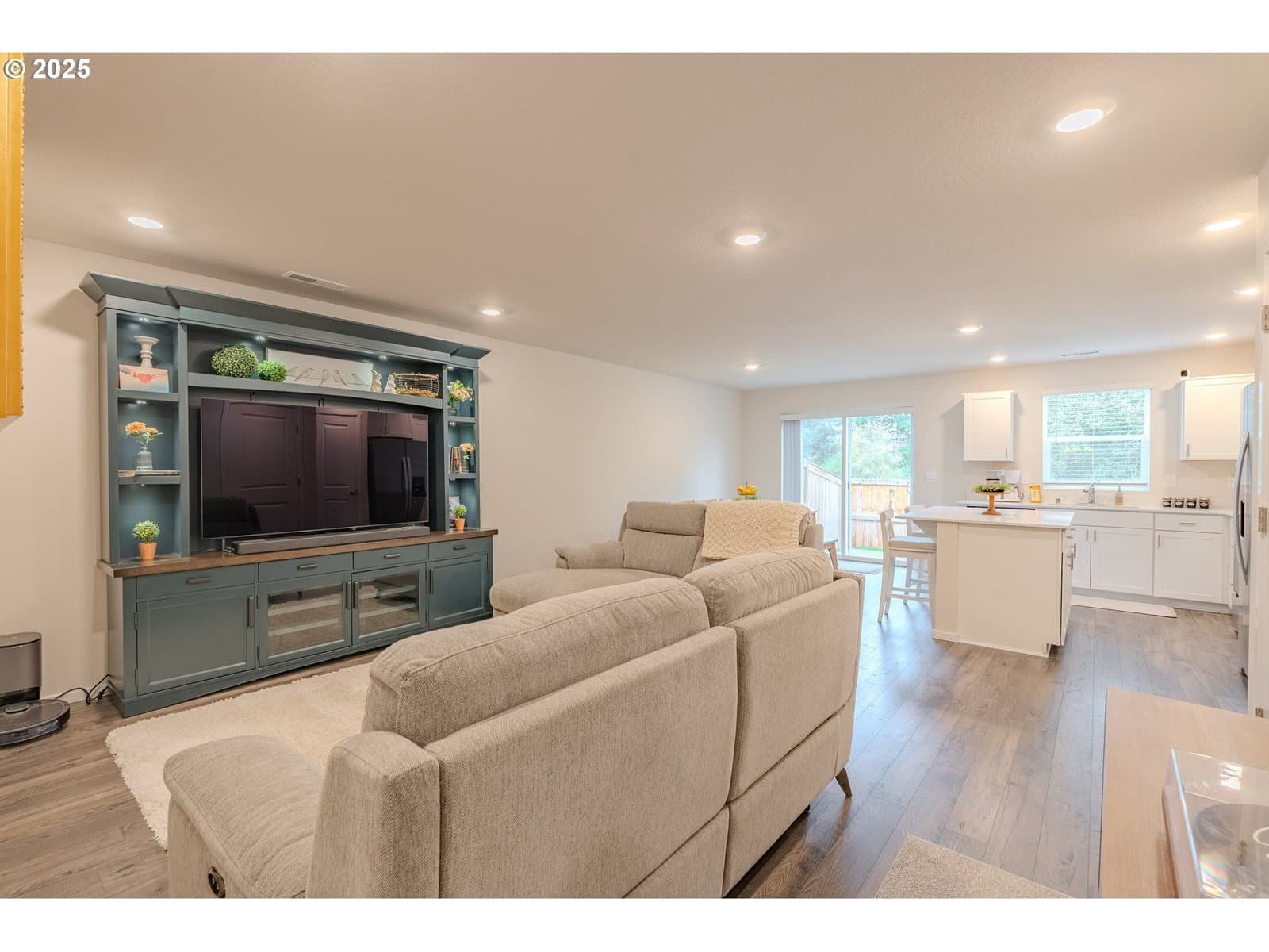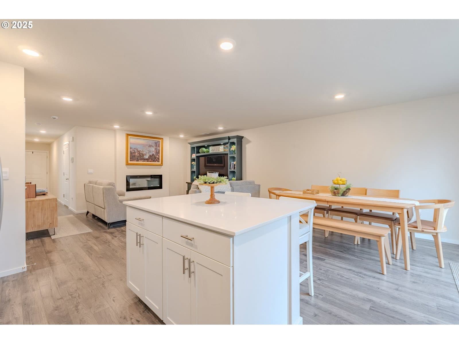 Downpayment and closing costs available- SAVE $35,000 COMPARED TO NEW! Contemporary, chic, and cute as a button! This like-new 2024-built home combines style and function with high-quality finishes throughout and rare privacy and green space. Offering 1,525 sq ft of thoughtfully designed living space, the main floor features an open-concept layout with a comfortable living room highlighted by a sleek, modern electric fireplace that serves as a sophisticated focal point. The adjoining dining area flows seamlessly to the patio, perfect for entertaining or everyday living. The stylish kitchen boasts quartz counters, an island with eating bar, stainless steel appliances, soft-close cabinetry, and a convenient reach-in pantry. Durable luxury vinyl plank flooring adds warmth and easy-care appeal, while a large storage closet under the stairs provides practical bonus space. Upstairs, discover a spacious loft/flex area, three bedrooms, and a centrally located laundry closet. The vaulted owner’s suite offers a private bath and walk-in closet. Outdoors, enjoy a fully-fenced backyard, complete with patio – and, beyond the peaceful view of trees, enjoy added privacy with no rear neighbors.