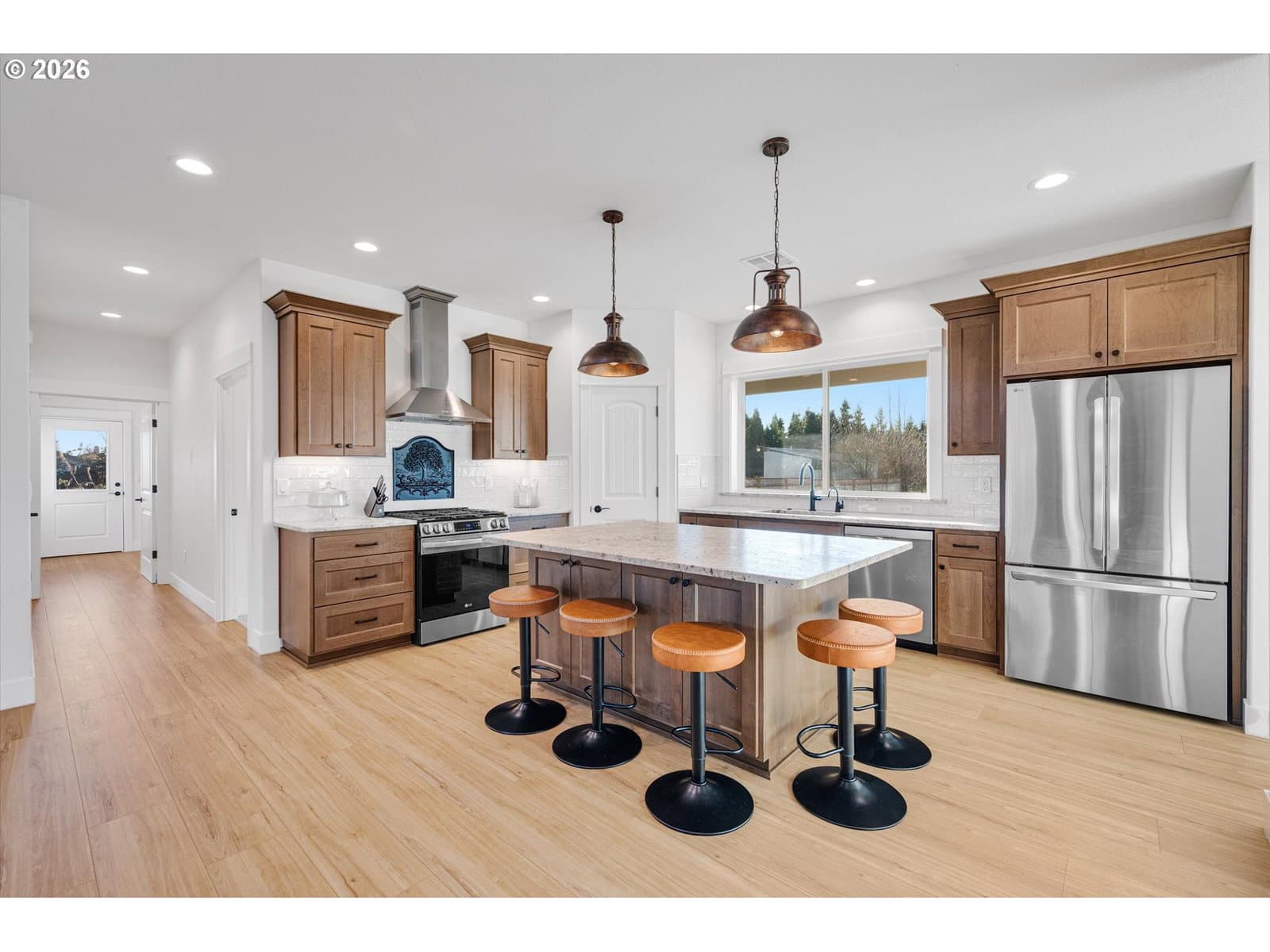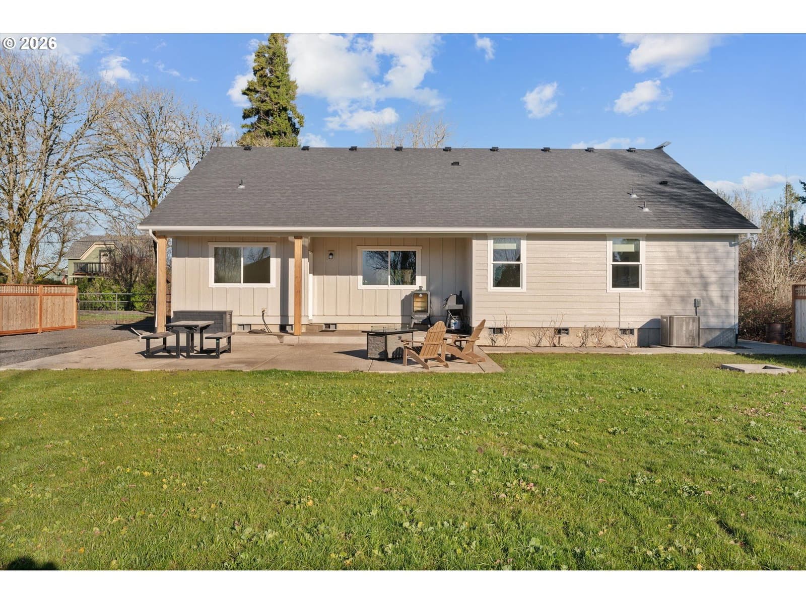 Nestled on a peaceful half-acre with beautiful valley views, this nearly new, single-level home blends easy country living with modern comfort and style. Vaulted ceilings and a light-filled great room create a welcoming, open feel, while tasteful, on-trend finishes carry throughout the home. The heart of the home is the stunning kitchen, featuring granite countertops, a generous island for gathering, and a convenient pantry—perfect for both everyday living and entertaining.The spacious primary suite offers a quiet retreat with a well-sized walk-in closet and a beautifully finished bath, complete with dual sinks and a large tiled walk-in shower. Two additional bedrooms are thoughtfully situated on the opposite side of the home, providing privacy and flexibility for guests, office space, or hobbies.Step outside and enjoy the calm of country surroundings without the maintenance of acreage. The large patio space provides an abundance of room for entertaining and a brand-new pole barn offers ideal space for RV storage, a workshop, or creative pursuits. The circular driveway provides for easy access and additional parking. With room to garden, grow, and spread out, this property offers the charm of rural living just minutes to Mac and is located in the Amity School District. Immaculately maintained and well crafted by a renowned builder—this is a special opportunity for comfortable, well-planned country living with modern finishes.
