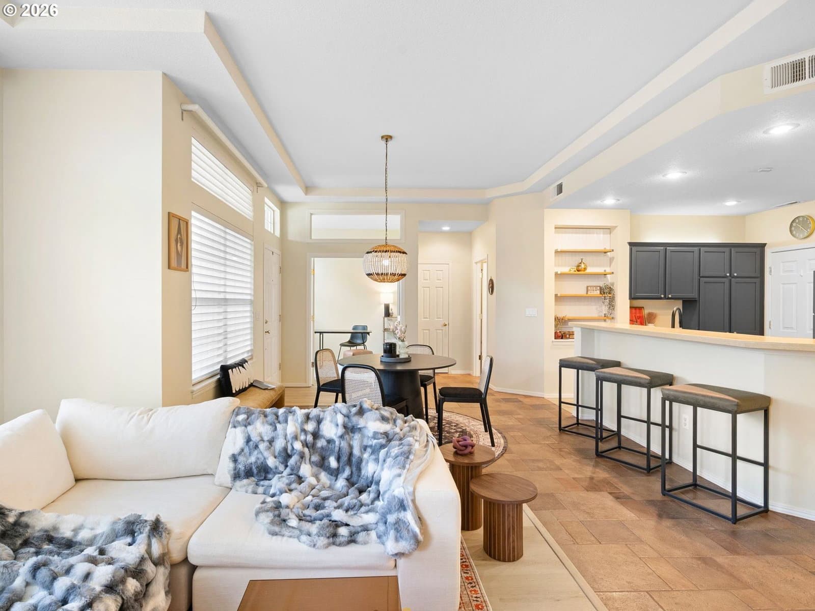 Welcome to this coveted ground-level condo in the heart of Orenco Station, one of Orenco Station’s most desirable communities. Thoughtfully updated and move-in ready, this home blends modern upgrades with effortless, walkable living in Hillsboro.Step inside to find soaring 12-foot tray ceilings and abundant natural light pouring through oversized windows, creating an airy and inviting atmosphere. The fully refreshed kitchen features brand-new GE appliances—including a gas range, microwave, dishwasher, and refrigerator—along with freshly painted cabinetry, updated hardware, and a sleek new faucet. New luxury vinyl plank flooring and stylish light fixtures run throughout, giving the home a clean, contemporary feel.The layout offers both comfort and functionality, with a dedicated laundry room complete with shelving and closet space, plus built-in solid wood storage in the garage. Step outside to your private patio—perfect for morning coffee or evening unwinding.Major exterior updates provide peace of mind, including a newer roof, gutters, and exterior paint (2020), along with a recently resurfaced pool (2024). Inside, enjoy premium upgrades like a California Closet system, surround sound in the living and primary spaces, Hunter Douglas blinds, and an alarm system.As part of the HOA, residents enjoy amenities such as a pool, hot tub, tennis courts, and convenient on-street parking. Located just steps from the shops, dining, and parks of Orenco Station—and minutes from the MAX Light Rail—this home offers an unbeatable combination of comfort, style, and accessibility. With easy access to major employers like Inteland Nike, plus nearby green spaces like Orenco Woods Nature Park, this location truly has it all.Don’t miss this rare opportunity to own a beautifully updated, ground-level condo in one of Hillsboro’s most sought-after neighborhoods.