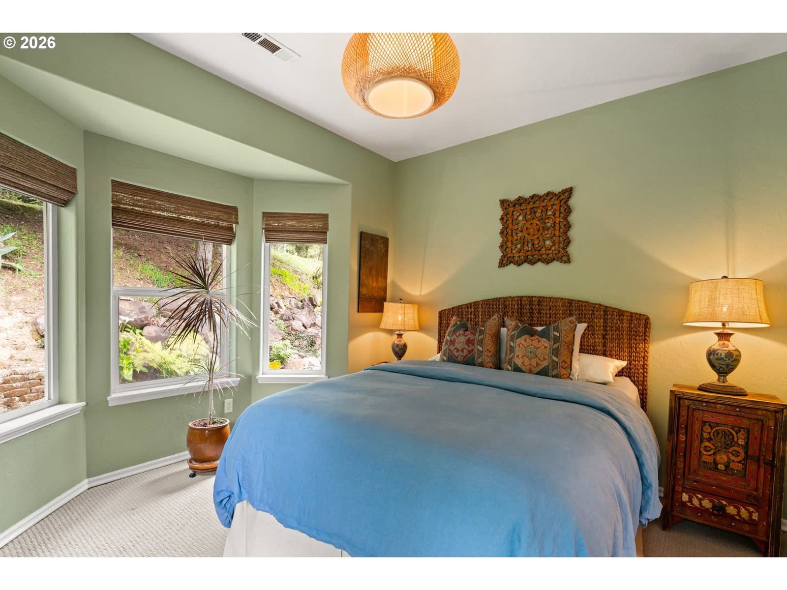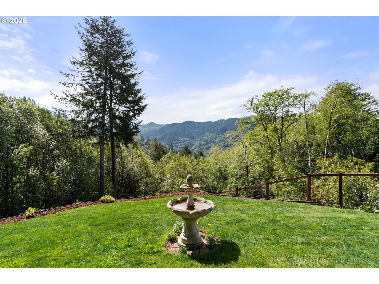 Nestled in one of the area’s most breathtaking settings, just 5 minutes from the city center and 2 minutes to river beaches, this private 1.72-acre retreat offers spectacular mountain, redwood, and valley views. The mostly flat, fully usable land is thoughtfully landscaped with manicured, fenced verdant gardens protected from deer, mature palm trees, travertine flagstone walkways, ambient lighting, and an irrigation system for effortless care. Relax to the soothing sounds of the creek, creating a true sanctuary.The 1,666 sq ft home features 3 bedrooms and 2.5 bathrooms with an open-concept design. A custom-built gourmet kitchen with a large island, Taj Mahal countertops, and stainless steel appliances flows seamlessly into the dining and living areas, centered around a cozy fireplace. Expansive windows fill the home with natural light and frame beautiful garden views.The spacious primary suite offers a spa-inspired bathroom with a custom double vanity surrounded by mirrors with integrated lighting, oversized steam shower with bench, walk-in closet, and private water closet—evoking a luxury resort experience. Guest bedrooms share a beautifully designed shower with handcrafted green tiles, seagrass wallpaper, designer wall sconces, and generous storage.Additional highlights include abundant storage throughout, an oversized 2-car garage, and a climate-controlled attic with potential to be converted into additional living space. A truly one-of-a-kind lifestyle property. For more info, please open the link below.