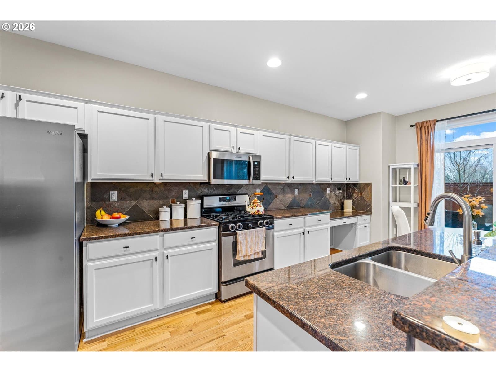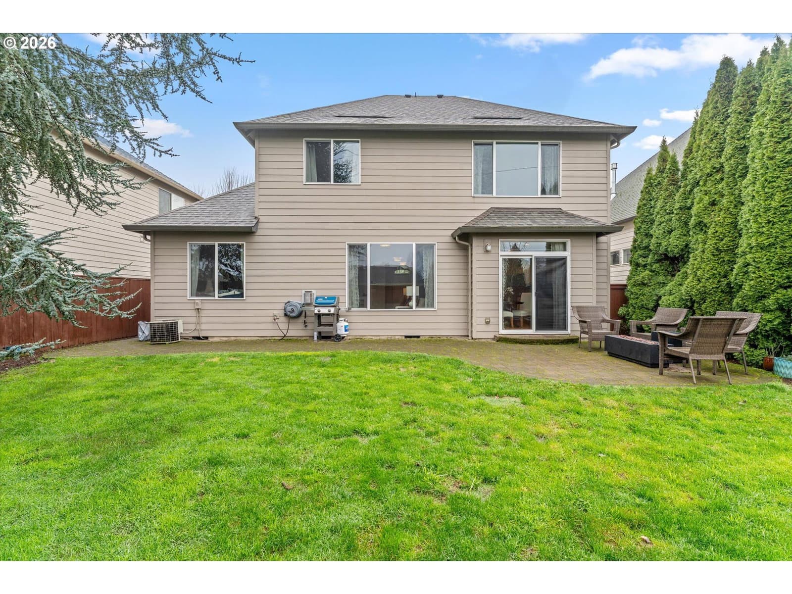 Don't Miss this gem backing to a greenspace in sought after Sherwood! New roof installed in 2025 with transferable warranty. Hot water heater replaced in 2025. The main level boasts recently refinished beautiful oak hardwood floors throughout the living, dining, kitchen & family rooms. The kitchen features granite countertops, gas range, island, eat-at bar, pantry, built-in desk and nook. Office or bedroom on main level. The primary suite includes a soaking tub, shower, double sinks, and a walk-in closet. Upper level includes a utility room w/sink, loft, and 2 additional bedrooms. Step outside to a private, fenced backyard backing to a greenbelt, complete with a custom pavered patio. Enjoy local dining and shopping just minutes away, plus easy Hwy 99 access.