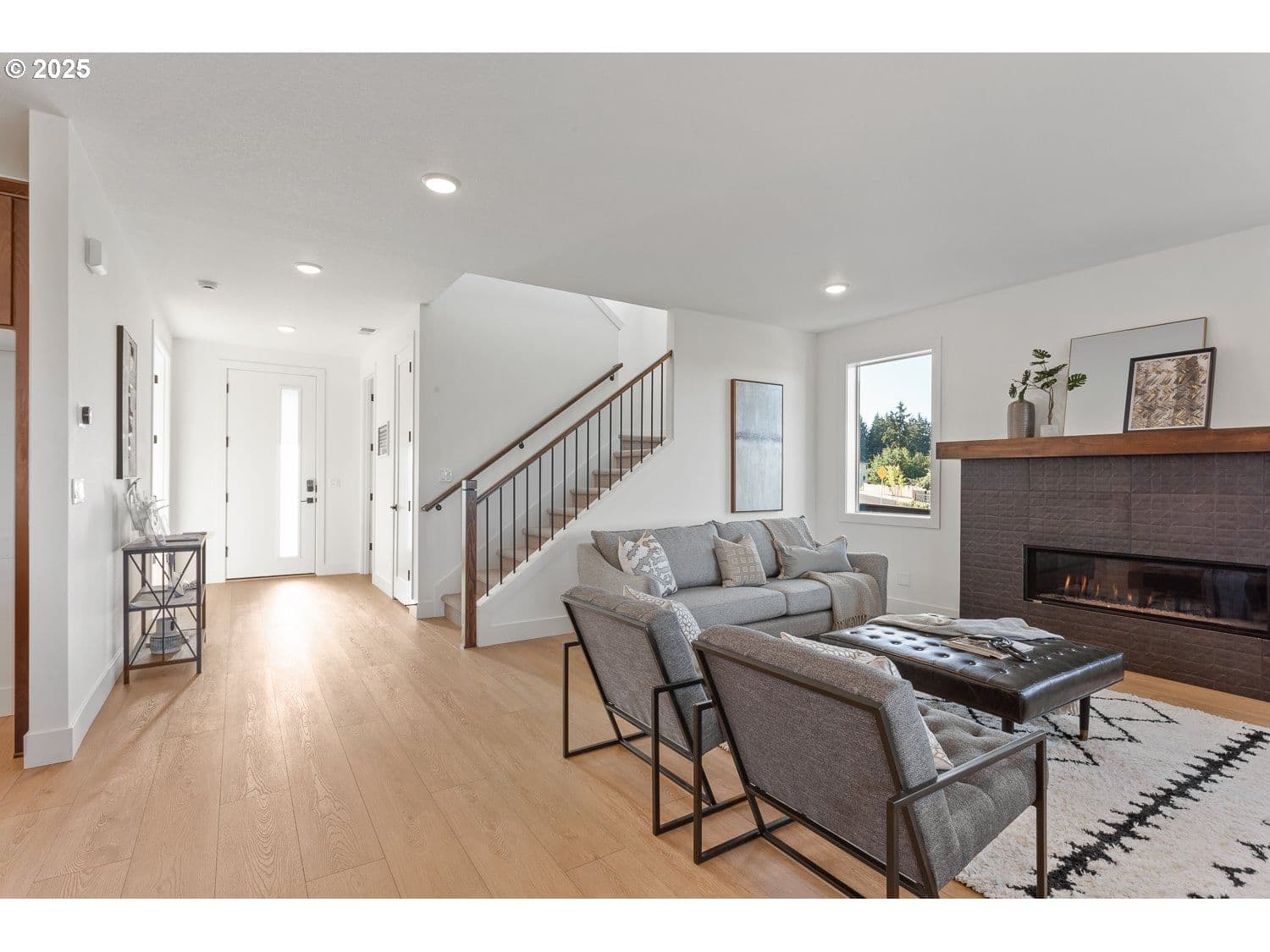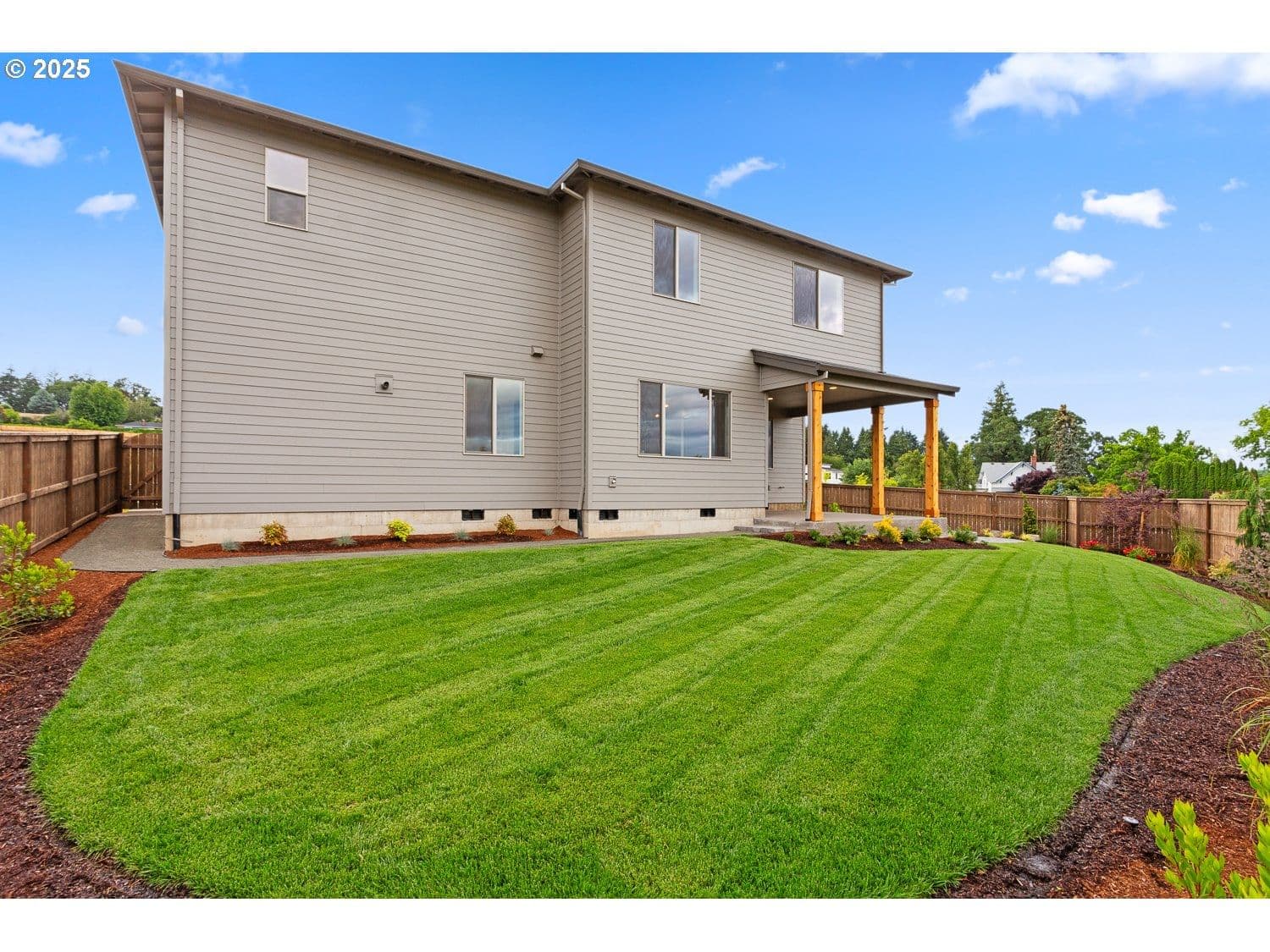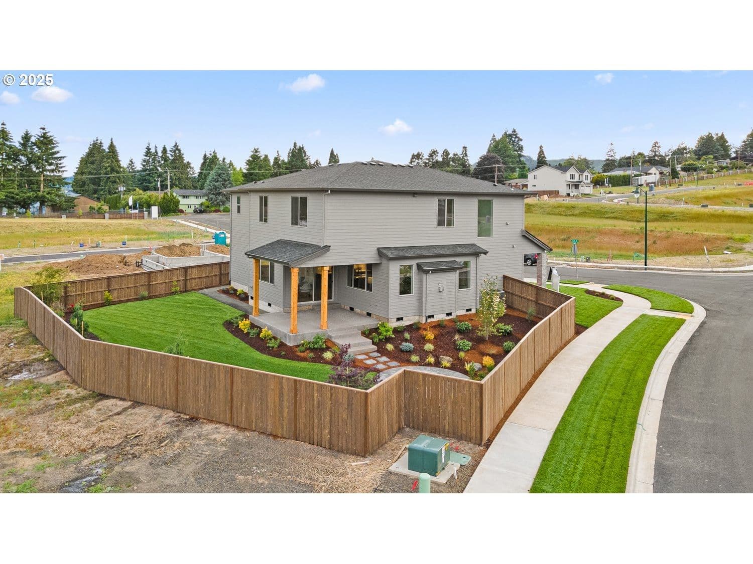 This open great room plan features generous living space appointed with mission walnut stained cabinetry, quartz countertops with undermount sinks, a floating gas fireplace with stained box beam mantle, luxury vinyl flooring and Whirlpool stainless steel appliances. The main level features a den/5th bedroom with closet and a full bath. Upstairs you will find a spacious primary suite with a roomy walk-in closet and adjoining bath with all tile shower and soaking tub plus 3 additional bedrooms and large bonus room. Earth Advantage Certified!