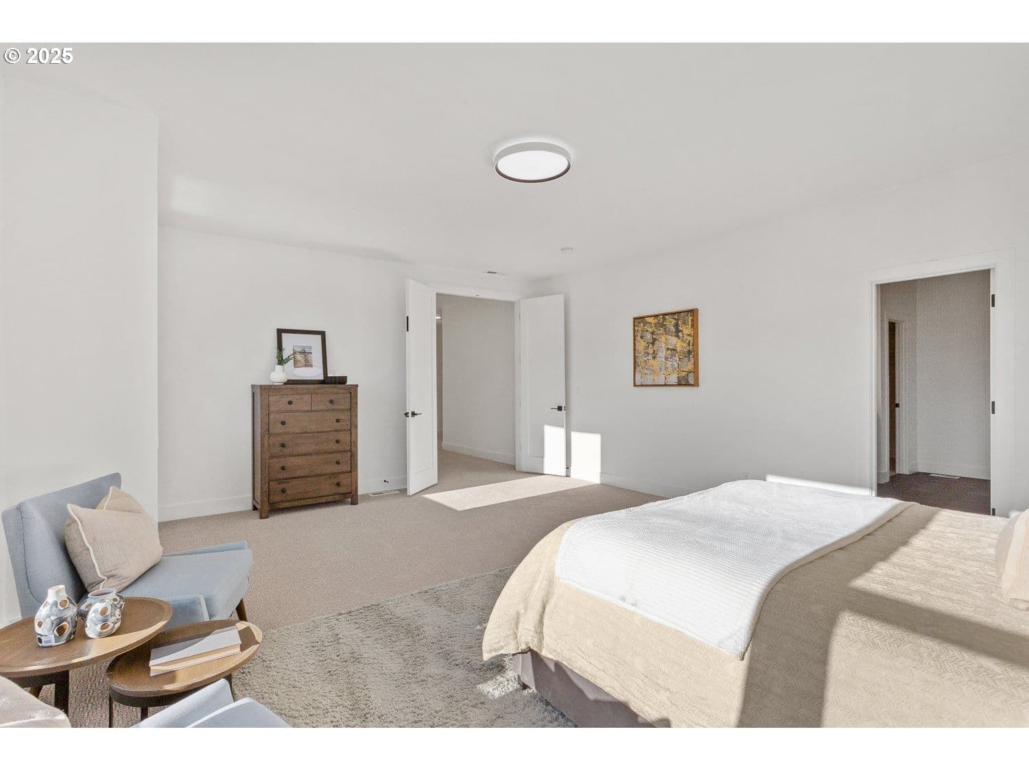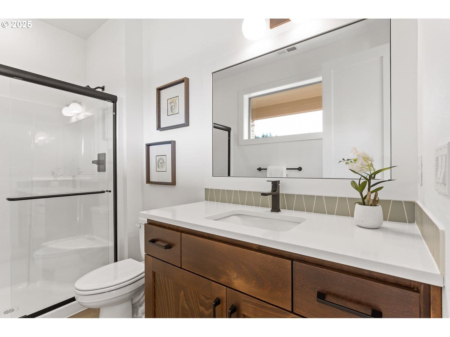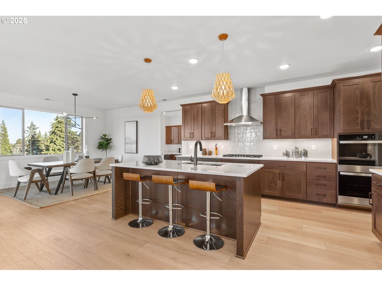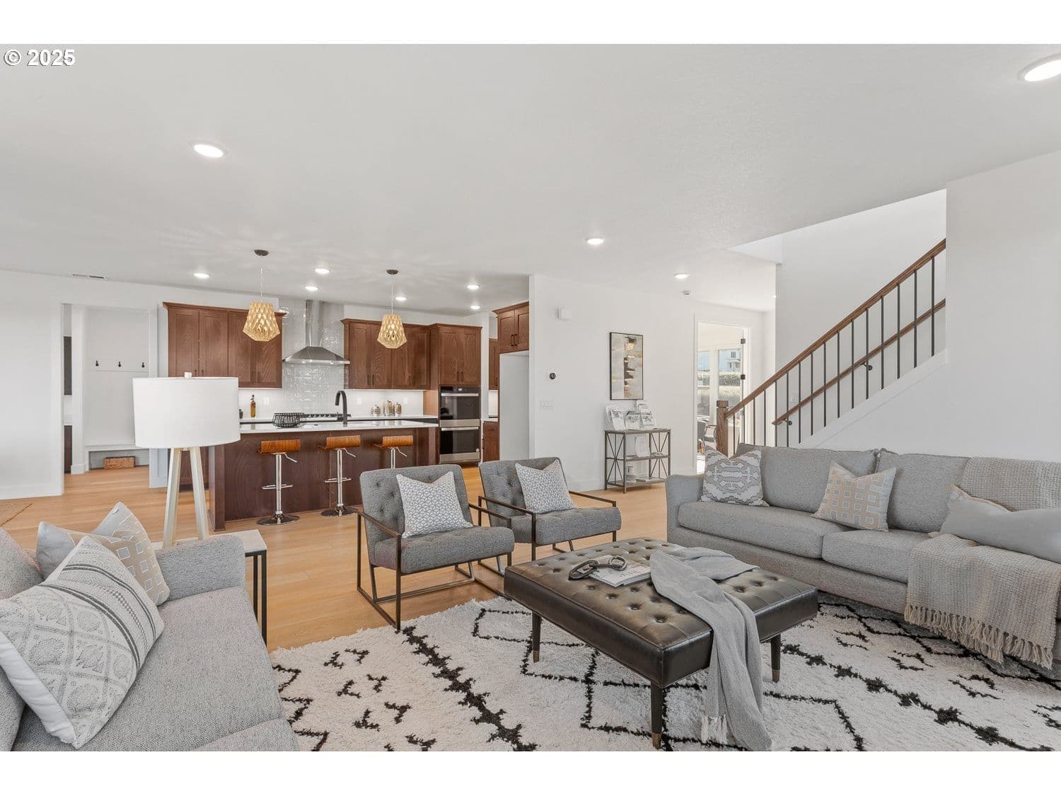 This open great room plan features generous living space appointed with mission walnut stained cabinetry, quartz countertops with undermount sinks, a floating gas fireplace with stained box beam mantle, luxury vinyl flooring and Whirlpool stainless steel appliances. The main level features a den/5th bedroom with closet and a full bath. Upstairs you will find a spacious primary suite with a roomy walk-in closet and adjoining bath with all tile shower and soaking tub plus 3 additional bedrooms and large bonus room. Earth Advantage Certified!
