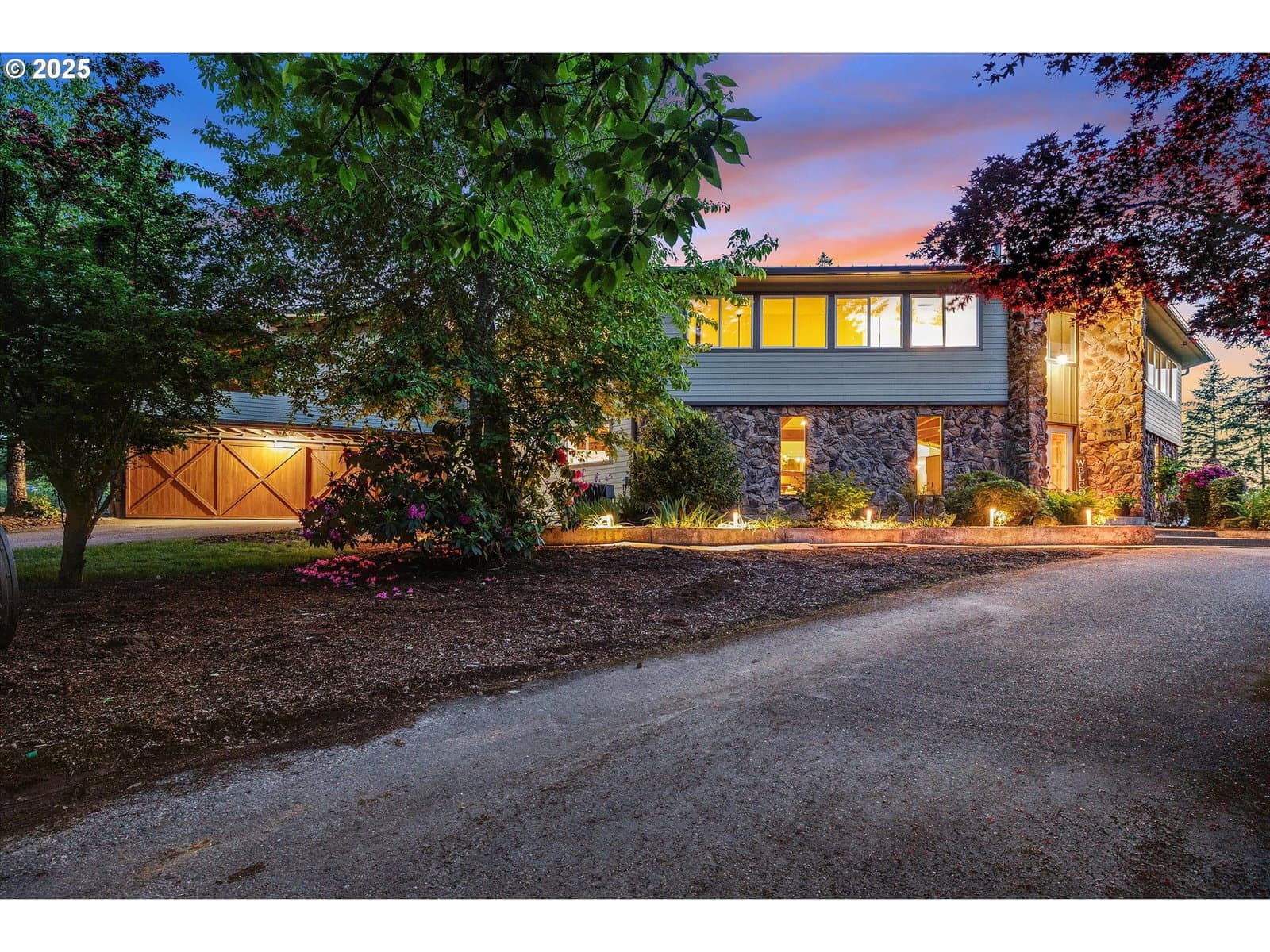HUGE PRICE REDUCTION! Open House Saturday 3/11 and Sunday 3/12 from 2:00-4:00 !!This exceptional 6,500+ square foot custom-built residence offers a rare blend of architectural distinction and lifestyle amenities. Designed in a unique octagonal layout, the home centers around a private courtyard with easy access that enhances indoor-outdoor living. The spacious interior features six bedrooms and five bathrooms, including a generous primary suite. Beautiful wood floors, complemented by vaulted ceilings and exposed beams lends an elegant, rustic atmosphere. The upstairs boasts an enormous family room for entertaining or stretching out, a large private gym and a covered porch with batting cage. Situated on six hilltop acres with sweeping views, the property includes a swimming pool with deck, hot tub, a 50x30 sport court, and a four-stall barn making relaxation and enjoyment readily available. On the practical side, energy-efficient systems including high-efficiency heat pumps, a wood furnace, and an advanced solar panel system, ensure sustainability and cost savings. A huge garage and attached workshop gives storage, a place to tinker, and one more reason to call this place home. This is a rare opportunity to own a property that offers privacy, versatility, and a distinctive lifestyle setting.