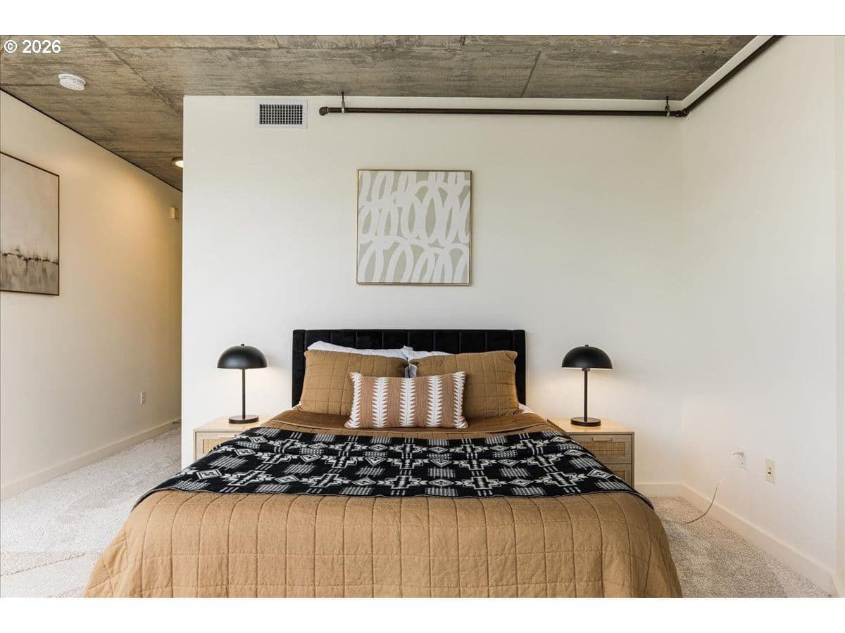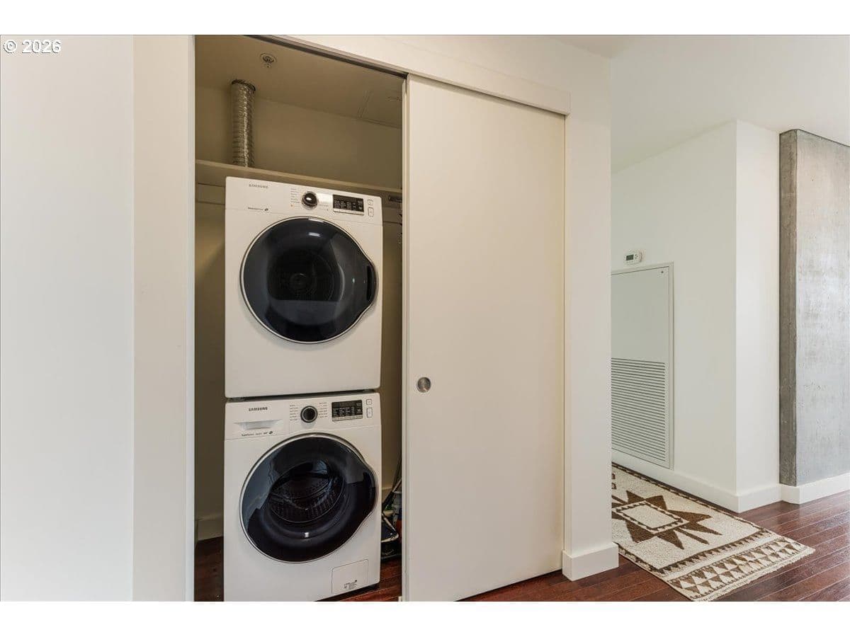 Truly live among all the action when you live at The Civic, a LEED Gold certified building! This Northeast facing 2 bedroom, 2 bathroom unit is a smashing deal, with cherry wood floors, walls of windows (don't worry, the primary bedroom has blackout blinds!), a balcony, 2 deeded parking spaces in the secure garage and 24-hour concierge services. Custom built in storage in the entryway is an organizer's dream, and this unit is immaculate! Enjoy your rockstar parking and access to Timbers and Thorns games, PLUS concerts at Providence Park, the Multnomah Athletic Club, Zupan's, downtown the Pearl & Alphabet Districts and the list goes on! You must check it out!