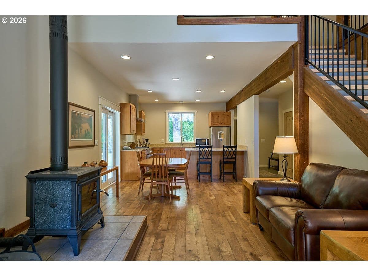 Turn-key primary home or ideal second home getaway on a private, forested 2-acre parcel with views of rugged mountains across the canyon. Enjoy frequent wildlife sightings, including mountain goats, and easy access to trailheads leading into the Eagle Cap Wilderness. Built in 2016, the home features vaulted ceilings, distressed hickory flooring, knotty alder cabinetry and doors, and a tiled entry with coat and boot area. The kitchen includes a KitchenAid refrigerator and propane range with vent hood, and quartz countertops.Outdoor living is exceptional with Cumaru hardwood decks, including a 10x8 covered BBQ deck off the kitchen, a 12x30 covered deck with mountain views, and a 6x8 covered upstairs balcony. The living room offers a tile hearth with a Hearthstone soapstone wood stove. Red oak stairs with custom wrought iron railing lead to a 618 SF loft with closet, eave storage, and covered balcony, ideal as a second bedroom or additional living space.The main level includes a spacious bathroom with 18” tile flooring, tub/shower, water closet, and a separate laundry room with storage, plumbed for a sink. The 936 SF shop features a concrete floor, 12’ ceilings, 10H x 9W door, full insulation, and a wide staircase to a finished 504 SF loft with windows for natural light and ventilation, perfect for storage, bunkhouse, or studio space. A 50-amp outlet is in place for a heater.Additional features include access to the underside of the home for ample storage, low-maintenance landscaping with a small lawn near the hot tub, and a structure ready to be finished as an outdoor kitchen. Fuel reduction has been completed on the beautiful wooded acreage. Community riverfront access, community water system with fire hydrants, and private septic.