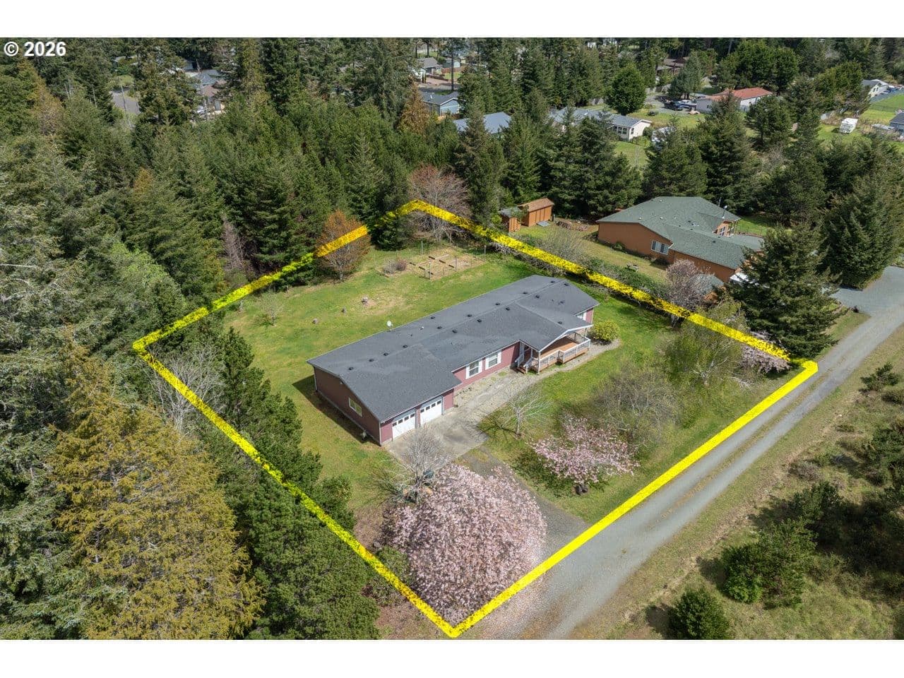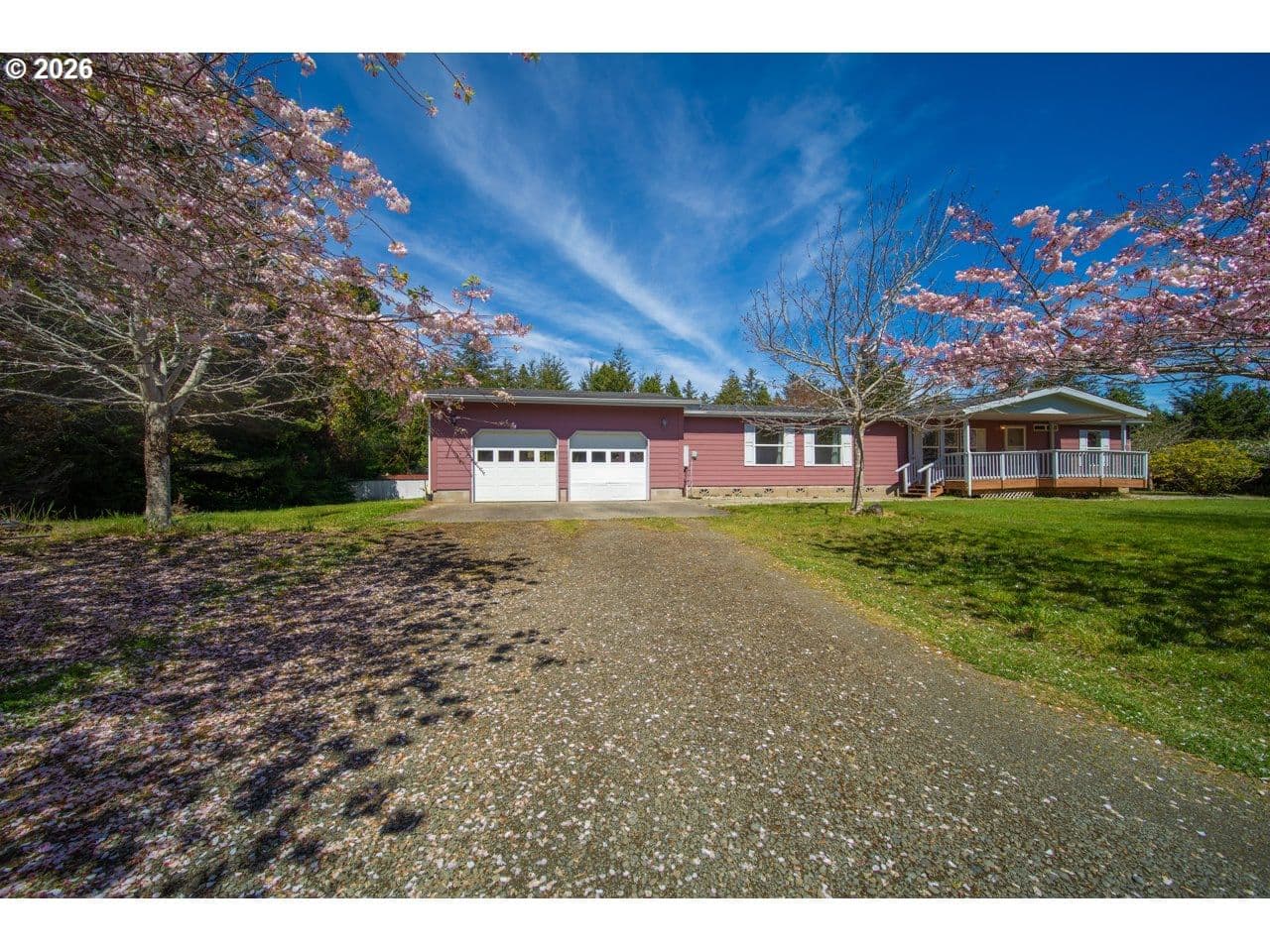 BANDON COUNTRY HOME SWEET HOME! At the end of the lane on the warm side of town yet minutes to everything Bandon has to offer, this Marlette 1782 sq. ft. home on .62 acre with many amenities: 3 bedrooms plus a bonus office or hobby room, an open floor plan with a living room plus a family room, a master suite with a bonus office area, walk-in closet & its own bathroom with a step in shower & skylight, a laundry room with Kenmore frontloading washer & dryer, lots of built-in cabinetry, shelves & storage, a dreamy south facing deck, fiber cement siding, an oversize 2 car garage with a workbench, 2 garage door openers & a handicap ramp, a huge, flat, useable yard with a fenced garden, raised beds, blueberries, fruit trees, apple & plum & drop dead gorgeous flowering perennials!
