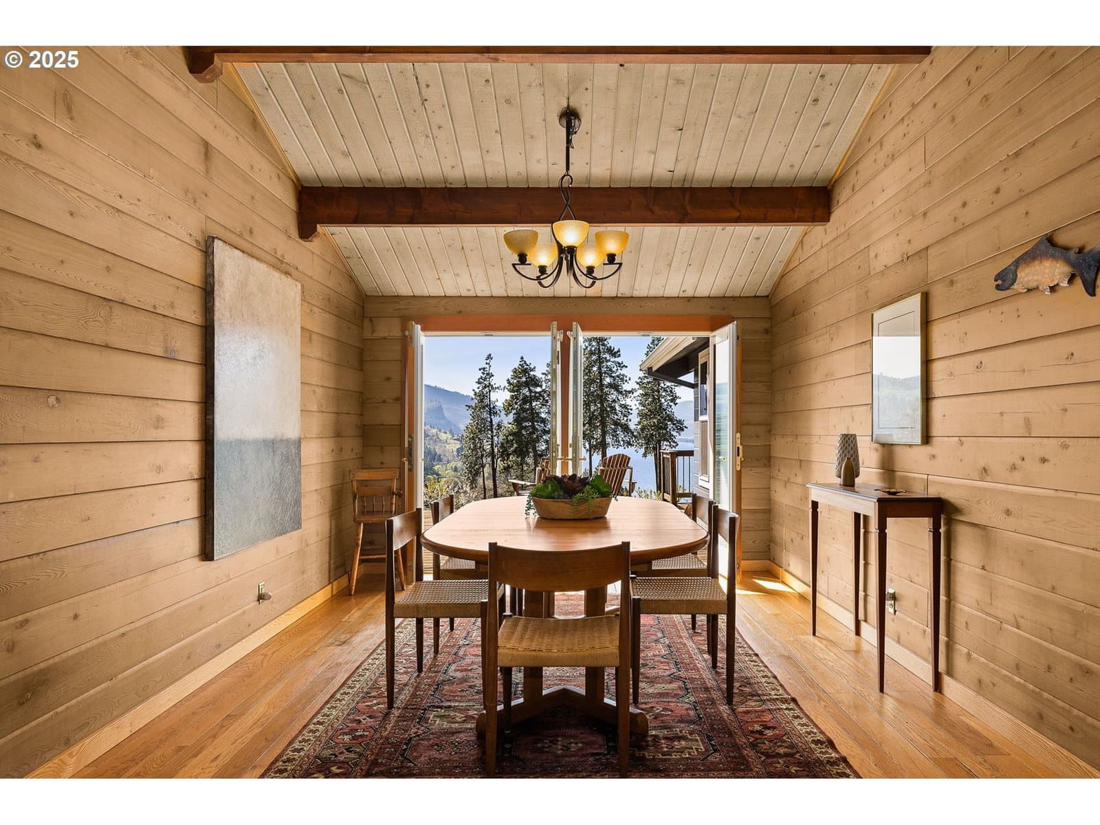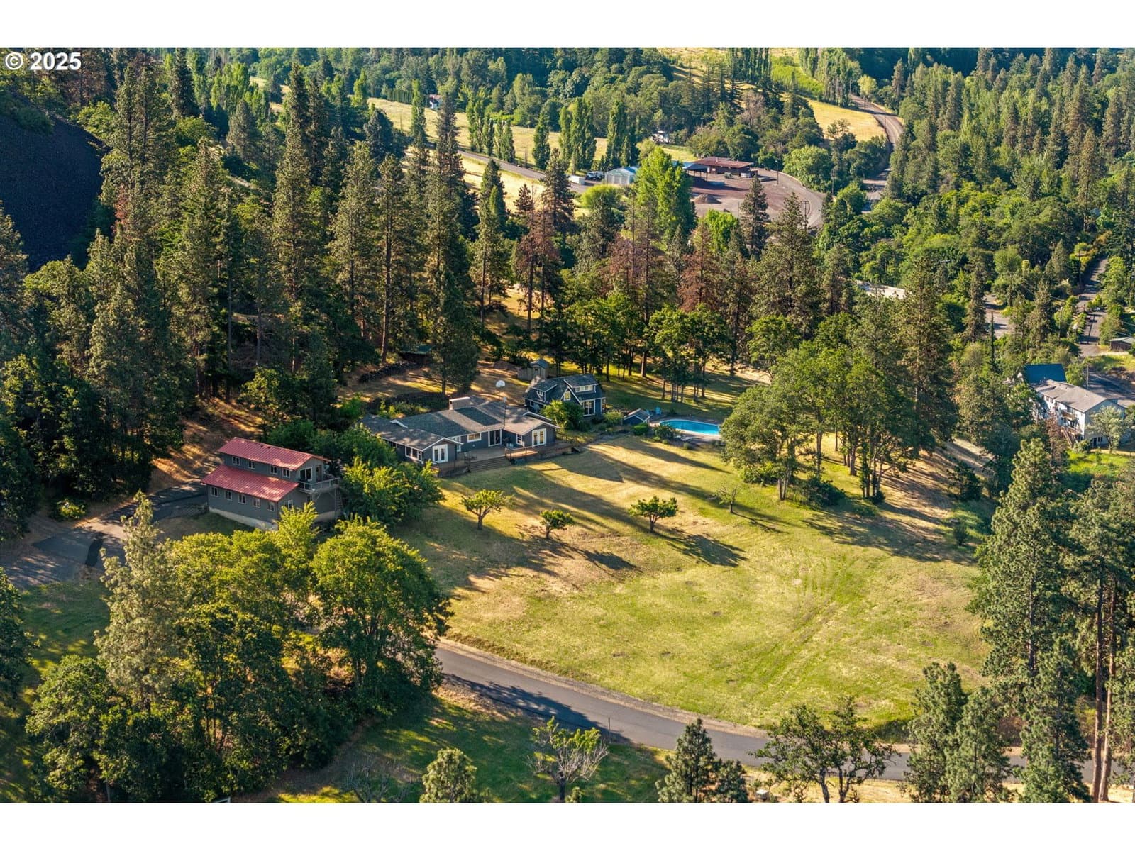 A dream retreat in the heart of the Columbia River Gorge! Set on ~7.64 peaceful acres, this one-of-a-kind property captures breathtaking panoramic views of the Columbia River, surrounded by blooming cherry trees, mature evergreens, green pastures and rolling hills. Enjoy the feeling of a private escape while being just minutes from downtown Mosier. Located within city limits and connected to public utilities, this property offers the perfect balance countryside charm with modern amenities. The main home is 4 bedrooms, 2 baths across ~2,278 square feet of comfortable single level, living space. The home showcases timeless mid-century modern character with cedar siding, vaulted, beamed ceilings, hardwood floors and charming built ins. A dramatic floor-to-ceiling stone fireplace anchors the living room, creating a warm and inviting focal point. The kitchen opens to an expansive deck, ideal for entertaining or relaxing while taking in the stunning Columbia River views. Designed for hosting and multi-use living, the property includes an in-ground pool with a cozy 1bed, 1bath pool house, perfect for guests or private retreats. A detached barn garage features an upstairs 1-bedroom apartment with its own deck to enjoy the views, currently rented and ideal for extended family, supplemental income or living quarters for on-site property manager or grounds keeper. The barn also includes a full bathroom and flexible studio space, well-suited for a home office or creative flex space. Plus ample storage for cars, equipment and gear. Find peace, privacy, and room to roam, all within close proximity to the town of Mosier at this exceptional, rare property.