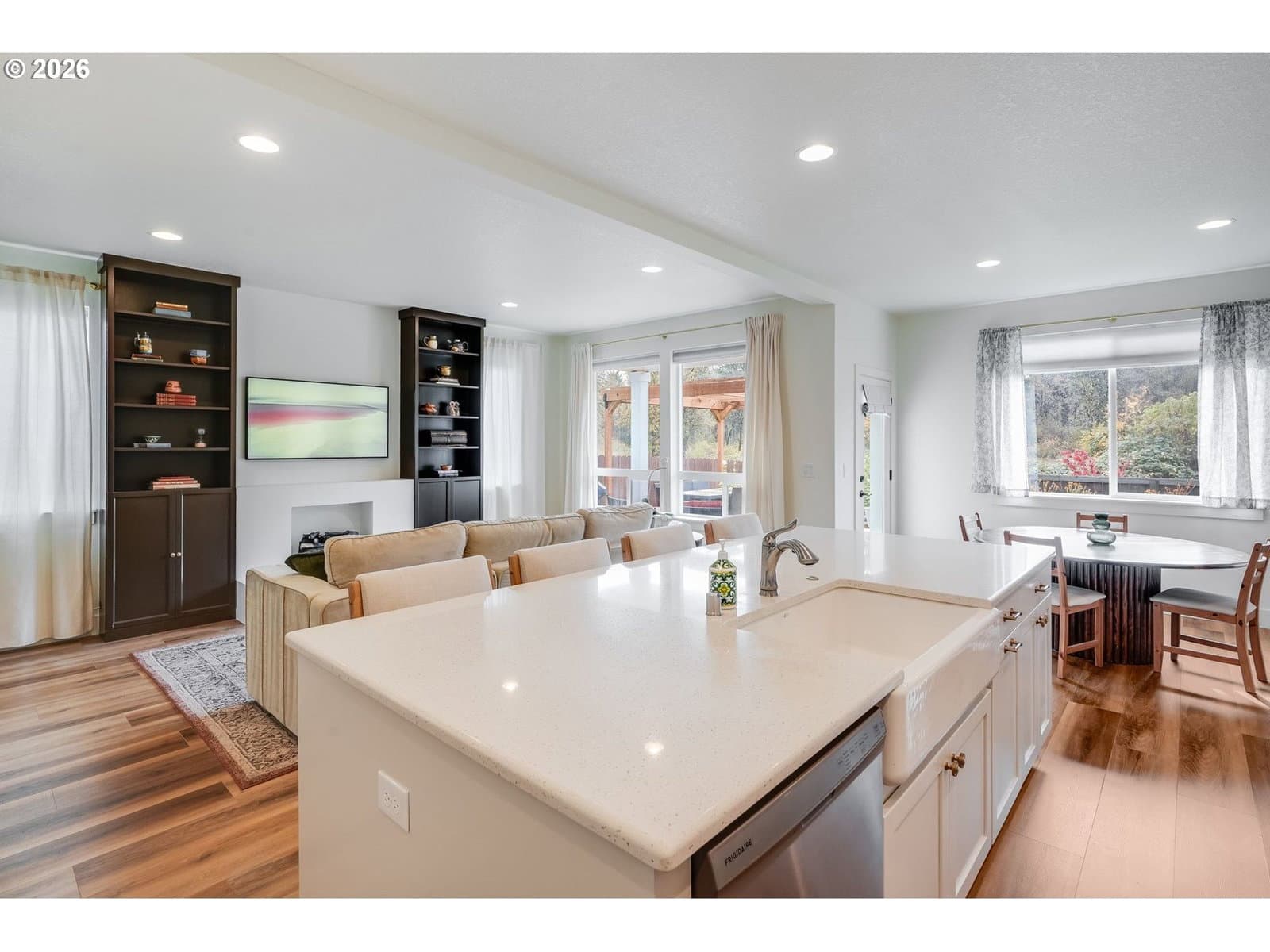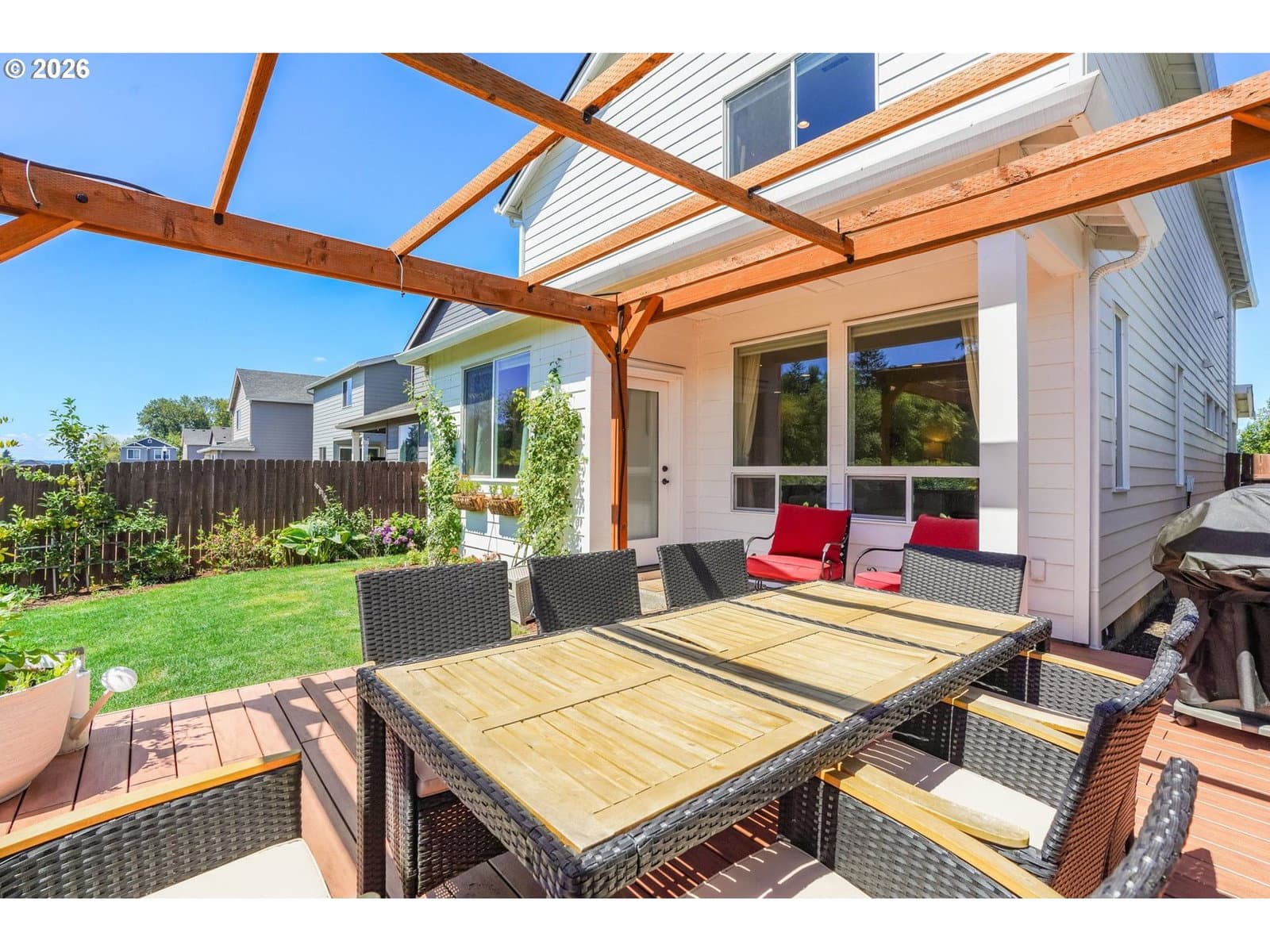 This thoughtfully designed home features an open-concept layout with 9-foot ceilings, a dedicated office on the first floor, and a stunning upgraded kitchen with freshly painted cabinets. The kitchen is a true standout with stainless steel appliances, quartz countertops, full-height cabinetry, custom paint, a large island with seating, and a oversized walk-in pantry. The inviting living area includes a modern electric fireplace and built-in storage, while the upstairs loft provides a versatile bonus space ideal for a media room, playroom, or second office. The private primary suite offers double sinks, a soaking tub, and a generous walk-in closet. Step outside to a backyard retreat designed for relaxation and gardening enthusiasts. A covered Trex deck overlooks beautifully maintained garden beds filled with roses, flowers, tomatoes, and more, along with mature trees that enhance the privacy of the no-rear-neighbor setting. Additional highlights include extra cabinetry throughout, a convenient upstairs laundry room with a deep sink, and included washer, dryer, and refrigerator — making this home truly move-in ready!