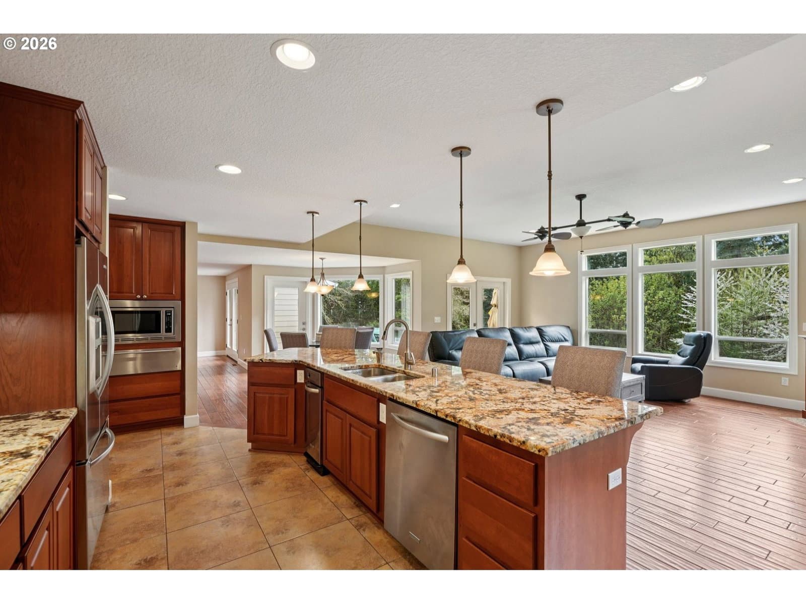 Is there a 4-bed single family home in La Center with acreage and an ADU for multigenerational living or rental potential? This gated 5.5 acre estate plus additional .65 acre tax lot includes a 4 bedroom main home and a 3 bedroom ADU with private entrance, expansive garage space, RV parking, and a well appointed kitchen built for everyday living and entertaining.4-bed single family home in La Center situated on over 6 acres across two tax lots, offering privacy, functionality, and long term versatility. The 2,672 sqft main residence features two primary suites, including one on the main level and an oversized upper level ensuite with generous closet space. The kitchen is designed for efficiency and style with double ovens, gas range, pot filler, island workspace, butlers pantry, granite counters, and durable tile flooring.The 1,320 sqft ADU spans two levels and includes 3 bedrooms plus loft and 1.5 baths with a private entrance, ideal for extended living arrangements or additional household space. Exterior highlights include gated entry, fenced, covered patio, two septic systems, water filtration system, water softener, and a 4 car detached garage with RV parking.This La Center property offers acreage living with room to grow, gather, and create long term value. Schedule your tour today.