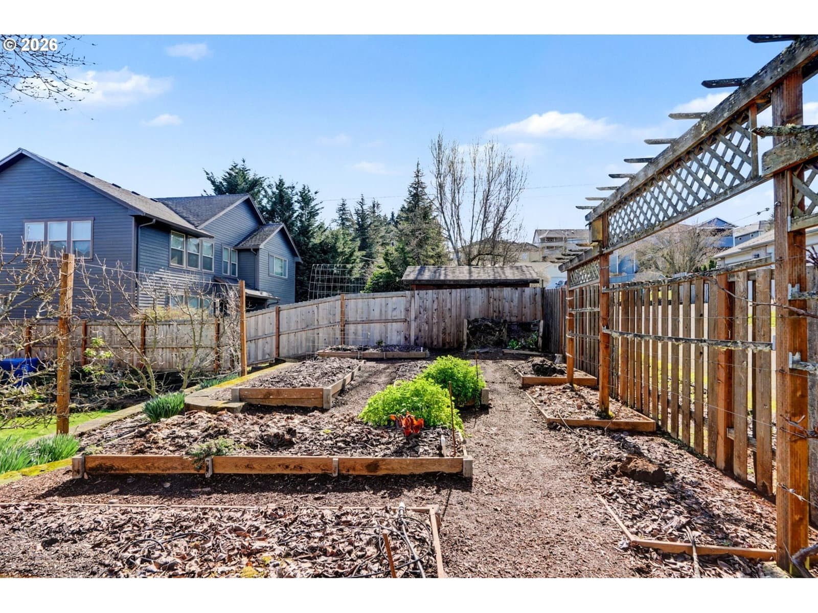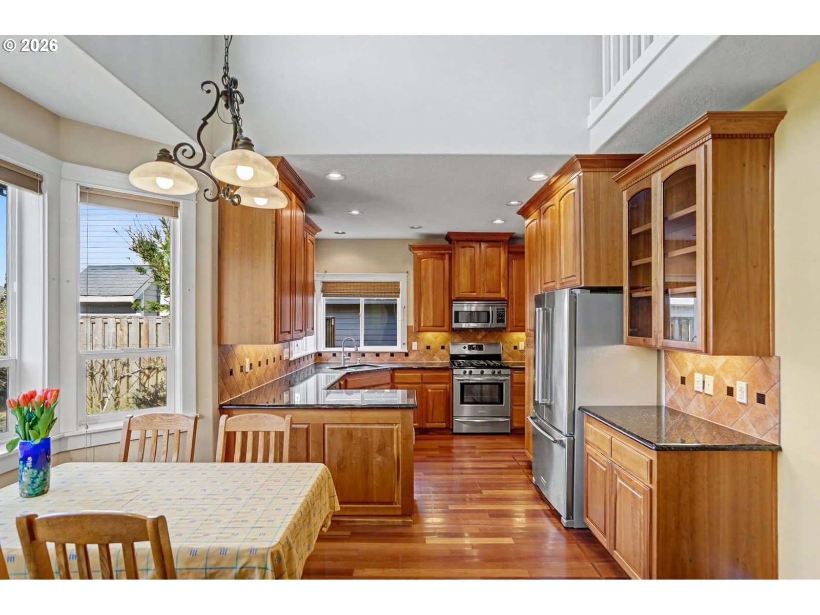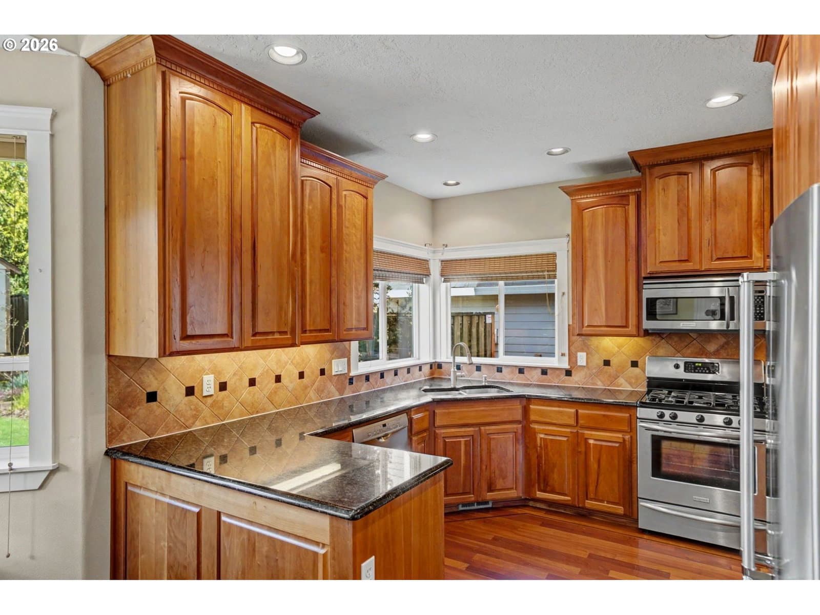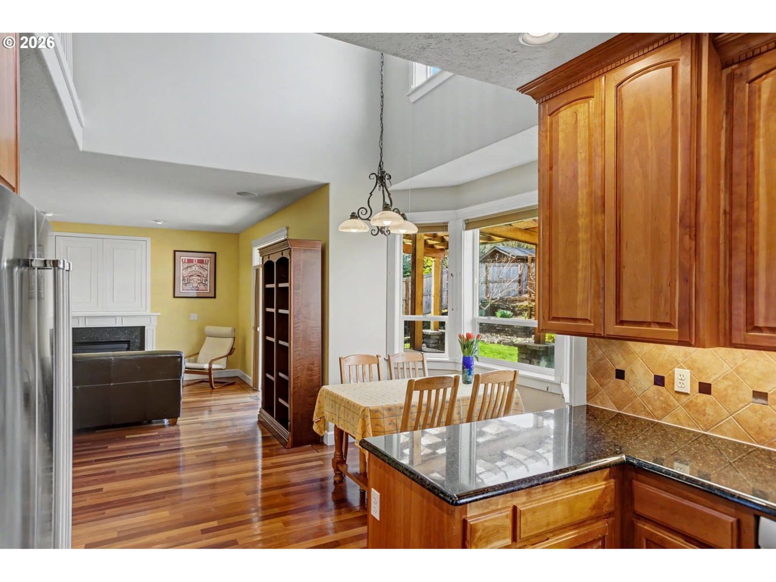 Well-maintained and very energy efficient 4 bed, 2.5 bath home offering 2,627 SF on a quiet cul-de-sac. Flexible layout includes a main floor bedroom, formal living & dining rooms, and both living and family rooms, each with gas fireplaces. Light-filled nook off the gourmet kitchen featuring granite countertops, cherry cabinetry, stainless Frigidaire appliances, and a walk-in pantry. Cherry cabinets continue throughout the bathrooms and laundry room for a cohesive, high-quality finish. Hardwood flooring on the main level. Spacious bonus room provides ideal space for media, office, or playroom. Primary suite features a walk-in closet, jetted tub, walk-in shower, and vaulted sitting/retreat area. Dual heating and cooling systems provide efficient comfort year-round. Central vacuum and central speakers included. The backyard is a true highlight with seven raised garden beds, fruit trees, grapevines, and abundant flowering plants, all within a fully fenced and beautifully landscaped setting. Covered patio, sprinklers, garden shed, and plenty of space to relax or entertain.