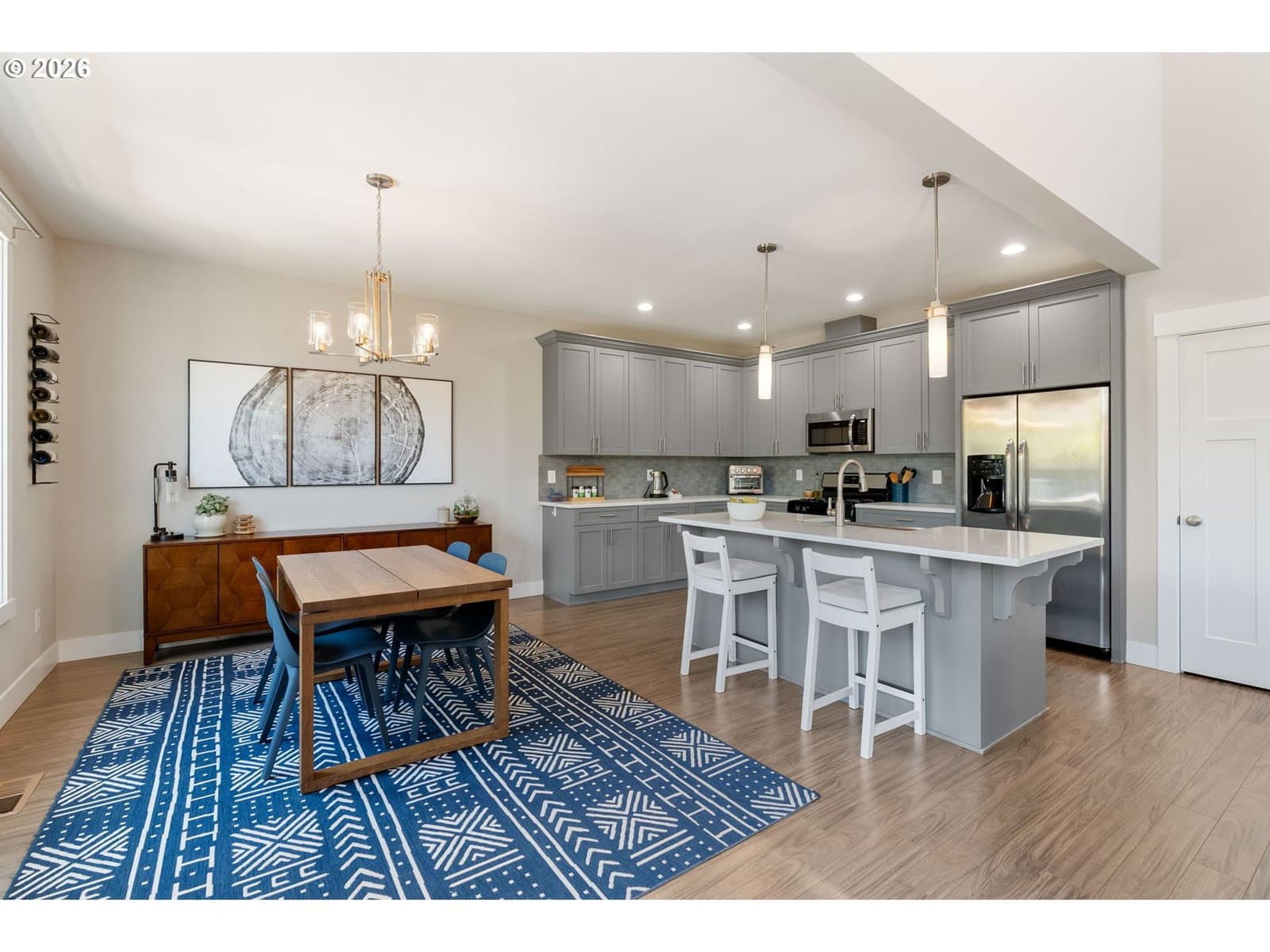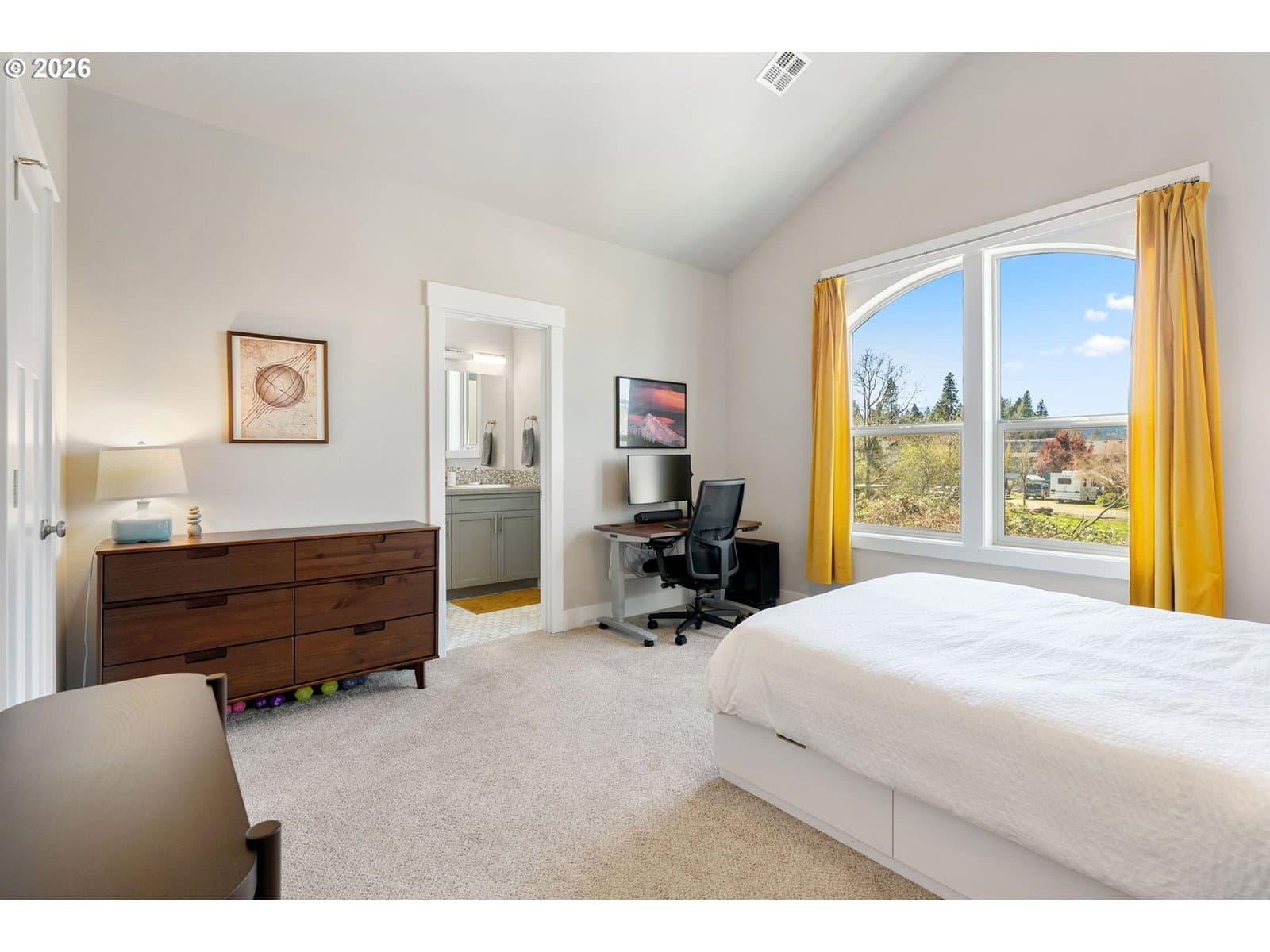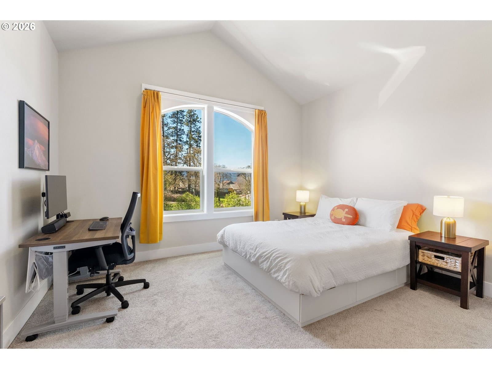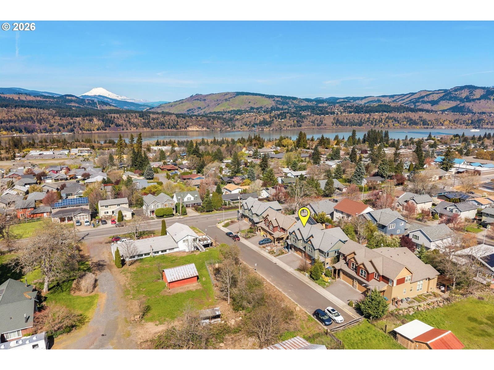 Thoughtfully designed and impeccably cared for, this light-filled attached home offers a comfortable blend of style and livability. Dramatic ceilings and expansive windows bring in natural light throughout the home, with a vaulted living room that opens to the dining room and kitchen. The adjacent loft, open to the living room below, includes a small nook for a desk or display, while the two-story entry with stairwell windows adds another layer of brightness as you move through the home. Anchoring the main living area, the kitchen features a generous island, stainless steel apron-front sink, quartz countertops, gas range, and stainless steel appliances. There is ample cabinet and counter space throughout, along with a pantry for additional storage. From the kitchen, there is an easy flow to the outdoor spaces, extending the living area beyond the interior. Set apart from the main living areas, the primary suite features vaulted ceilings, a walk-in closet, and a private en-suite bathroom with quality tile finishes and quartz countertops. The guest suite offers the same level of comfort, with vaulted ceilings and a well-appointed en-suite bathroom. The front yard has been recently professionally landscaped with low-maintenance plantings, while the backyard offers a fully usable outdoor space with natural boulders and room to relax or entertain. A covered patio with retractable awning, hot tub, outdoor shower, gas fire pit, and grill hookup add to its functionality. Additional features include a 2-car garage with driveway parking, territorial views of the surrounding Gorge hills, Mt Adams view from the backyard and Mt Hood view from the front. Located just minutes from the Westside Trail, schools, parks, shopping, and downtown Hood River. This home works equally well as a full-time residence or a low-maintenance retreat.