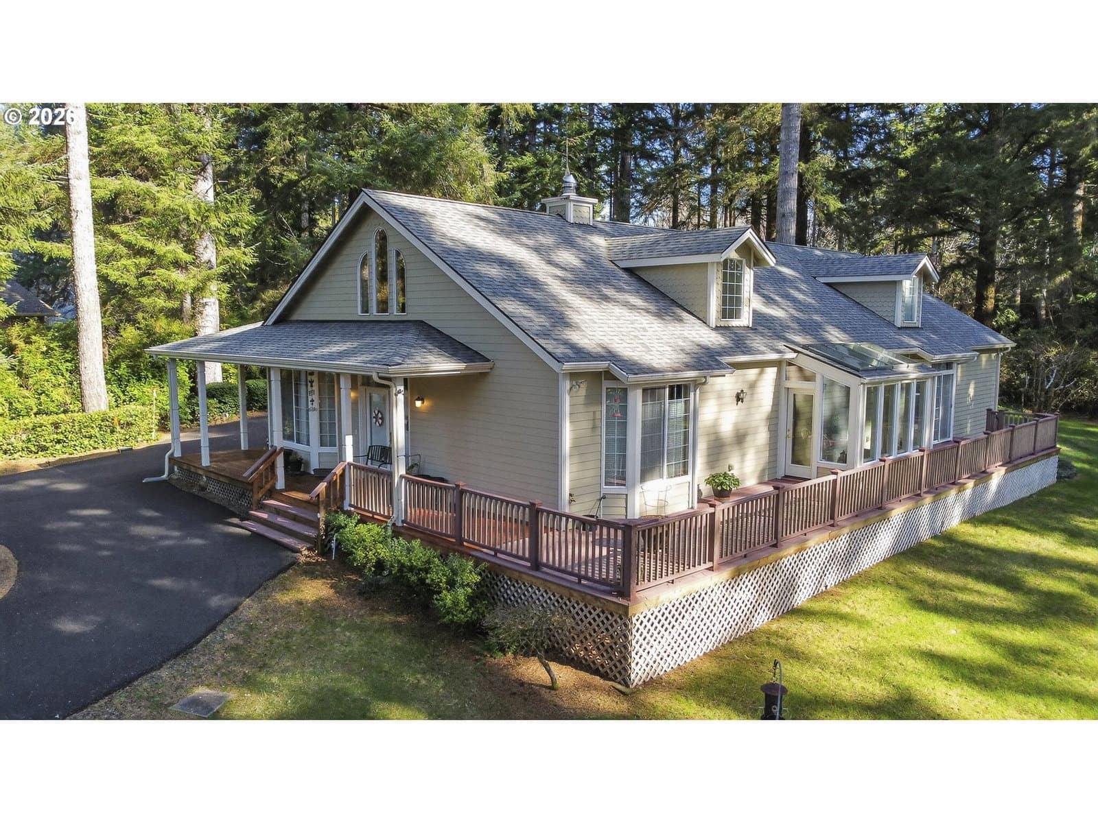 Spacious and well designed, this 3 bedroom, 2 bathroom home offers 2,245sqft of living space on a generous 0.72-acre lot. High vaulted ceilings throughout create an open, airy feel, enhanced by elegant french windows that fill the home with natural light. The inviting living room features a cozy pellet stove and a charming bay window, making it the perfect place to relax. The kitchen is thoughtfully equipped with a free-standing refrigerator, built-in oven, cooktop, built-in dishwasher, microwave, trash compactor, pantry, and ample counter space. An eating nook overlooks the expansive, beautifully landscaped yard, ideal for everyday meals or morning coffee. The primary suite serves as a private retreat with a walk-in closet and an attached bathroom featuring double sinks, a walk-in dual-head shower, and a jetted tub. The functional laundry room includes built-in storage and a utility sink for added convenience. Enjoy outdoor living from the wraparound porch with both covered and open areas. An attached oversized 2-car garage, detached 2-car garage, circular driveway, and abundant extra parking complete this exceptional property. You don't want to miss this beautiful retreat!
