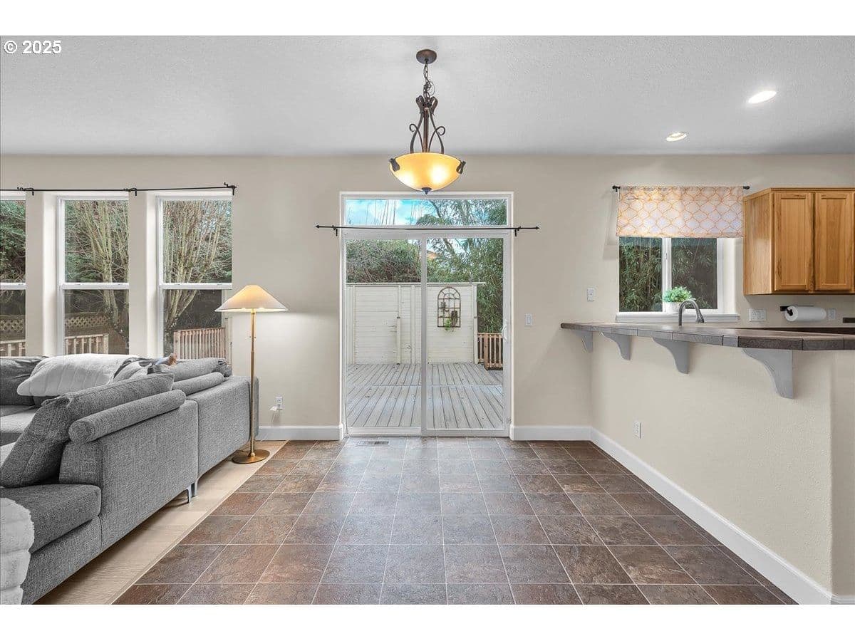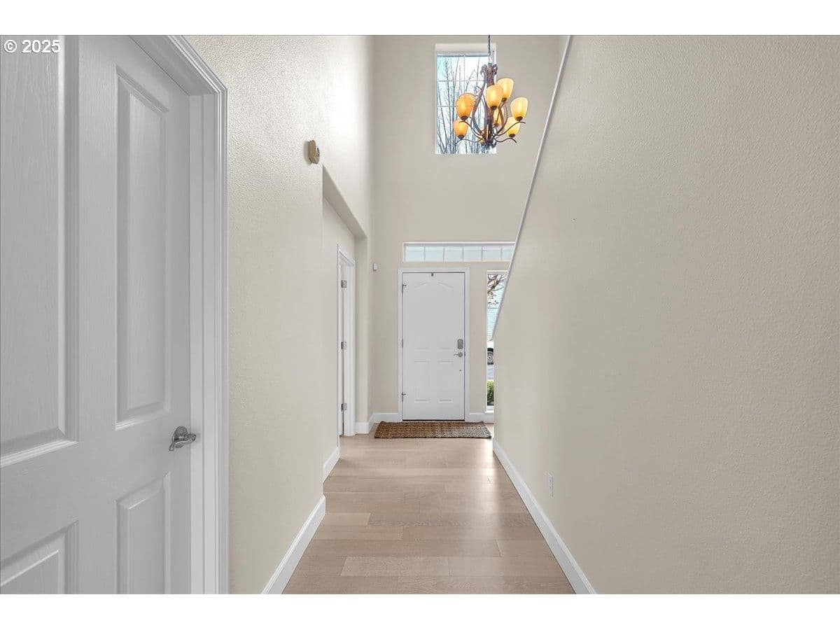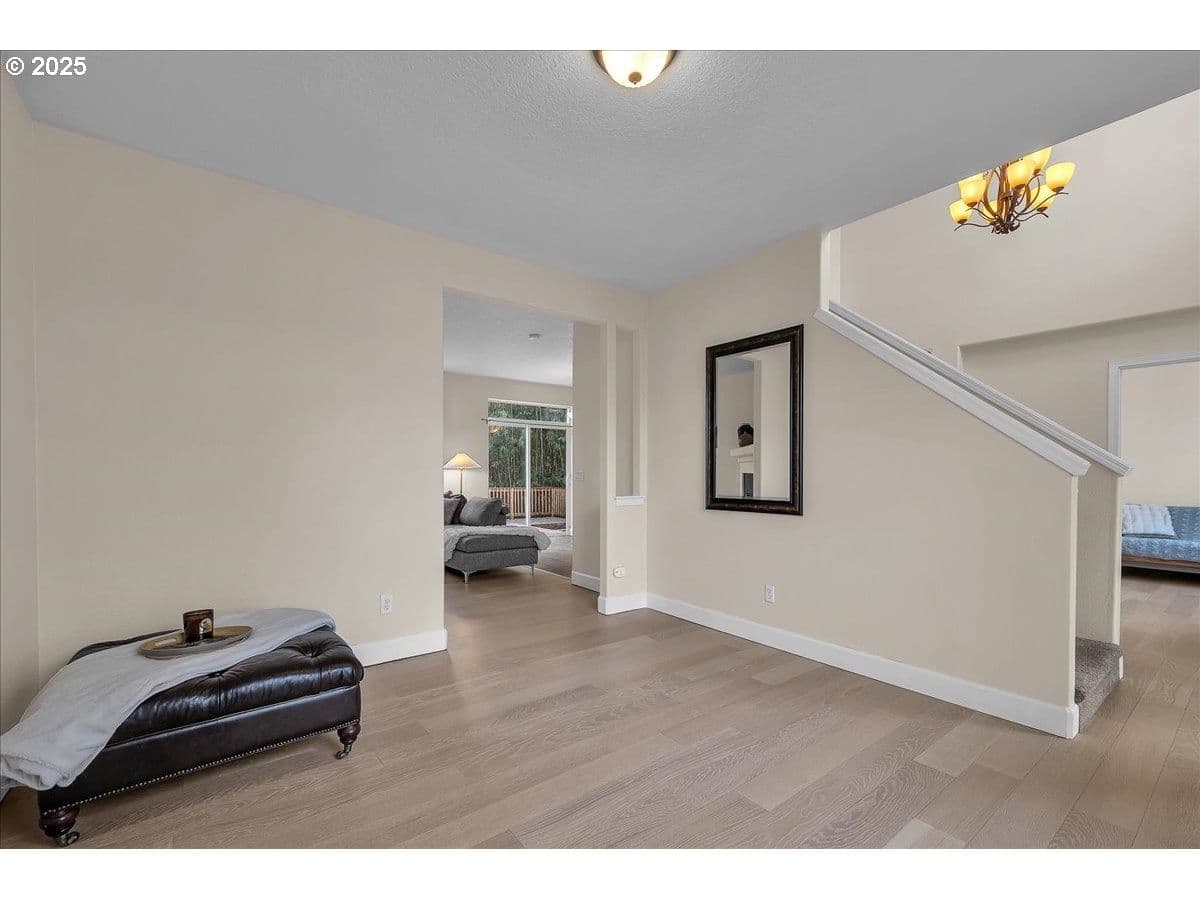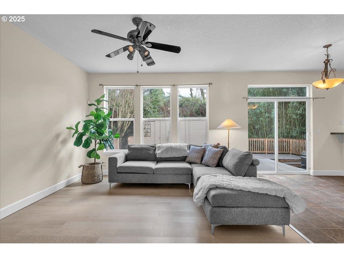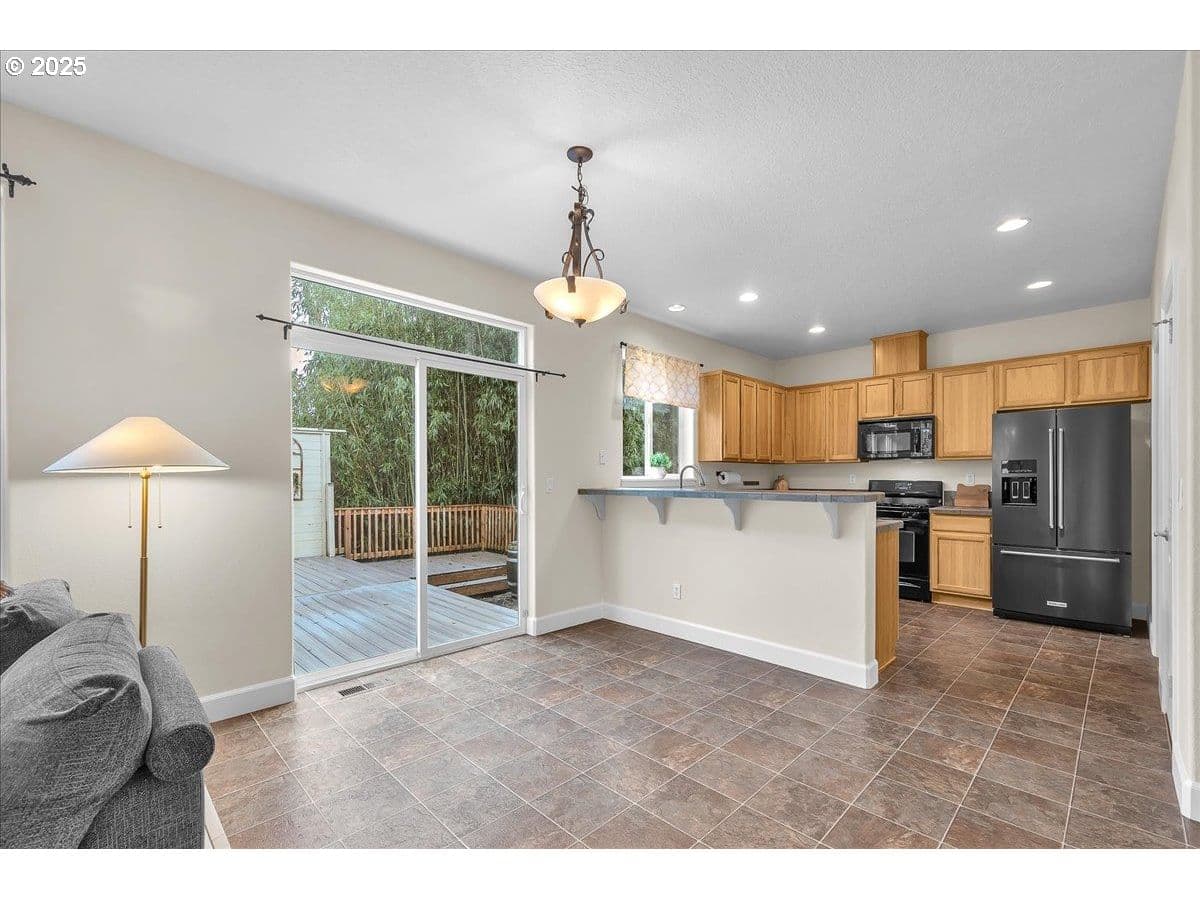 This inviting home offers a comfortable, versatile floor plan with effortless flow between the kitchen, dining area and two separate living spaces, perfect for entertaining or relaxed get-togethers. The spacious kitchen features tile countertops, an eating bar and updated appliances, all included, and opens to the adjoining family room with a cozy fireplace and ceiling fan. The main floor also includes a flexible den, ideal for a home office, study area or creative space, along with a convenient utility room featuring an updated washer and dryer. Upstairs, the bedrooms are thoughtfully grouped together. The primary suite showcases a vaulted ceiling that enhances the sense of openness, a generous walk-in closet, and a well-appointed bath with double sinks and a soaking tub. Newer carpet and laminate flooring, paired with freshly updated interior paint, gives the home a crisp, refreshed feel throughout, and the large windows bring in beautiful light. Outdoors, the fully fenced backyard offers a composite deck, tool shed, mature landscaping and seasonal enjoyment from raspberries, blueberries and rhubarb. The open farmland beyond offers a peaceful backdrop and a sense of privacy that is often not found in the city. An oversized garage provides excellent storage, including attic space, and the long driveway plus the separate carport offer ample parking options. Located near schools and along a popular annual holiday parade route, this home blends comfort, flexibility and a welcoming setting. No HOA here! The easy commute to the Metro area makes Scappoose a high-demand location to call home!