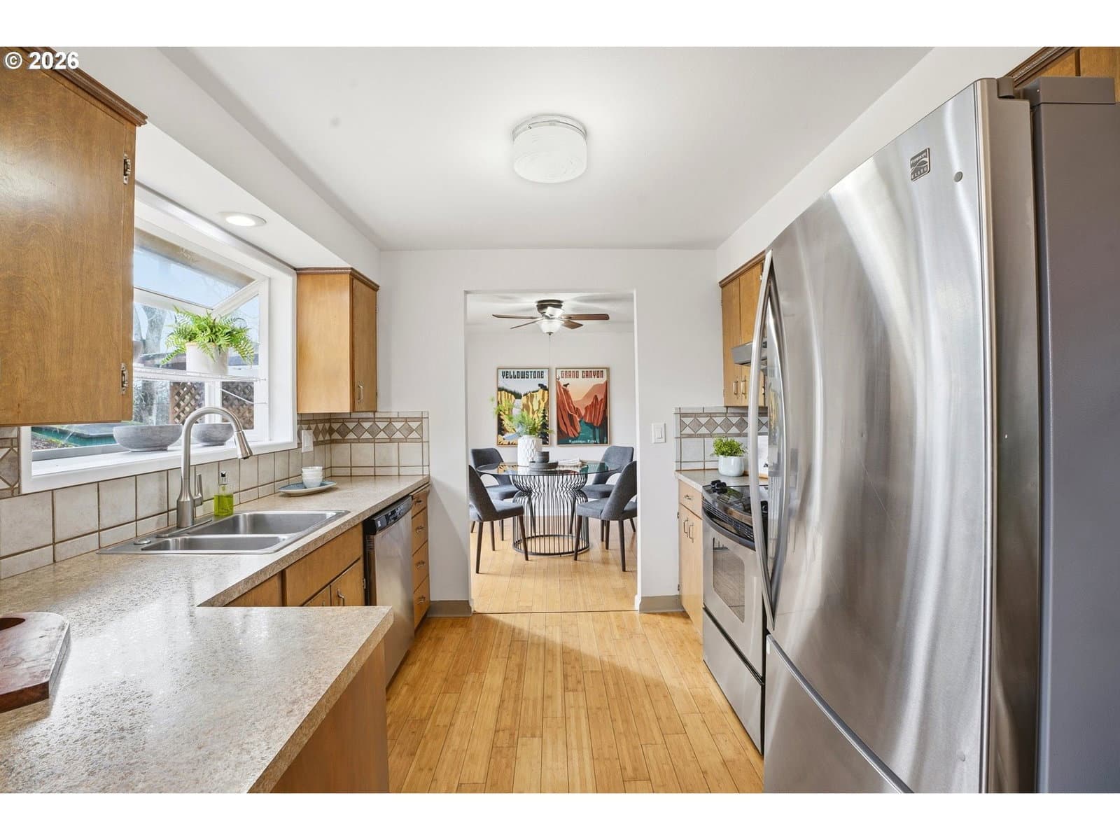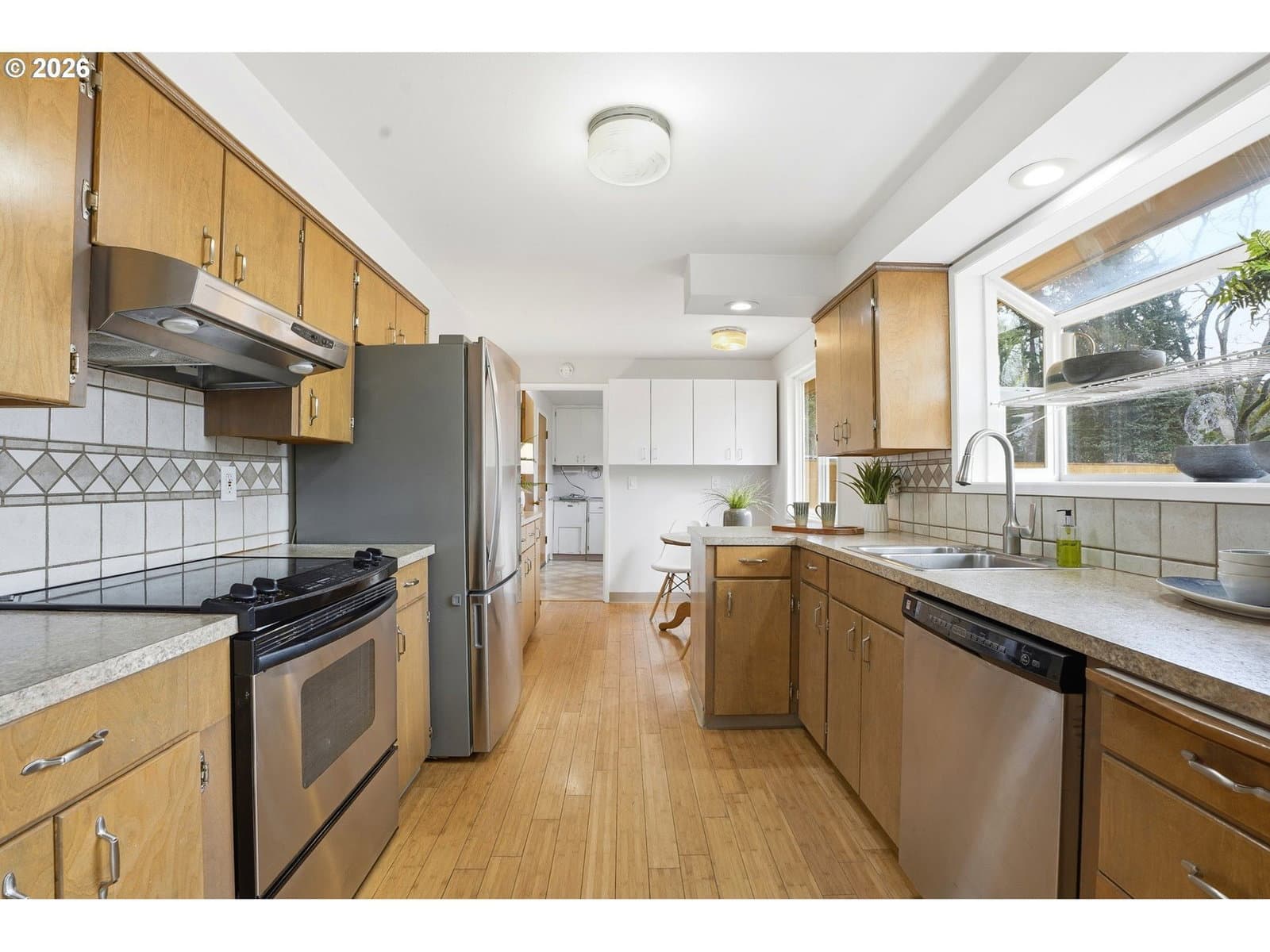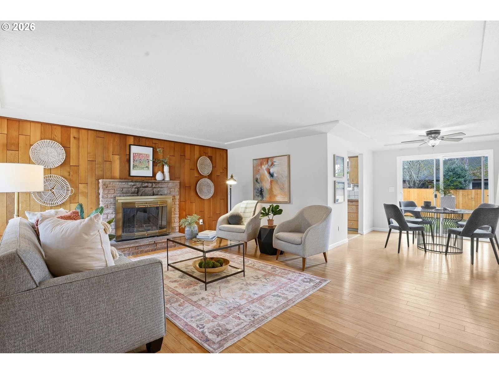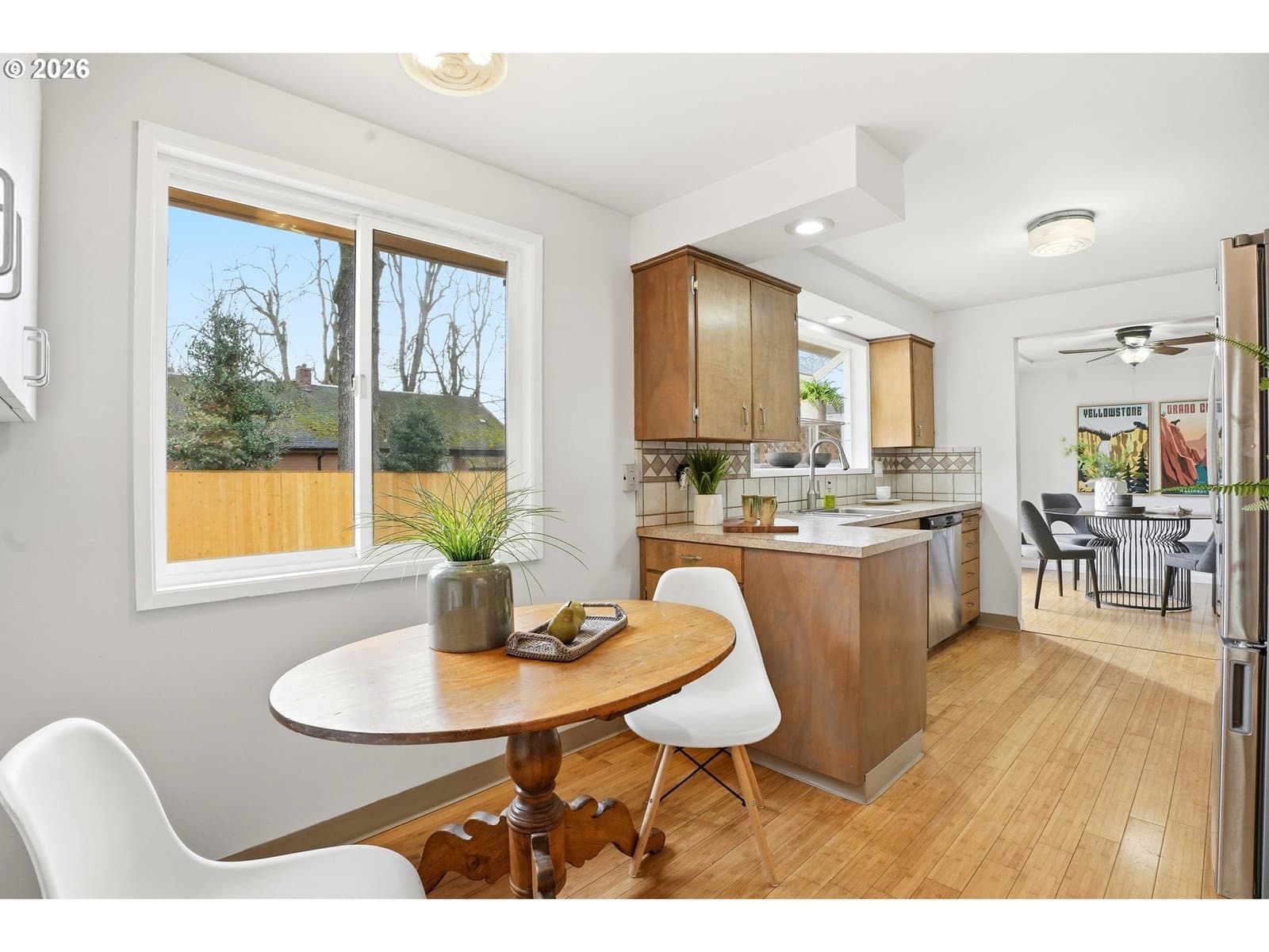 Well-maintained home with a functional layout and modern updates throughout. The living room features a wood-burning fireplace and bamboo floors that continue through the home. Fresh interior paint and double-pane vinyl windows provide a bright, clean feel with ample natural light.The kitchen includes stainless steel appliances, a garden window over the sink, and a dining nook just off the kitchen. The primary bedroom has sliding doors to one of the backyard decks with a built-in hot tub. Full bathroom includes a tub and tiled shower, plus an additional half bath is located off the laundry room.The brand-new backyard deck features a built-in grill, and the fully fenced yard is ideal for pets. Additional highlights include an attached two-car garage and an incredibly convenient location just 0.3 miles from McLoughlin Blvd with easy access to restaurants, bars, grocery stores, and big-box retailers.